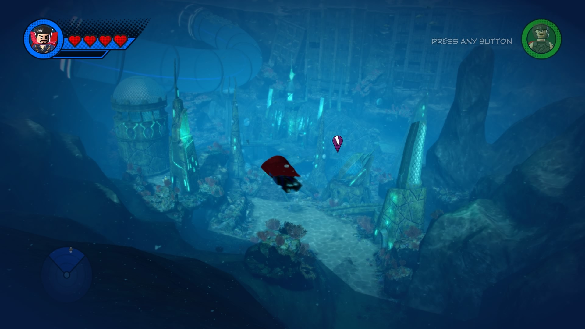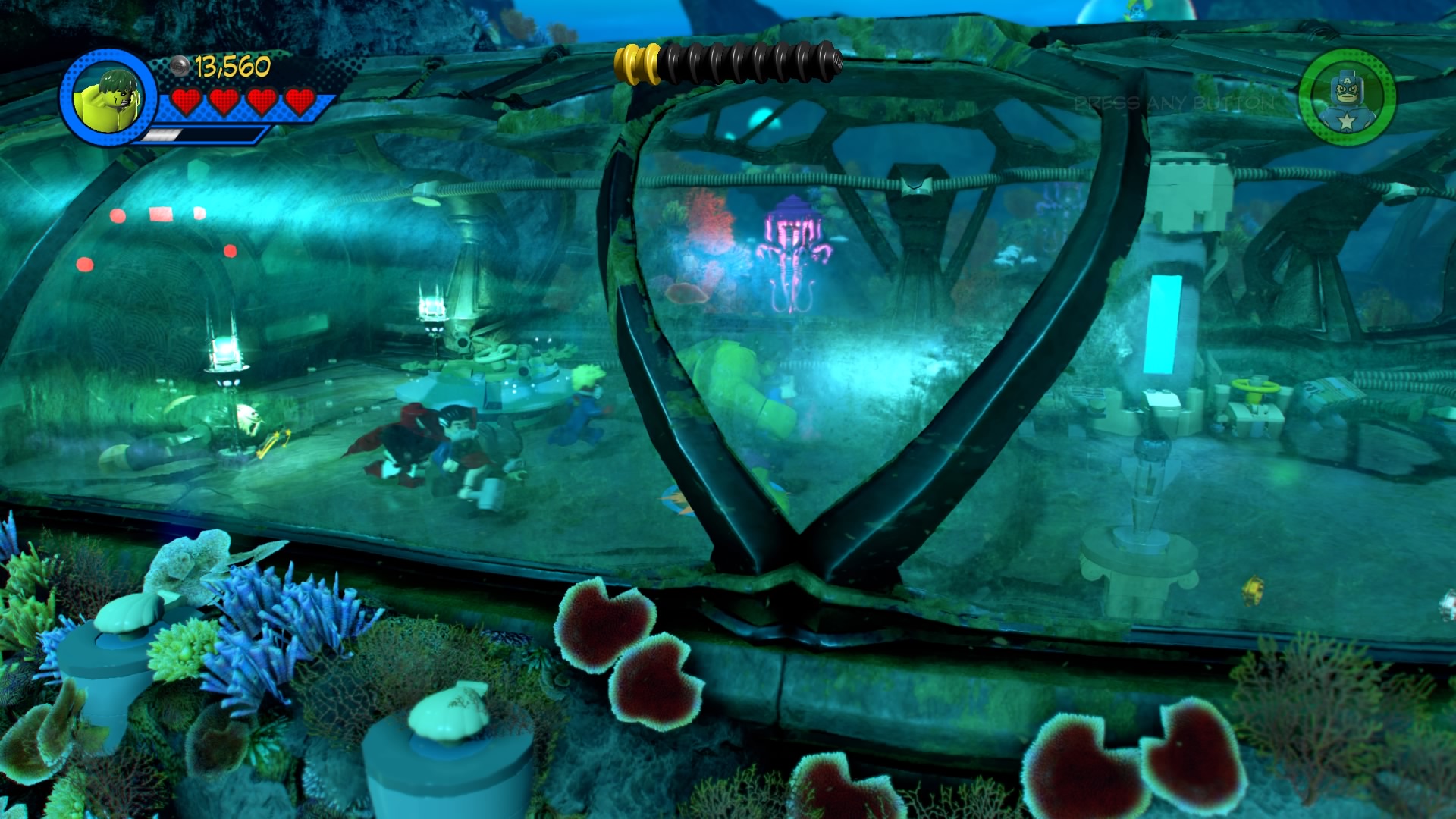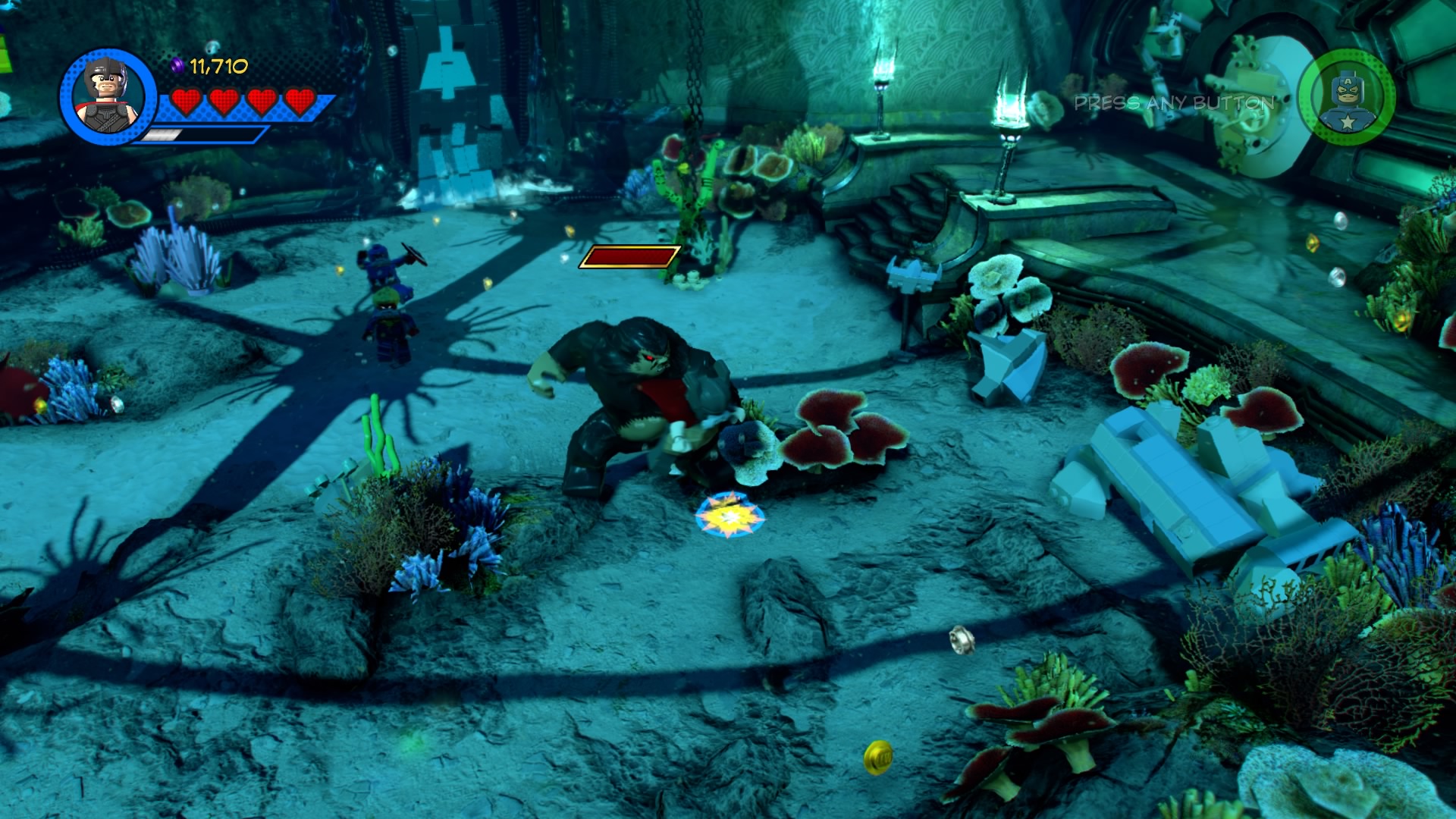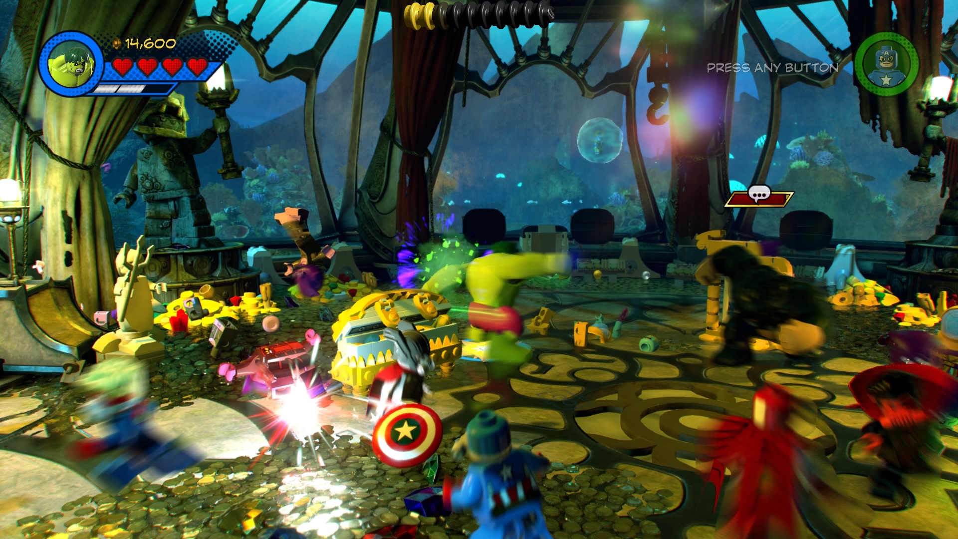 Swap to Doctor Strange and use his magic on the LEGO valve near the door. Move it to the airlock then smash the cracked green LEGO wall with Hulk, naturally. The hall with fill with water, but you can still chase Attuma! Go through the giant fish skull’s jaws and swim up in the cave filled with jellyfish. Attuma’s throne room is at the top, and he’s ready for a big brawl.