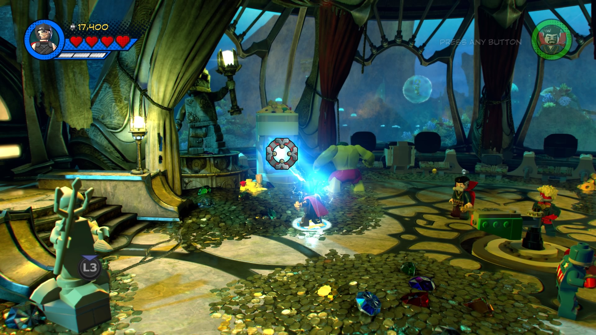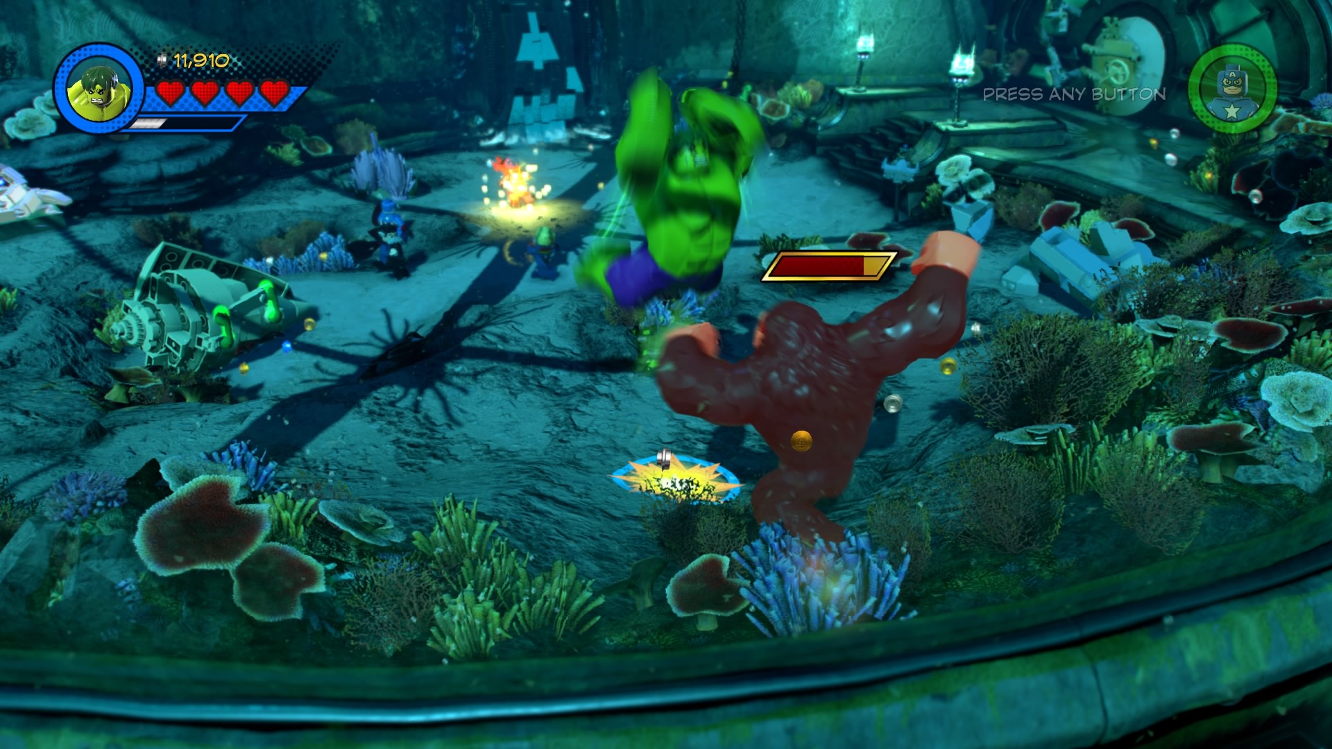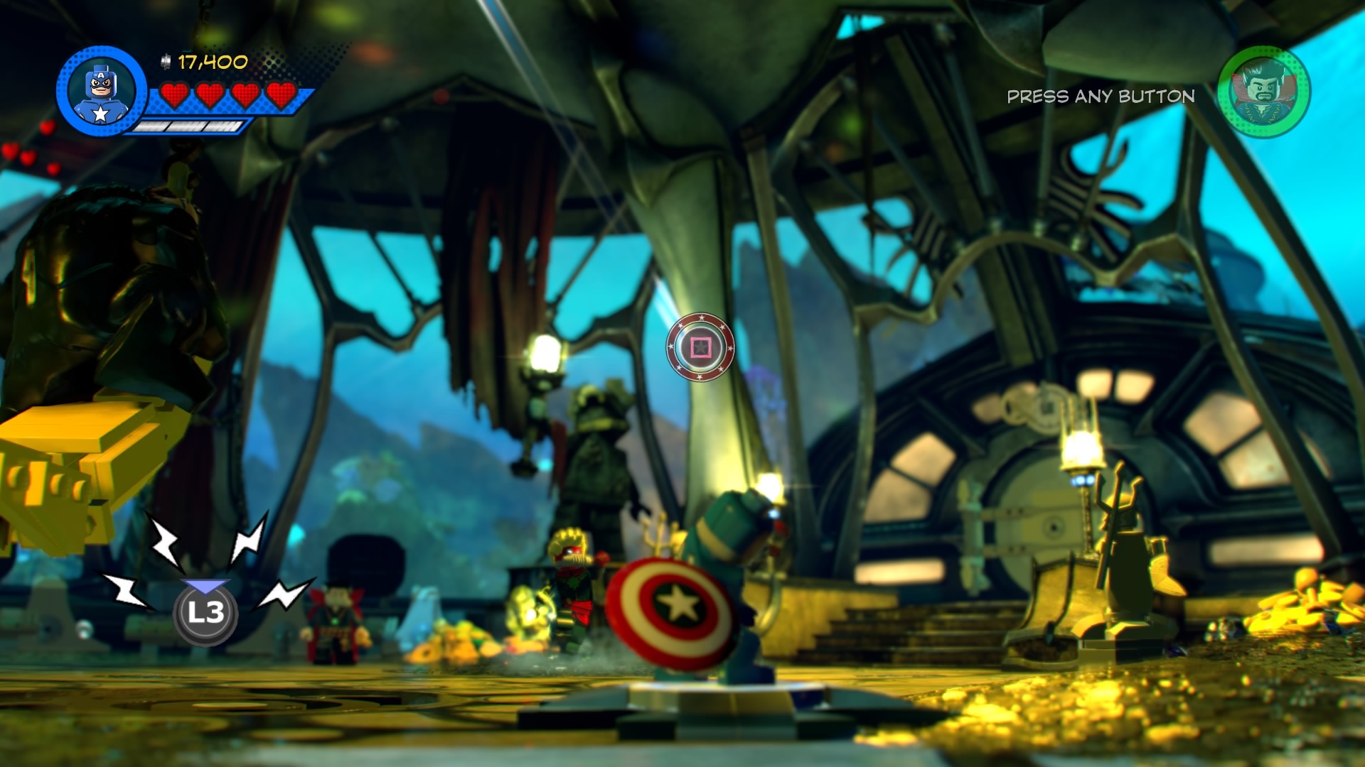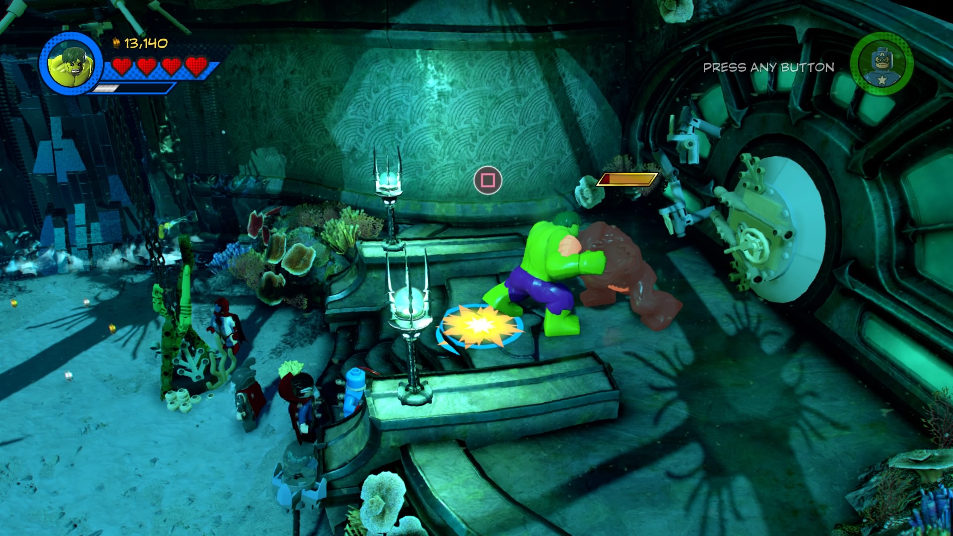 In the third room of the level, the Yeti will return! Beat him up until he’s stunned with Hulk, then swap to your other heroes and smash all the LEGO instruments / objects in the center of the underwater room.
