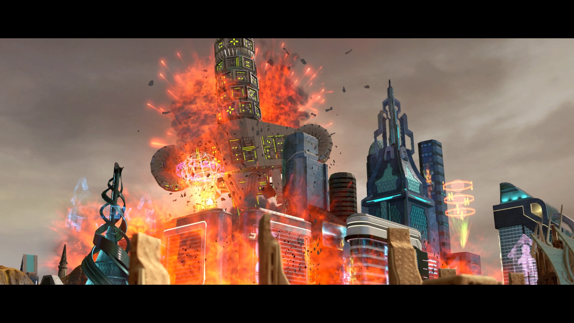 the Free Roam city. Fly to the top of the tower, but Kang locks the area down! Start by destroying the drones – there are three waves. The waypoint marker will point at each of the drone bays – go to each one (there are six total) and smash the LEGO object inside to lower the barrier to the final level.