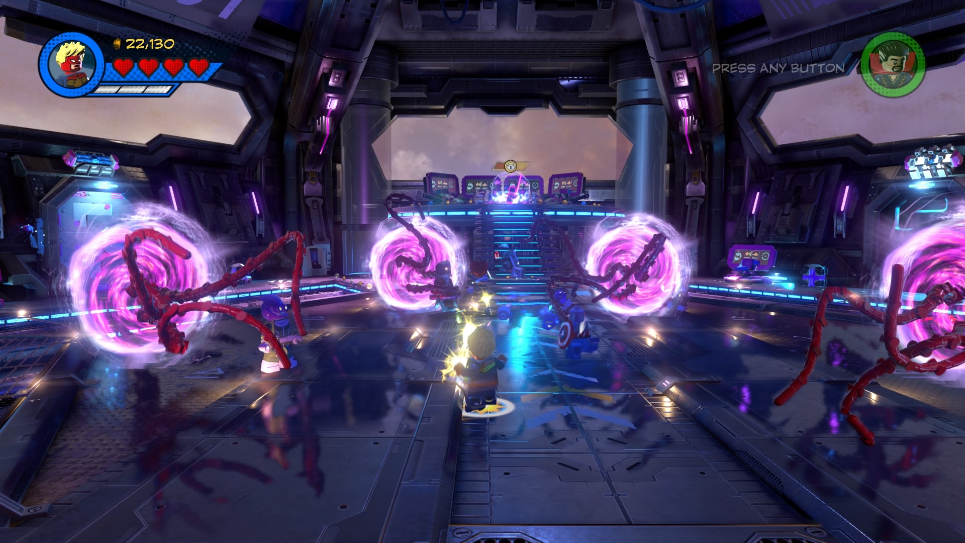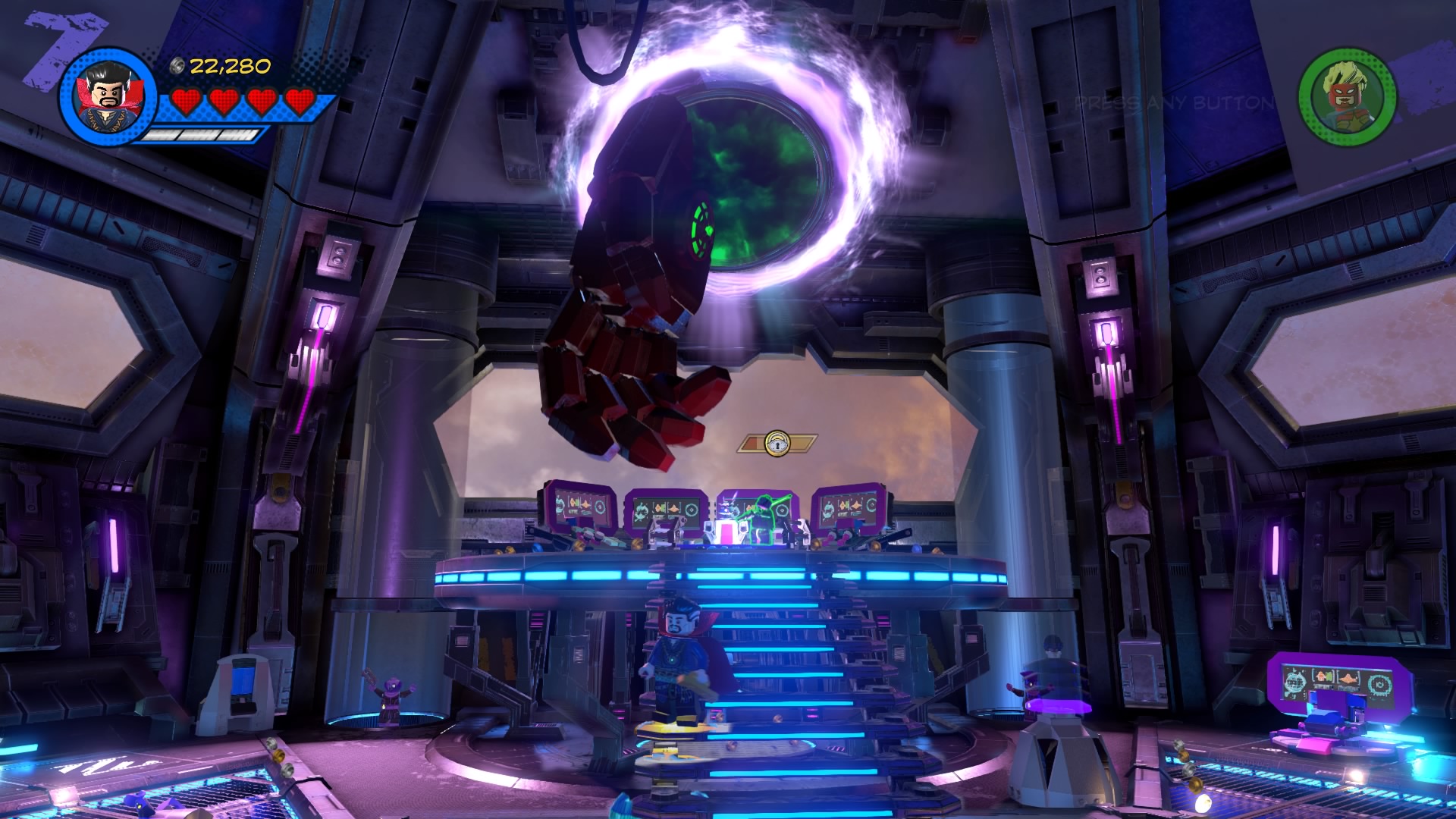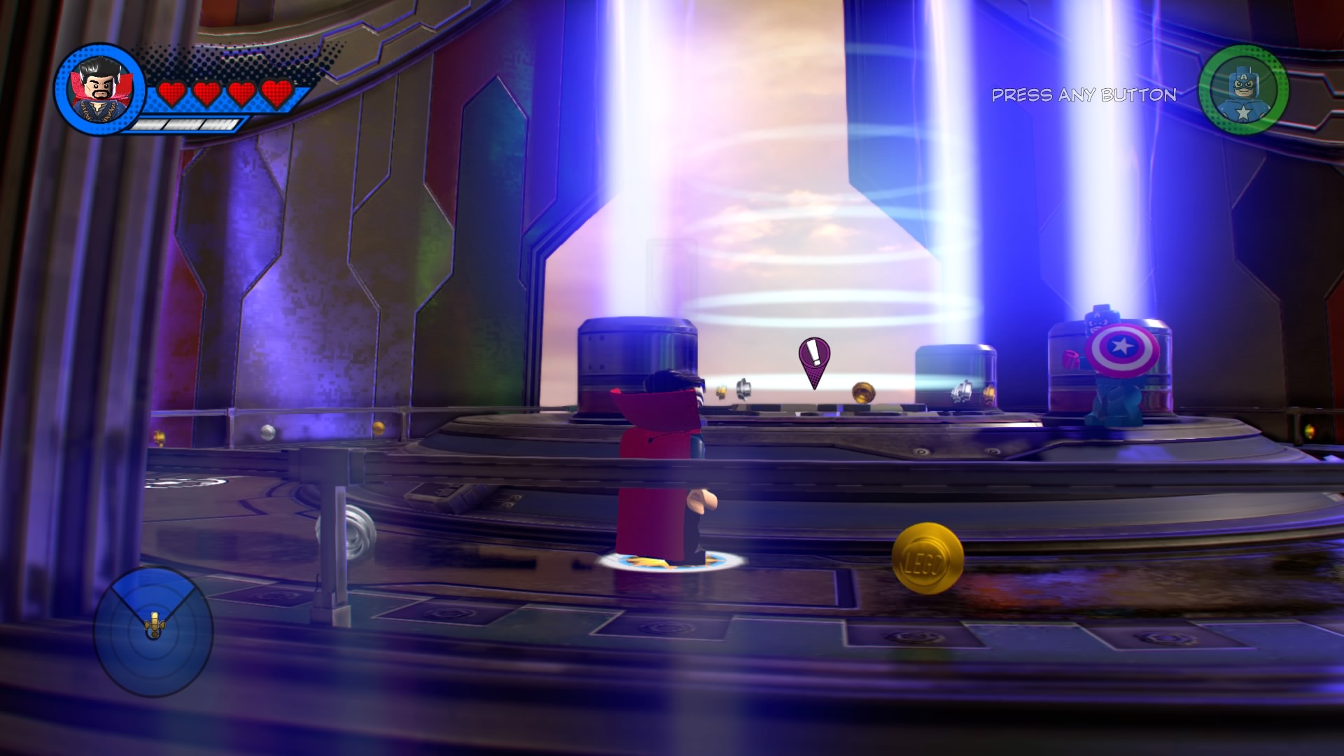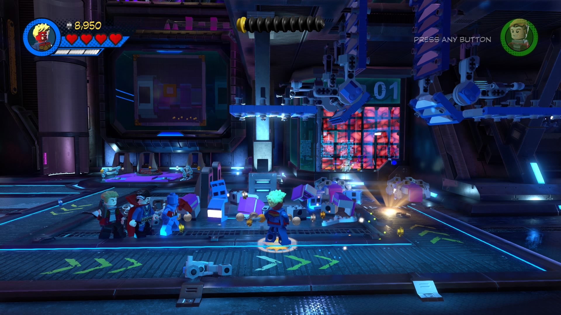 Inside Kang’s Citadel, you’ll have four heroes to help – Captain Marvel, Captain America, Doctor Strange, and Star-Lord. To get to the second floor, move right and smash all the LEGO objects beneath the raised-up wall-jump panels. Smash until a hopping pile of LEGO bricks glows.
