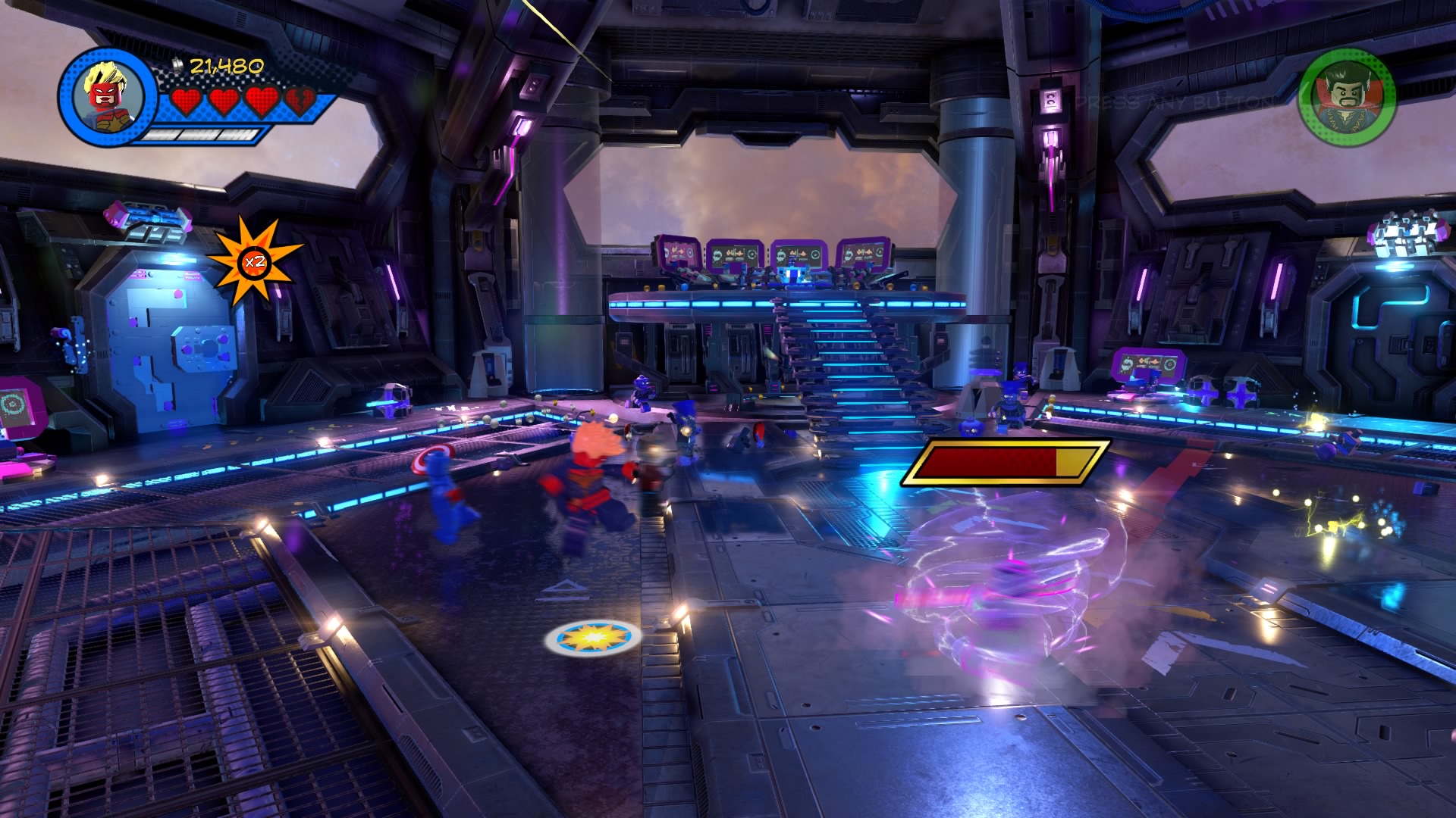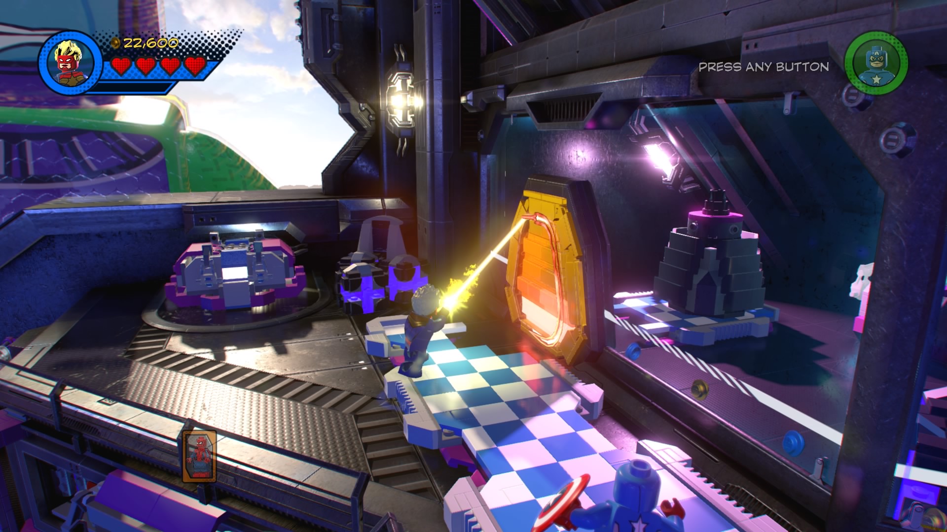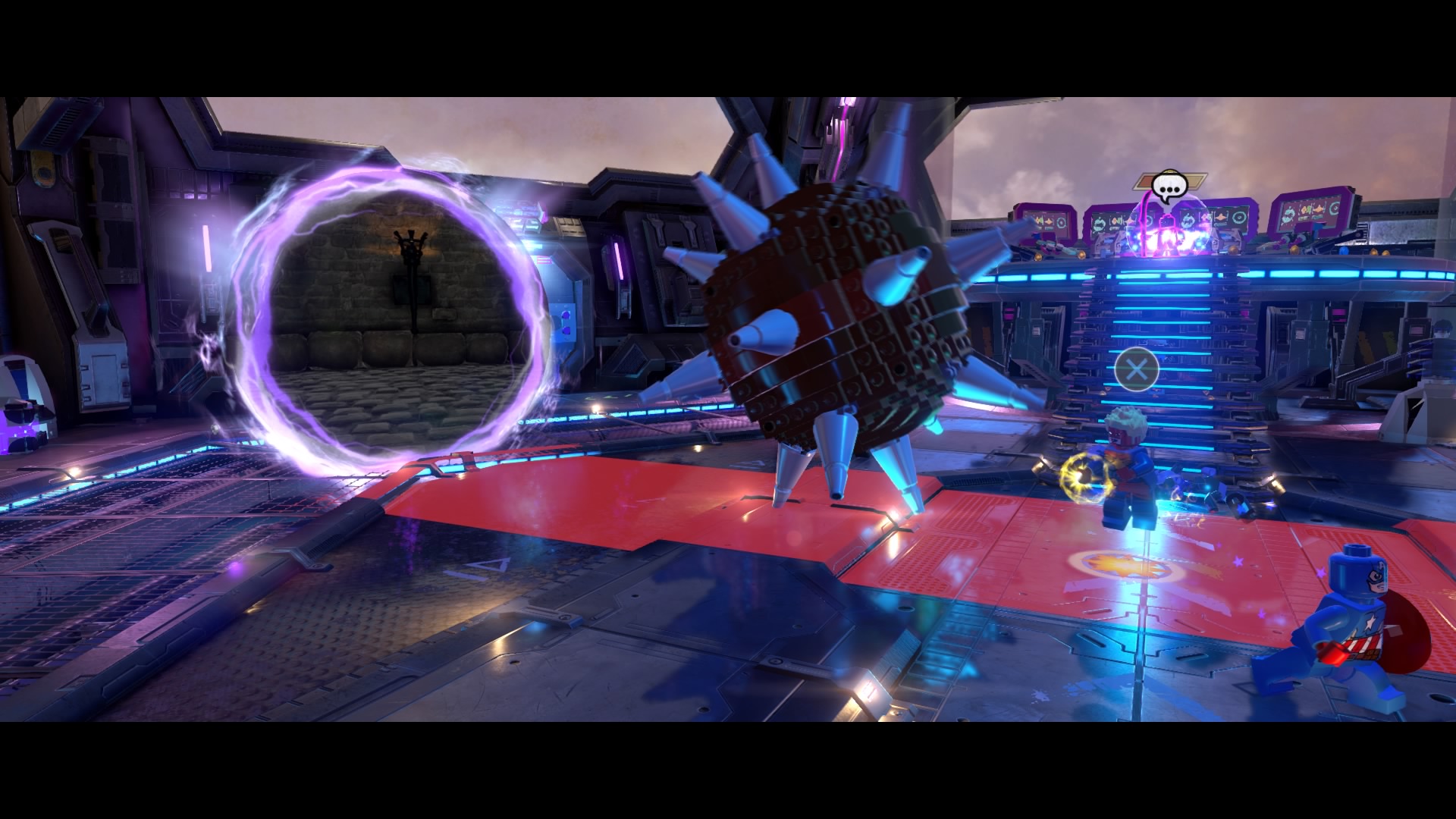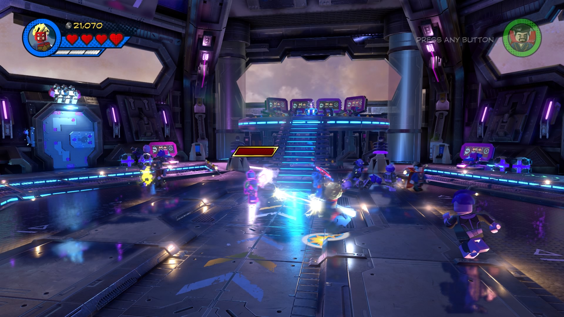 Inside Kang’s Citadel, you’ll have four heroes to help – Captain Marvel, Captain America, Doctor Strange, and Star-Lord. To get to the second floor, move right and smash all the LEGO objects beneath the raised-up wall-jump panels. Smash until a hopping pile of LEGO bricks glows.