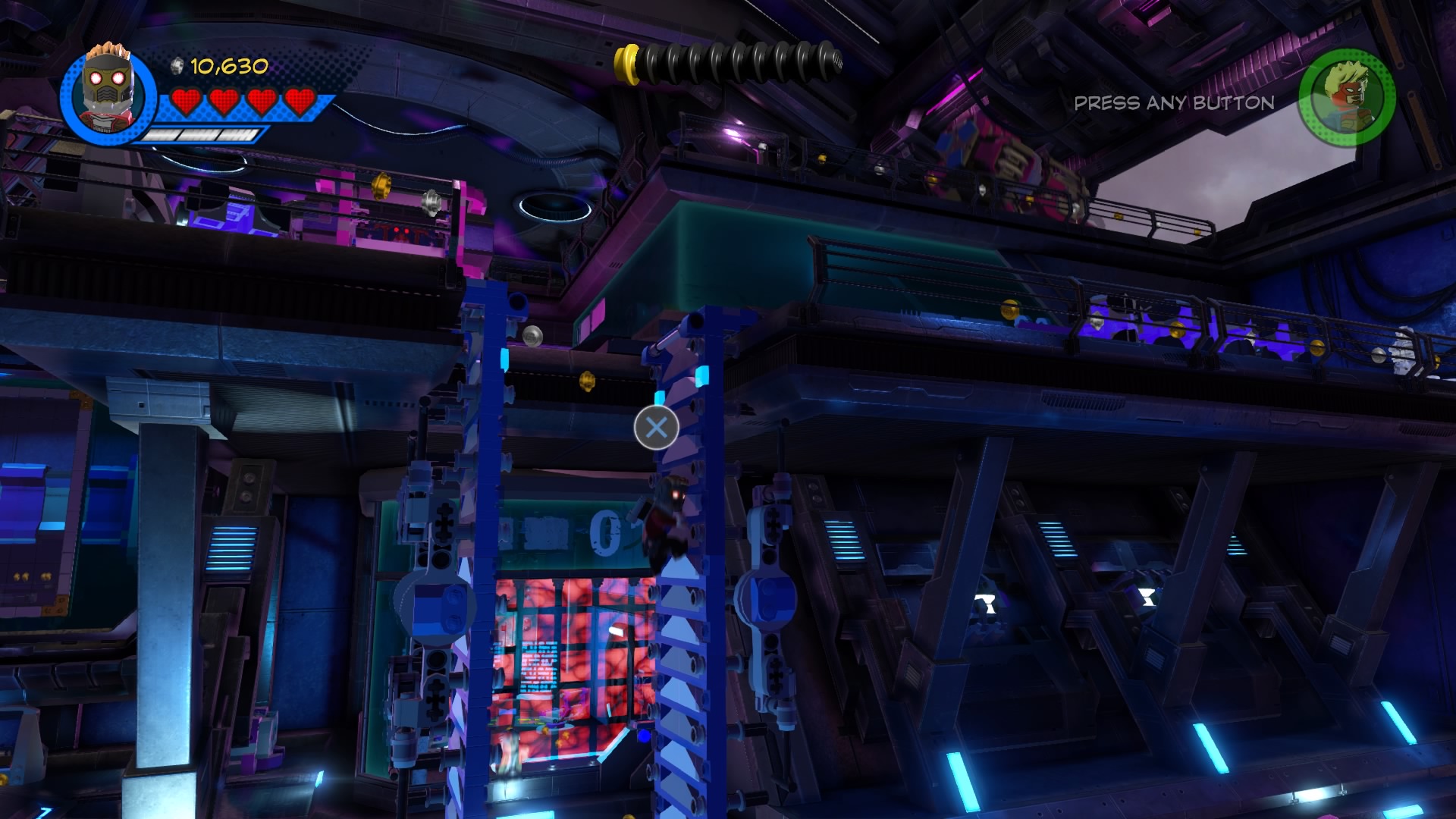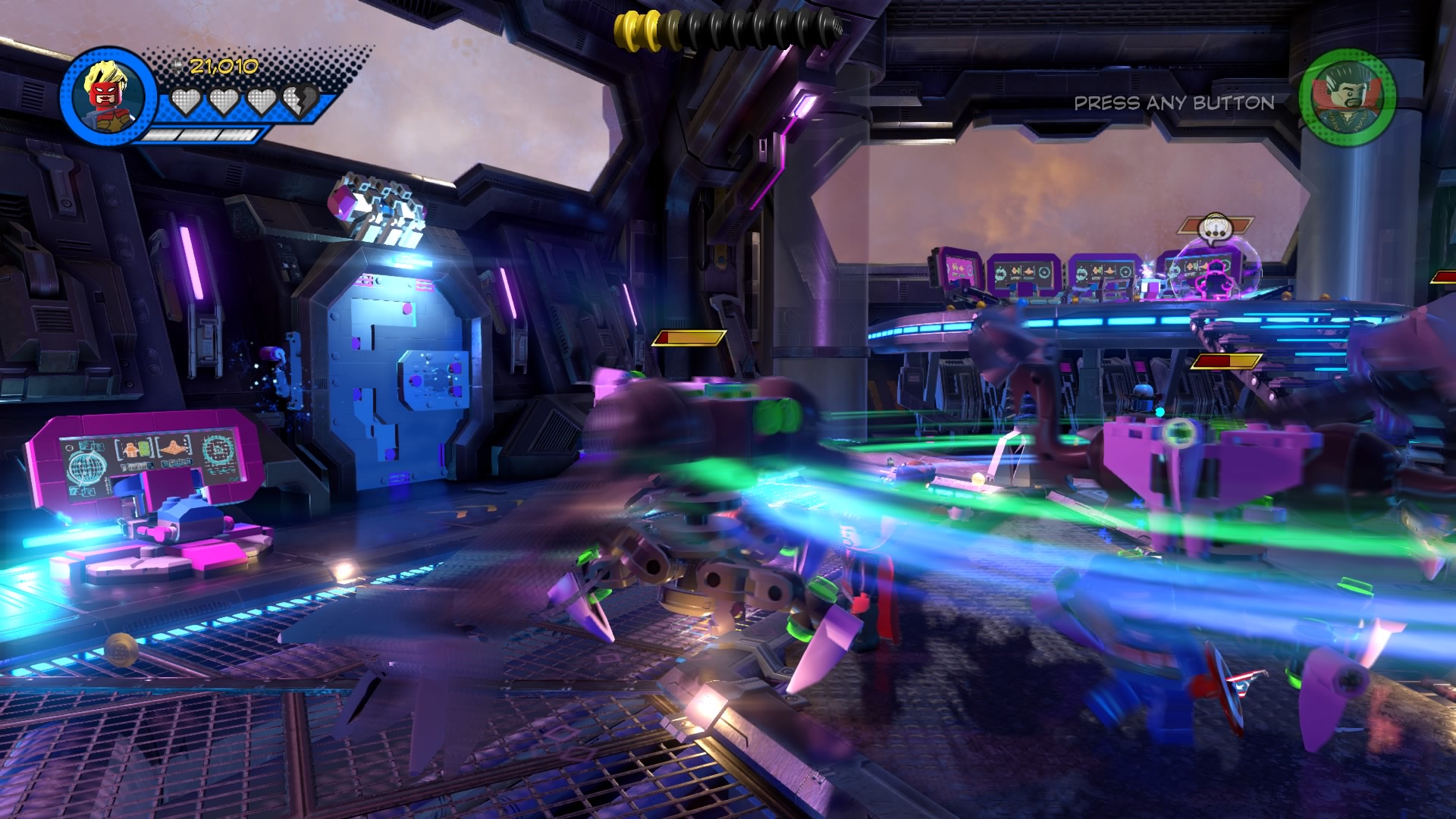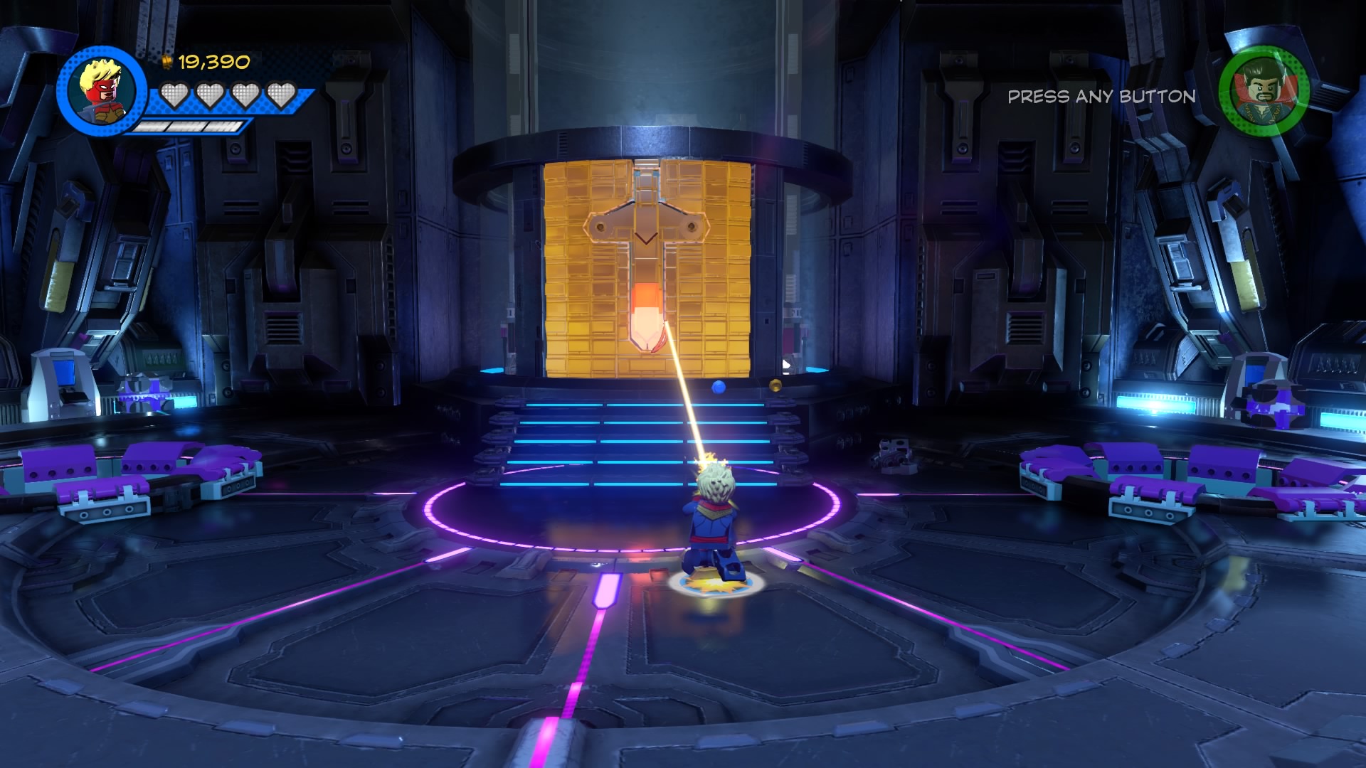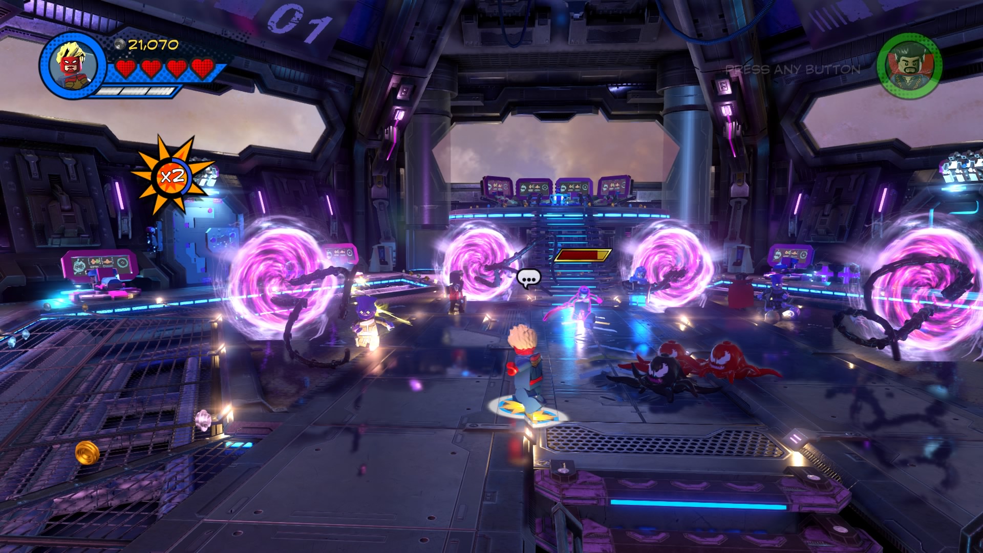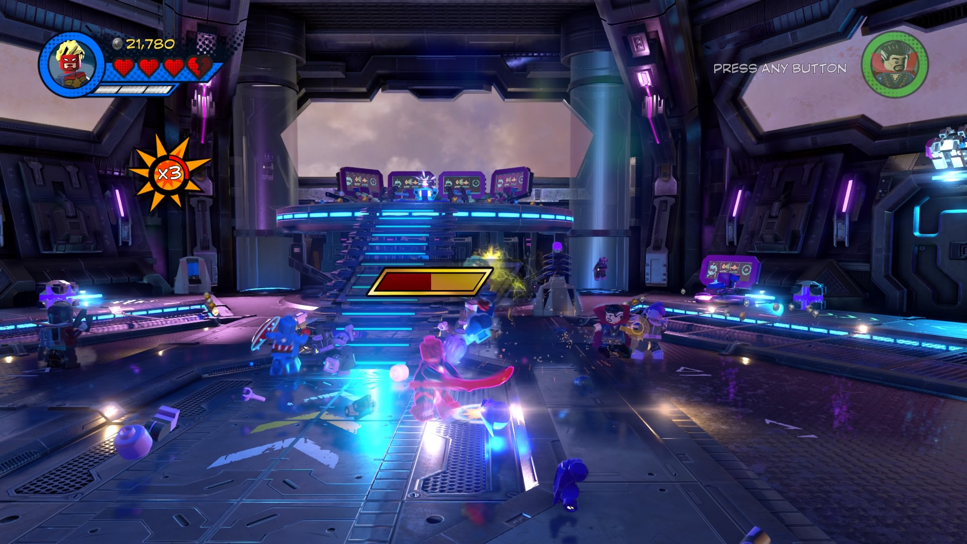 Inside Kang’s Citadel, you’ll have four heroes to help – Captain Marvel, Captain America, Doctor Strange, and Star-Lord. To get to the second floor, move right and smash all the LEGO objects beneath the raised-up wall-jump panels. Smash until a hopping pile of LEGO bricks glows.