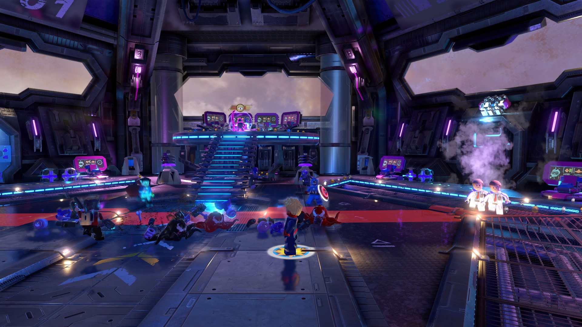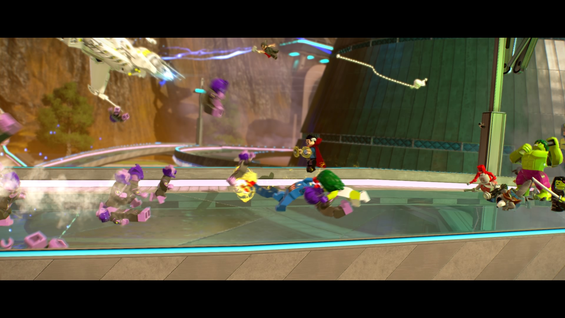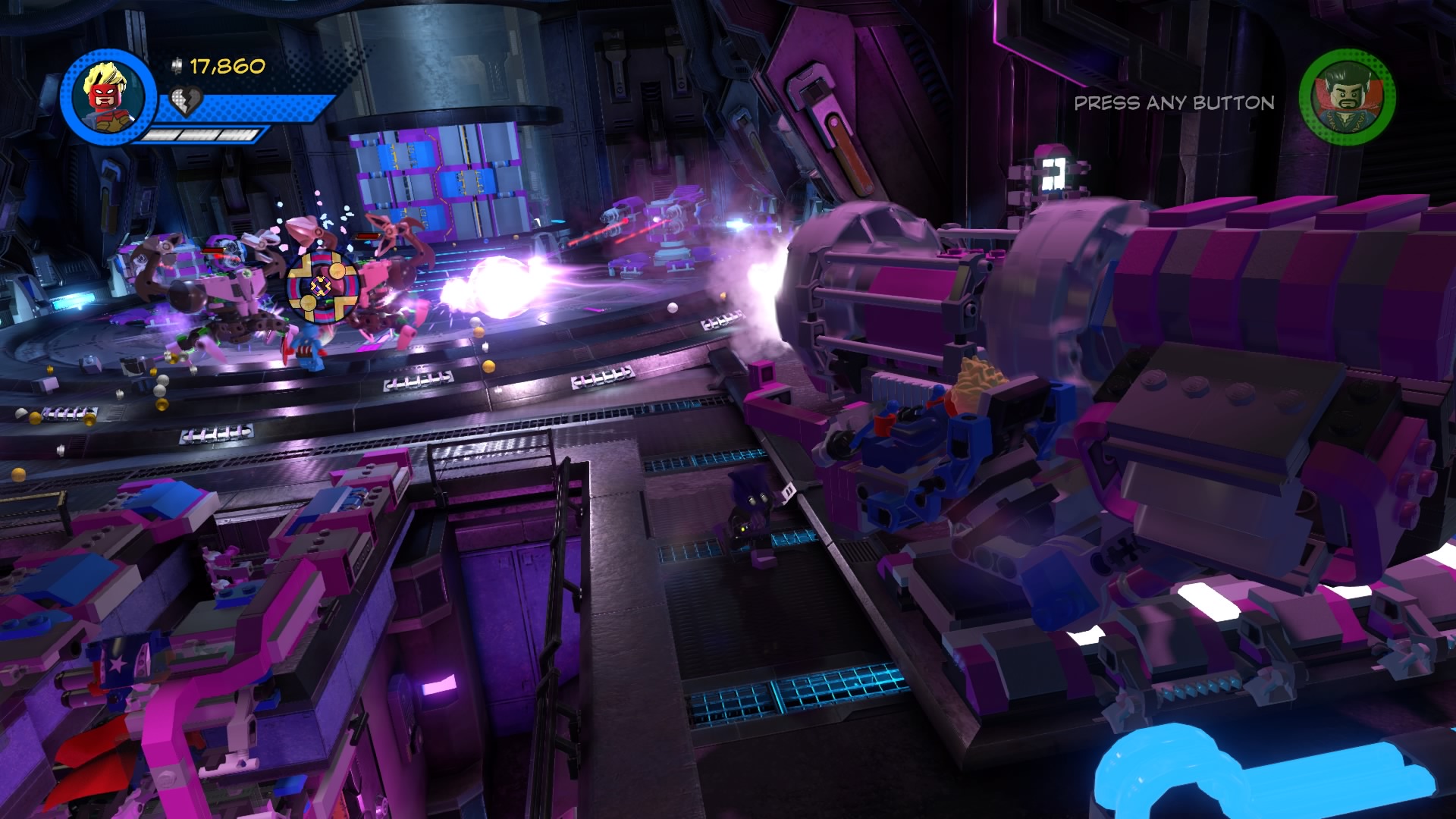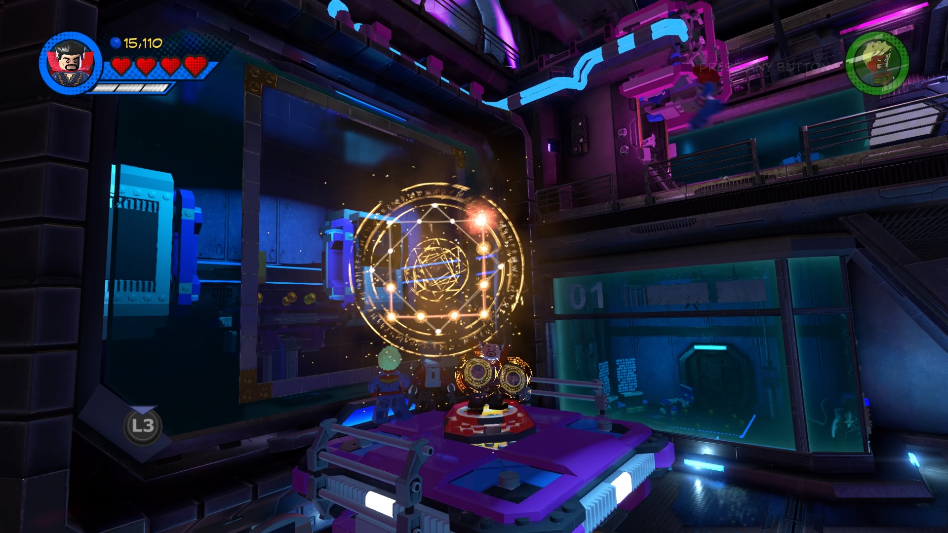 Inside Kang’s Citadel, you’ll have four heroes to help – Captain Marvel, Captain America, Doctor Strange, and Star-Lord. To get to the second floor, move right and smash all the LEGO objects beneath the raised-up wall-jump panels. Smash until a hopping pile of LEGO bricks glows.