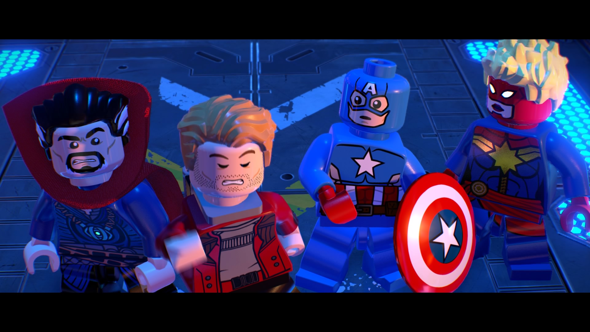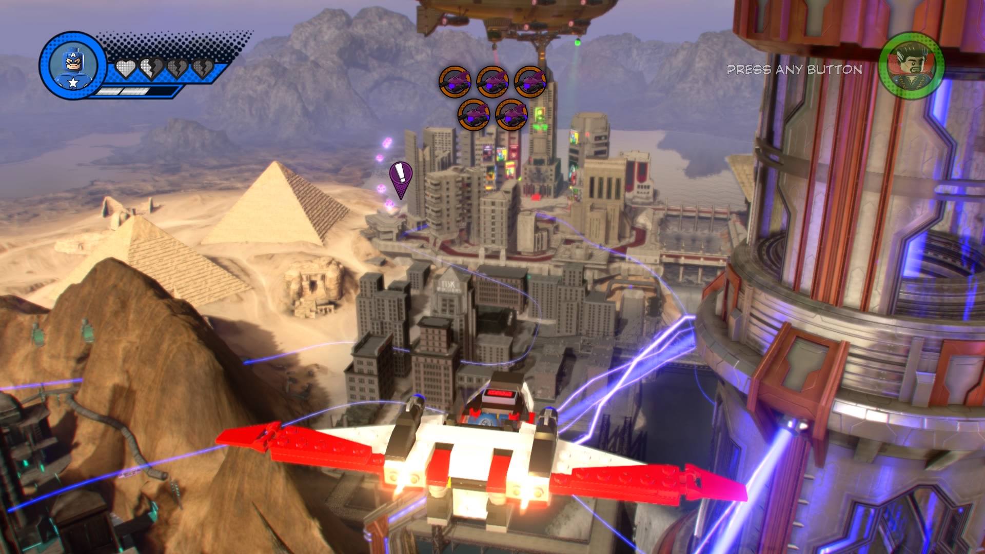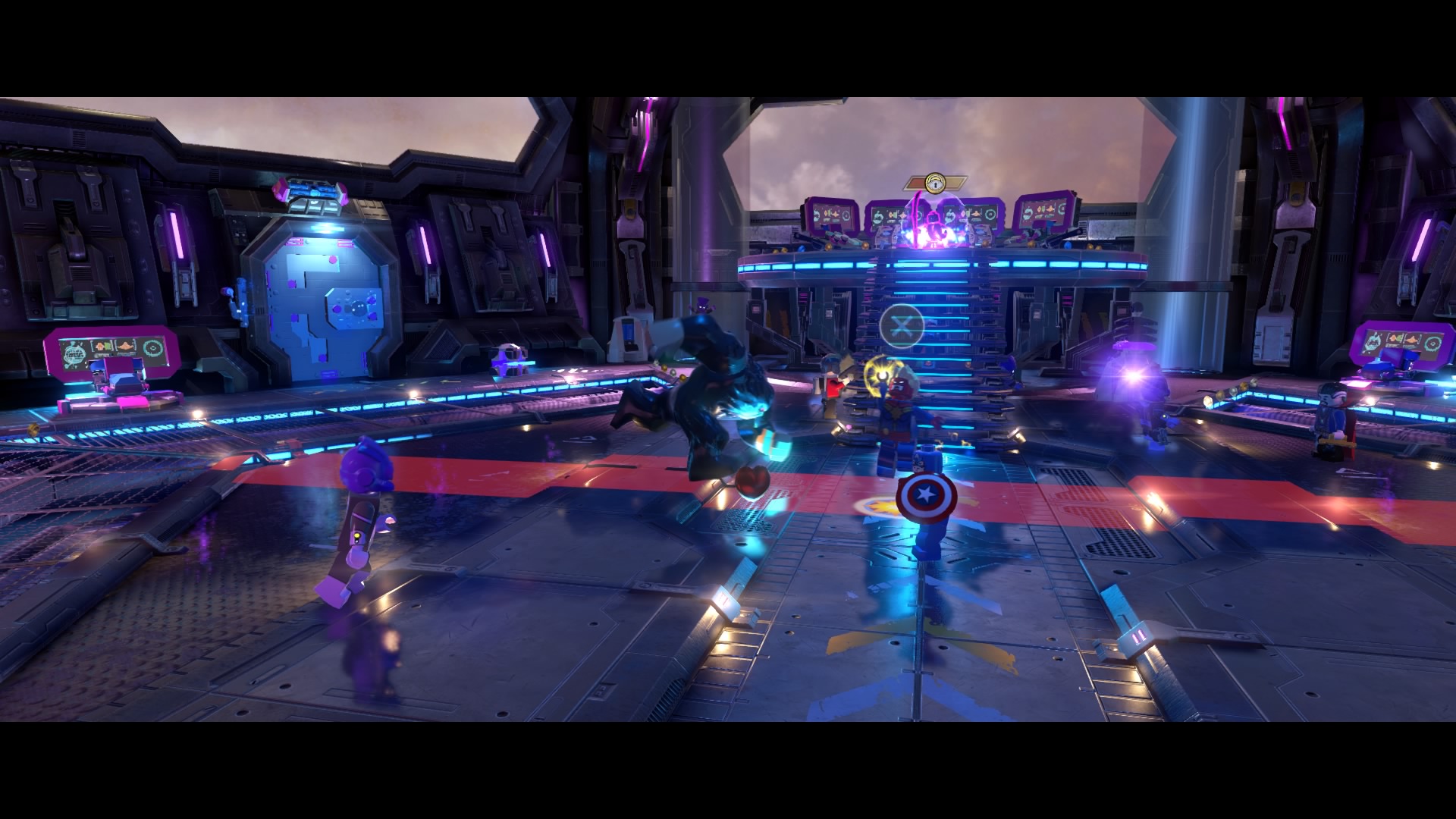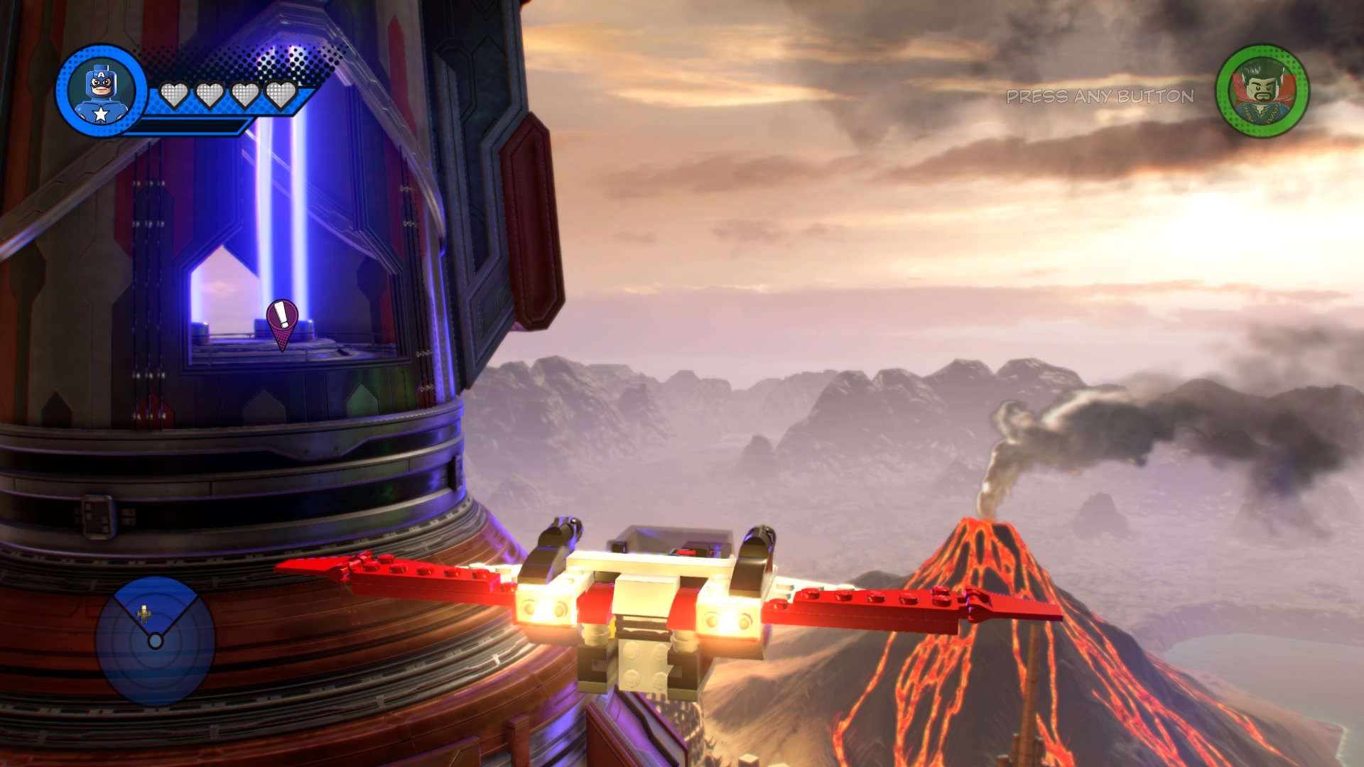 Inside Kang’s Citadel, you’ll have four heroes to help – Captain Marvel, Captain America, Doctor Strange, and Star-Lord. To get to the second floor, move right and smash all the LEGO objects beneath the raised-up wall-jump panels. Smash until a hopping pile of LEGO bricks glows.