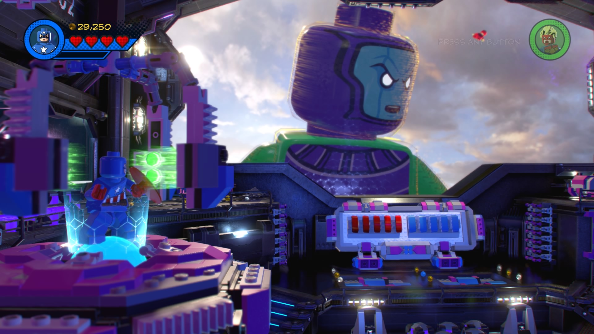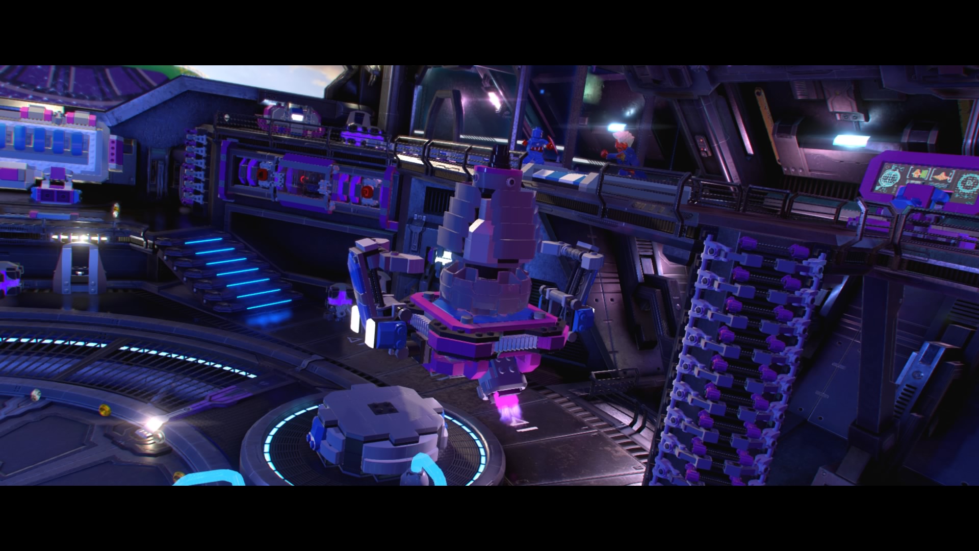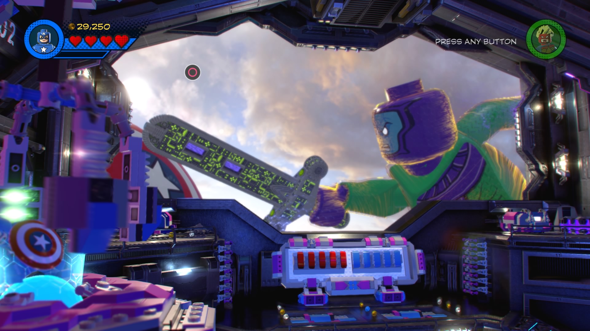Start by slicing through the gold LEGO door with Captain Marvel, then smash all the glowing LEGO bricks to get the hopping bricks you need to repair the track. Push the purple LEGO machine to the end of the tracks, then use the control panel in the center of the Control Room. That repairs the big machine on the left – climb up the ladder and enter the hologram with Captain America.