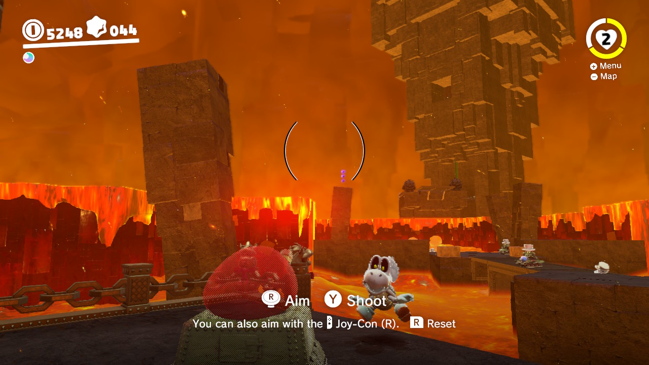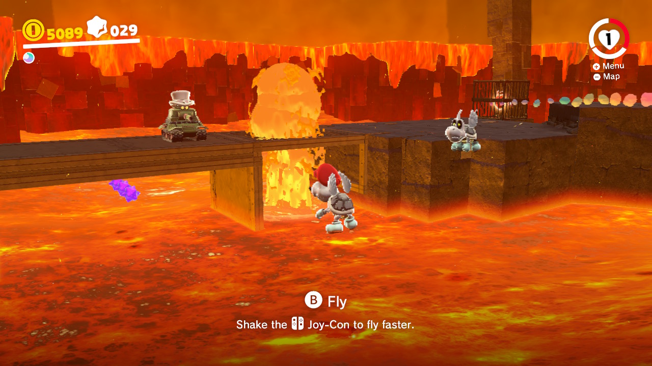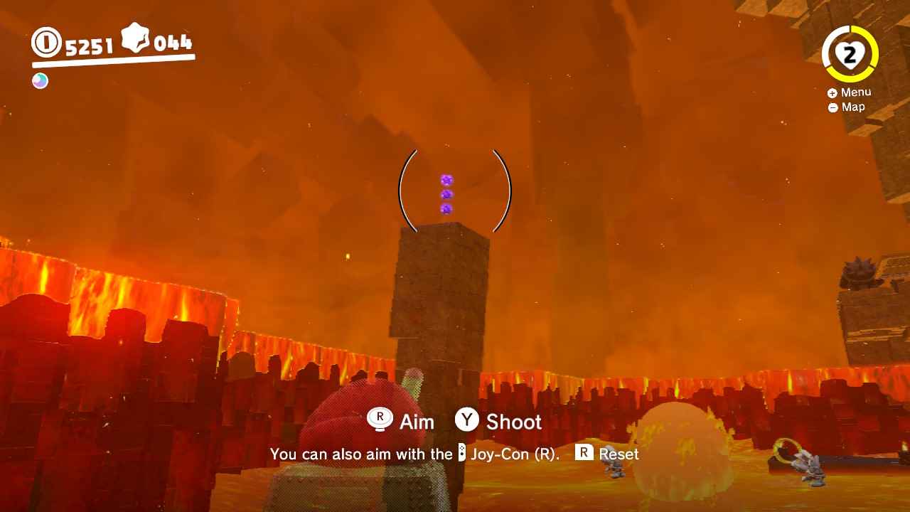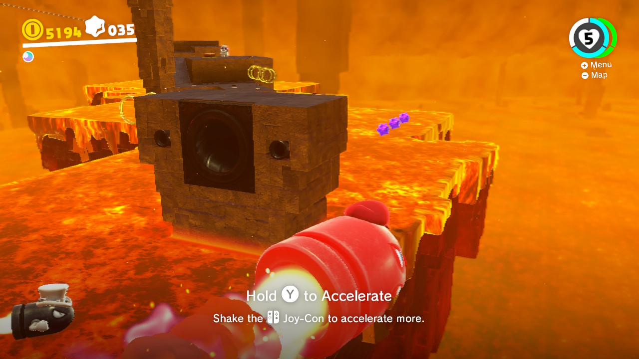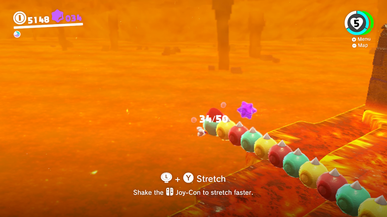 Much of the Moon Kingdom is set in the lava-filled underground caverns, where you’ll have to capture flying skeleton koopas, dodge Bullet Bills, weave through invisible paths, and tackle rocks with Footballers. One particular set of purple coins looks completely impossible to collect — remember, the tank shots from Sherms can collect coins and regional currency if you aim carefully.