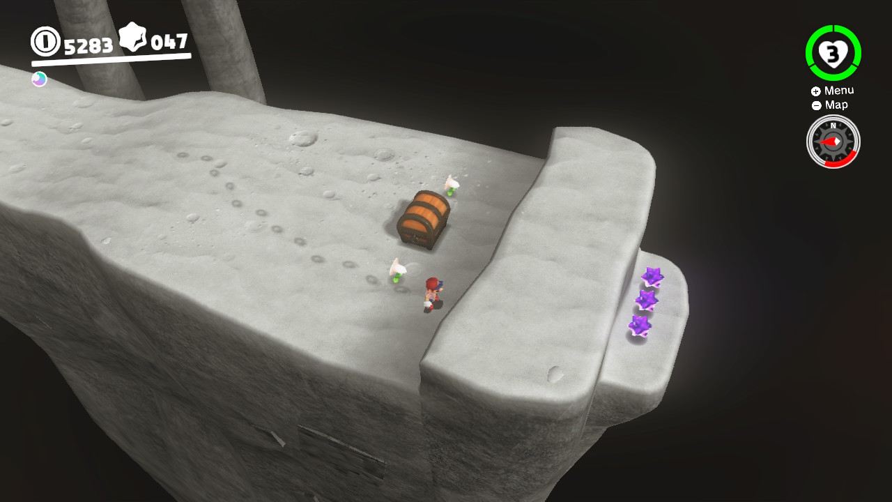- 3 Coins: Left of the flag, grab a flower that gives Mario a boost of speed and jump to the island with a Power Moon chest. Behind the chest, there are three coins.