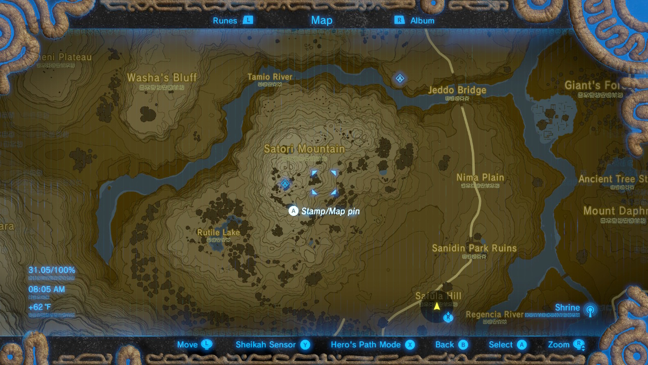 - Ridgeland, Satori Mountain – Find Satori Mountain northwest from Outskirt Stable, near the Mogg Latan Shrine. Near the peak, there’s a small pond with a pink tree. The chest is found at the base of the pink tree — again, use Magnesis to pull it out of the dirt.