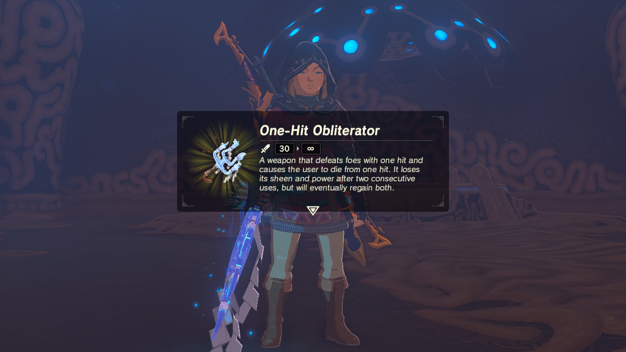 Collect the One-Hit Obliterator to begin the quest. The One-Hit Obliterator is required to complete the first “shrine” challenge — when it is equipped, Link can kill enemies in one hit, but he’ll also be defeated in one hit. The effect has two charges, and the Obliterator will glow when the ability has recharged, just like the Master Sword.