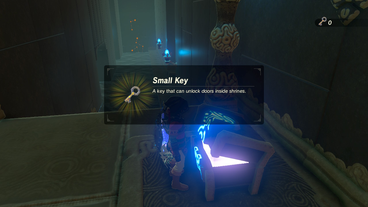 The platform in the center of the shrine will lower. Glide down and go left — the underground passages are protected by even more Ancient Guardians. Fight through the Guardians to reach a chest with a Small Key.