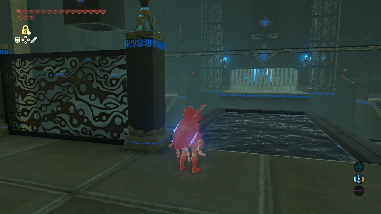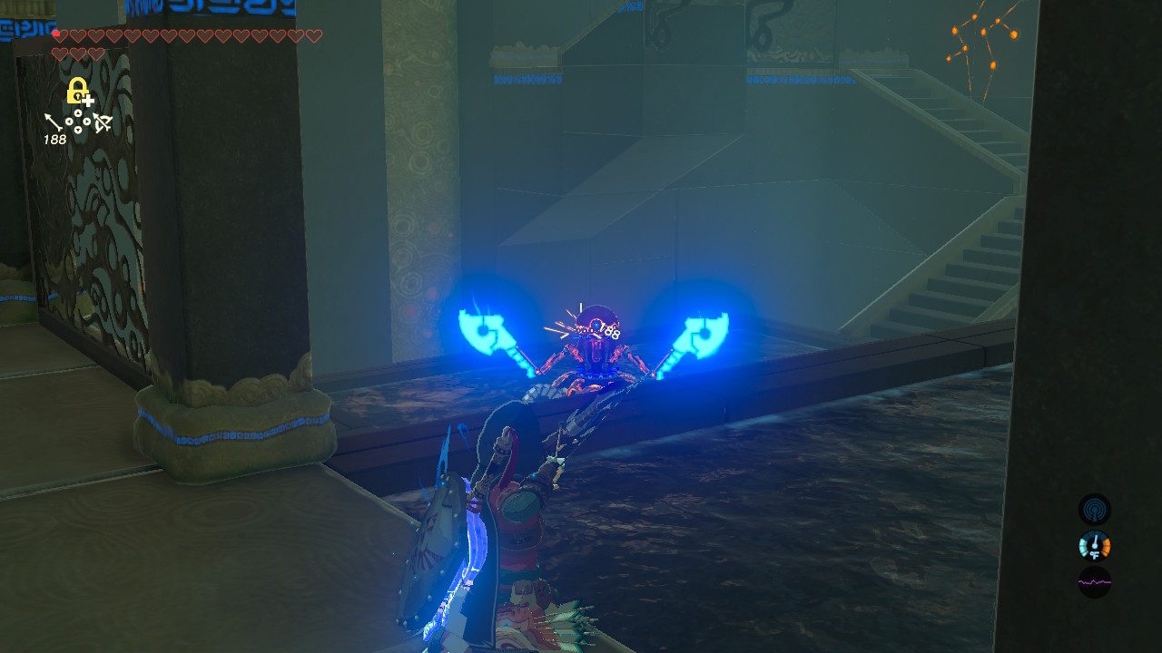 Through the small key door, you’ll encounter a trio of Guardians. These are pretty weak — to avoid taking a cheap hit, just use your bow to destroy them all from cover. Aim for the blue eye and you can quickly kill them, one at a time, with any standard bow.