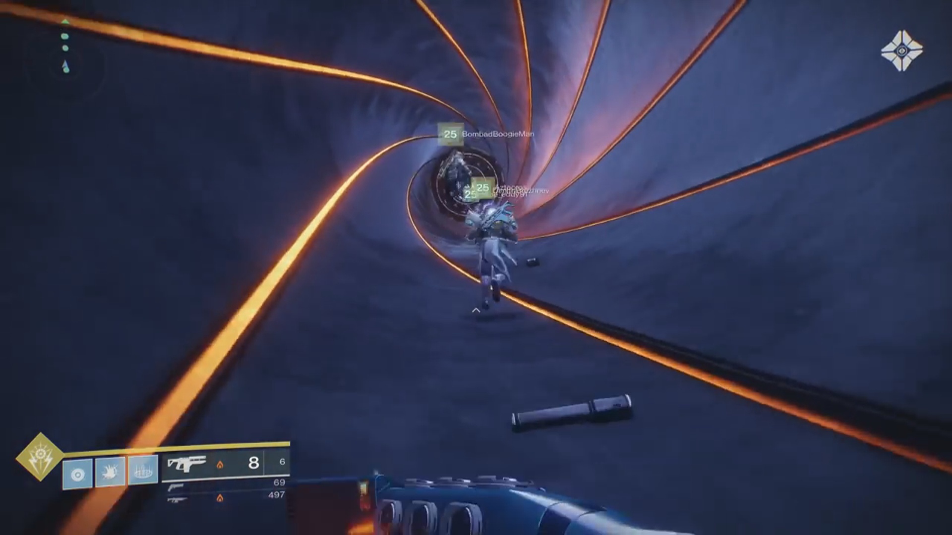 After the spiral corridor, players will be shot out into an open area with debris flying everywhere. You will need to jump on the various rocks and reach down to the platform below. Once you’re on the platform, your team will need to focus on blowing up the glowing object in the middle. Likewise, there will be three elemental areas on the map which will be highlighted and shaped like a triangle on the ground.