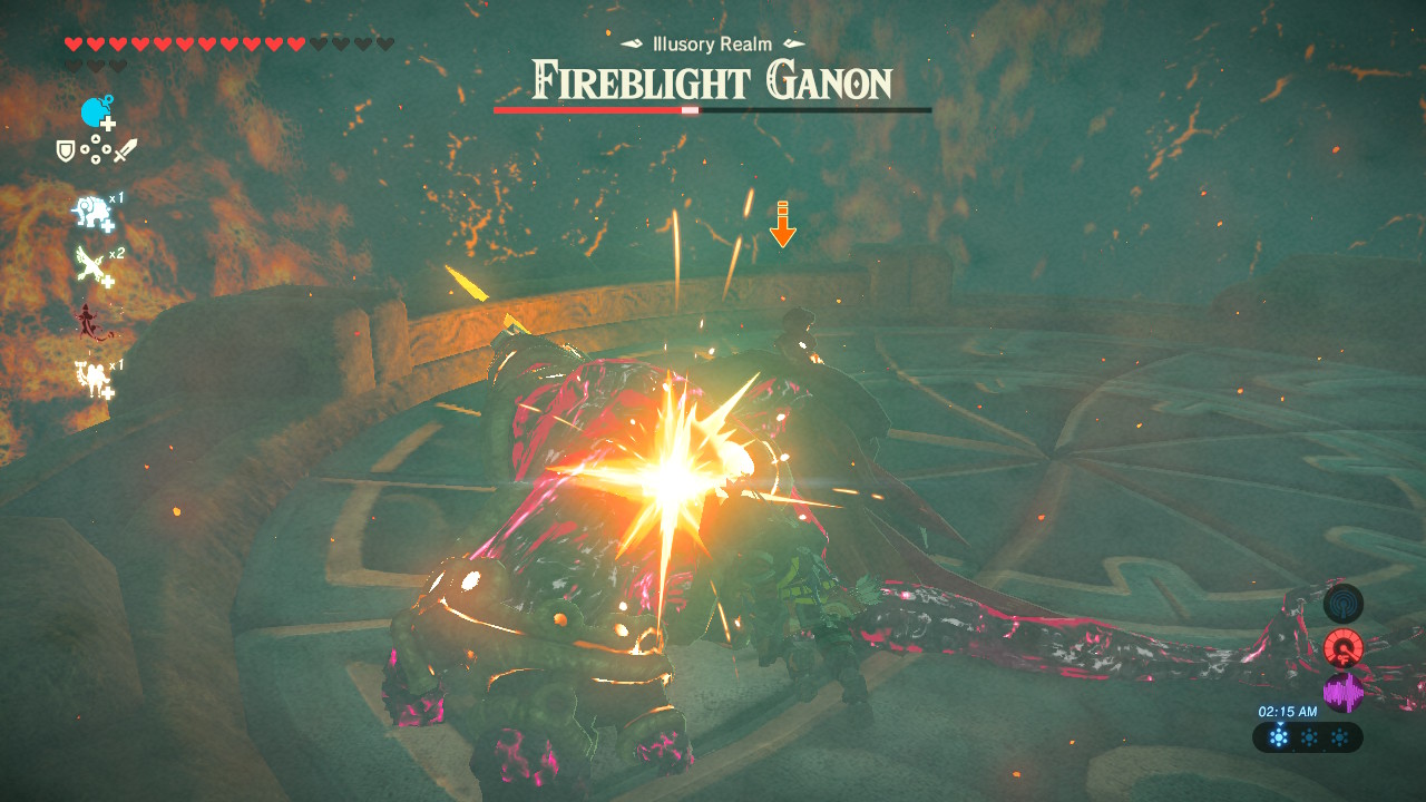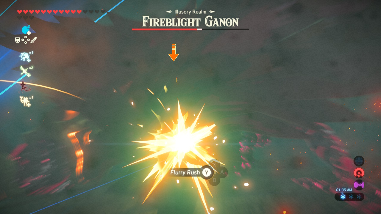 The first part of the fight is very simple. Fireblight Ganon attacks with horizontal or vertical strikes. Watch his blade, then dodge appropriately right as he attacks — it takes some practice, but if you time your dodge just right, you’ll be able to use Flurry Rush. The Boulder Breaker is pretty powerful, so it won’t take long to bring Fireblight Ganon’s health down to 50%.
