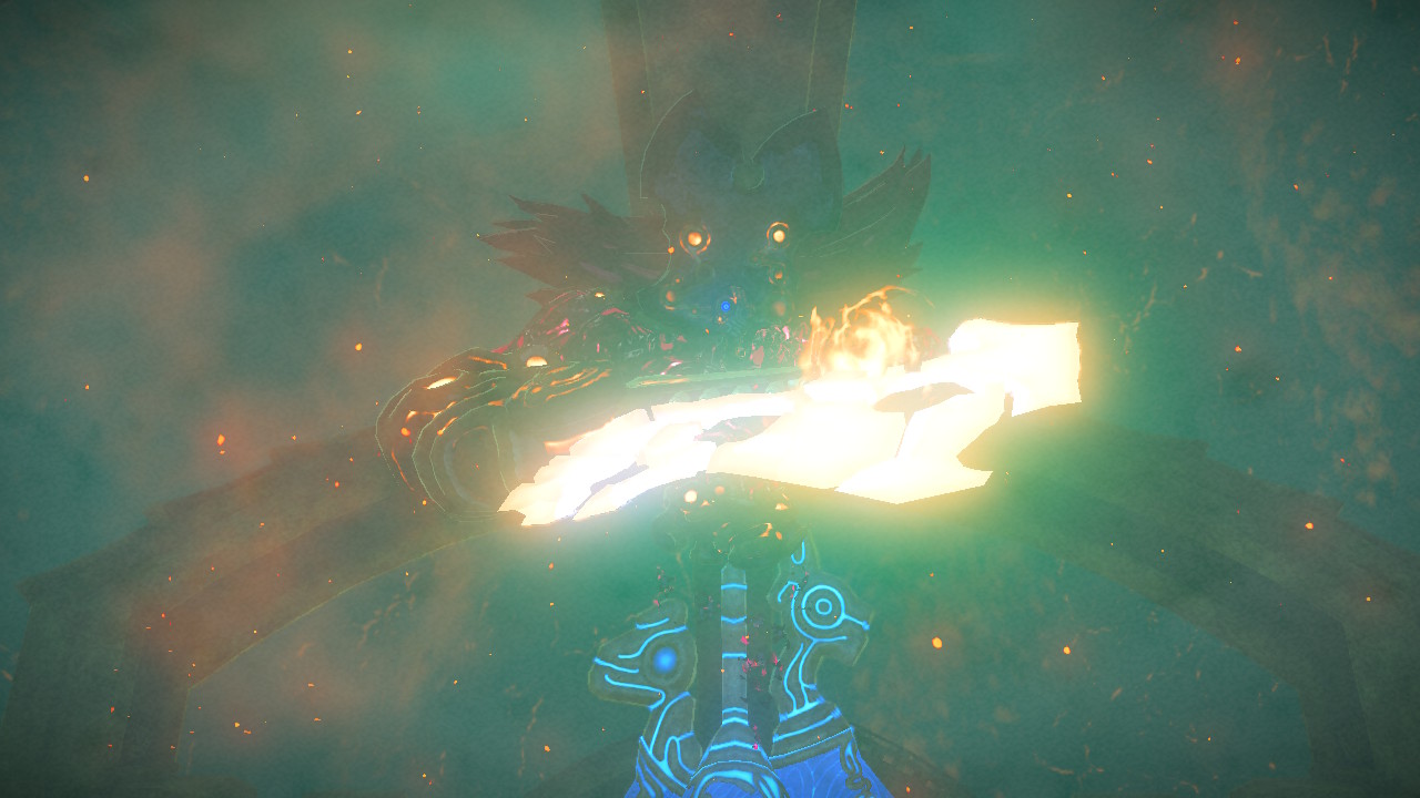 In the second phase, Fireblight Ganon gains a fire shield, a fire-enhanced sword, and will shoot a blasts of burning projectiles. Fire isn’t too much of a problem — with the Goron armor, Link is Fireproof. The trick is getting through that fire shield.