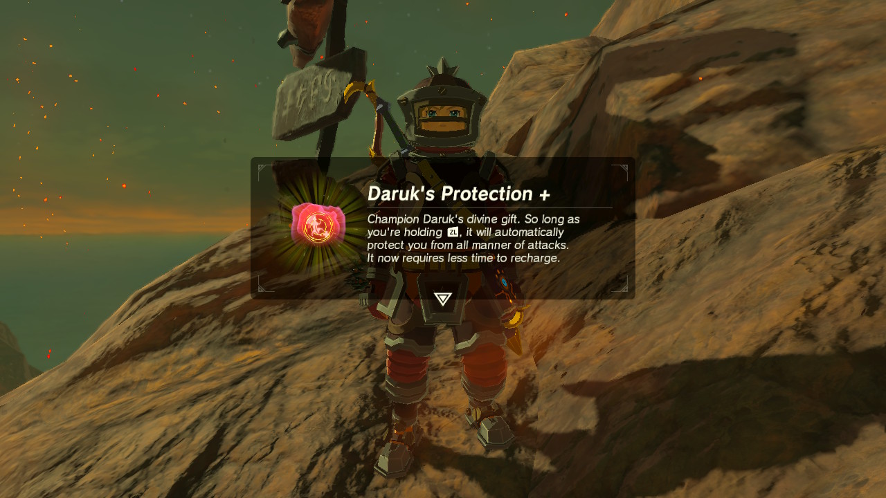 - Reward: For completing another rematch, you’ll earn a special cutscene with Champion Daruk, and unlock an upgraded version of Daruk’s Protection.