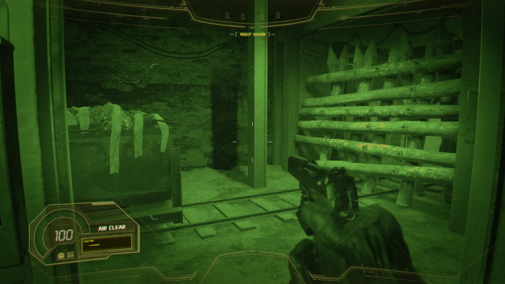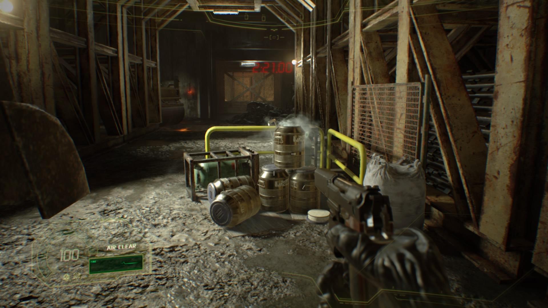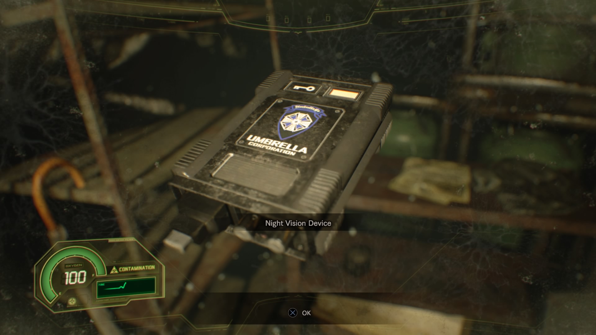 In the same room, grab the Night Vision Device from the metal cart next to the green barrels. Now, when Chris enters low-light areas, you’ll be able to see clearly. Don’t miss the Med Injector to the left of the upgrade, or the pair of Incendiary Grenades on the opposite wall.