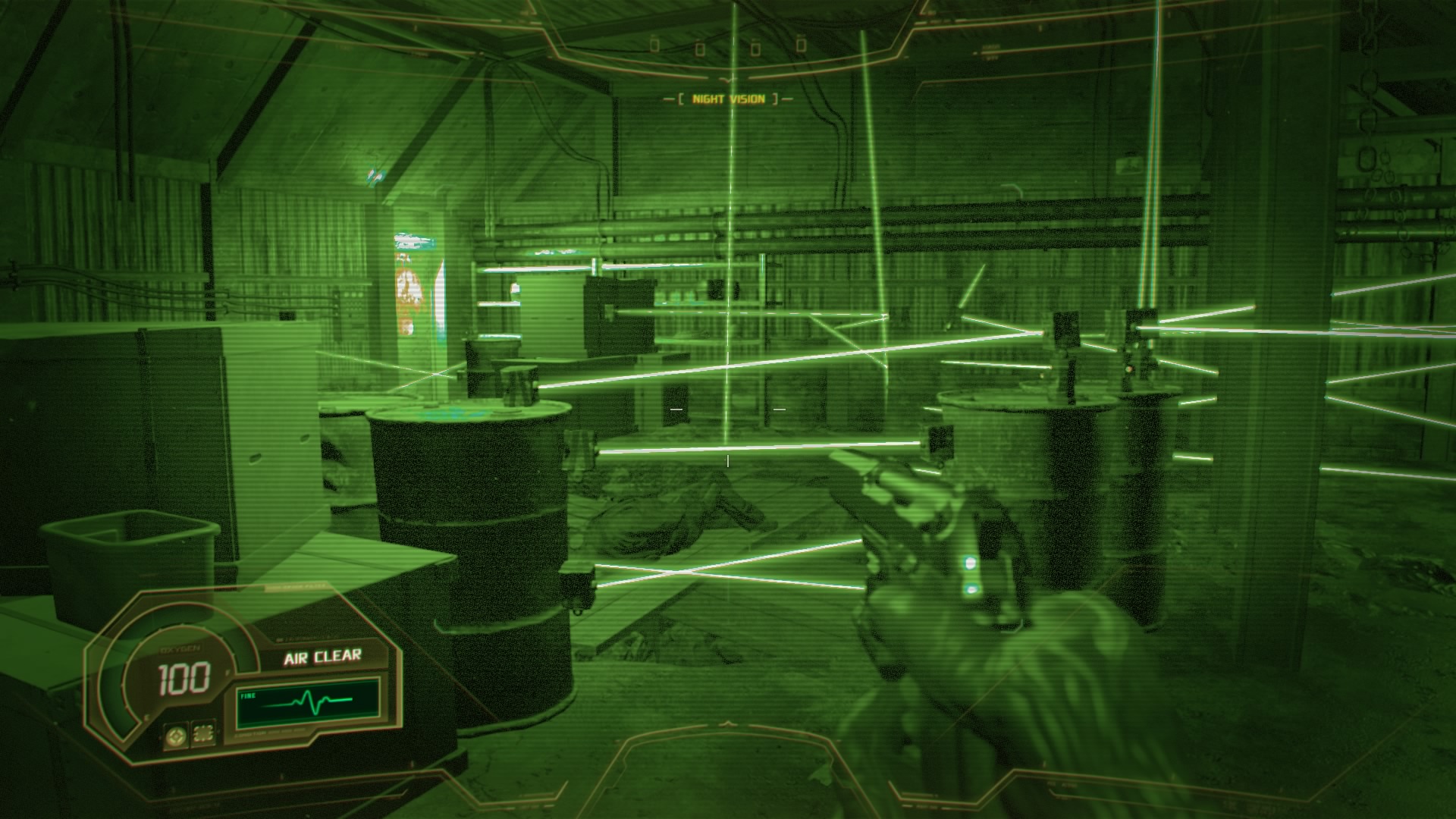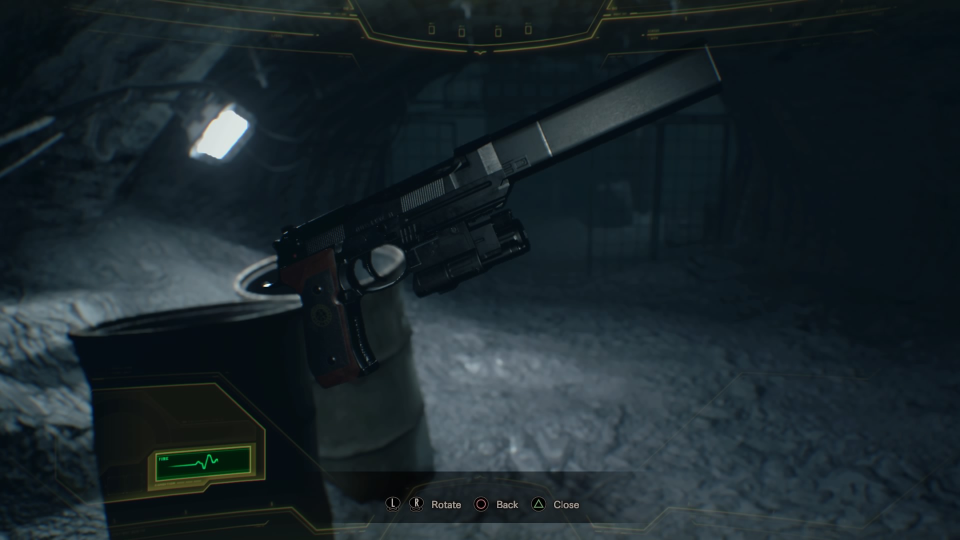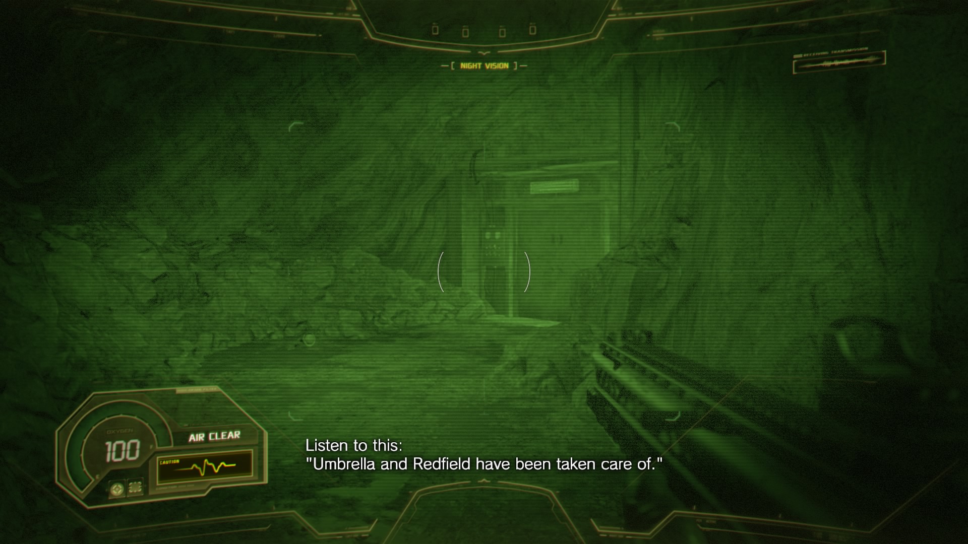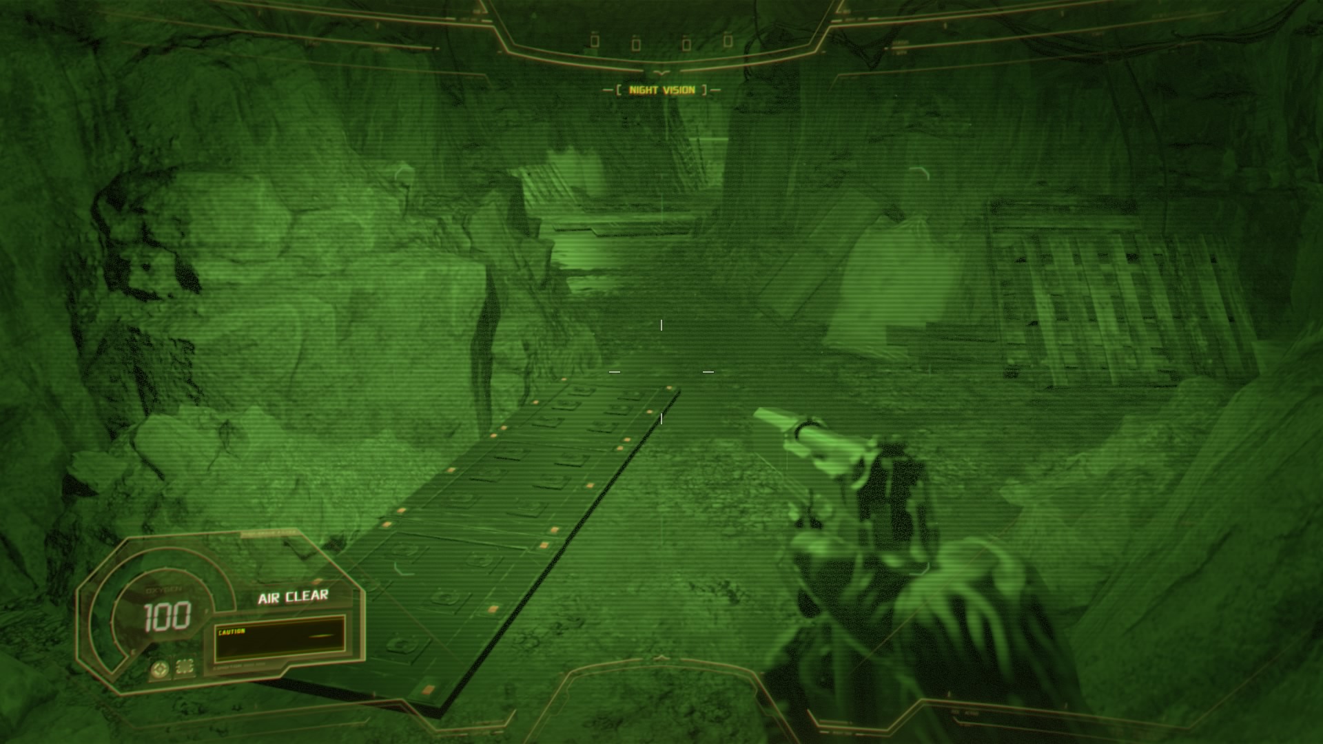 In the same room, grab the Night Vision Device from the metal cart next to the green barrels. Now, when Chris enters low-light areas, you’ll be able to see clearly. Don’t miss the Med Injector to the left of the upgrade, or the pair of Incendiary Grenades on the opposite wall.