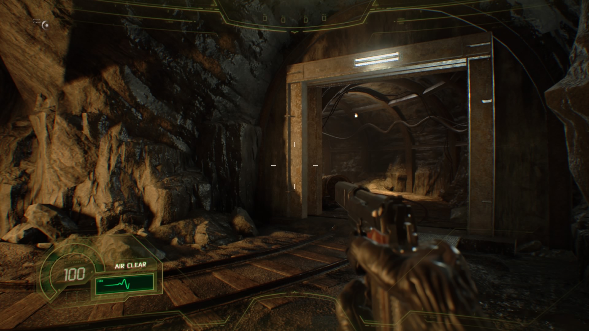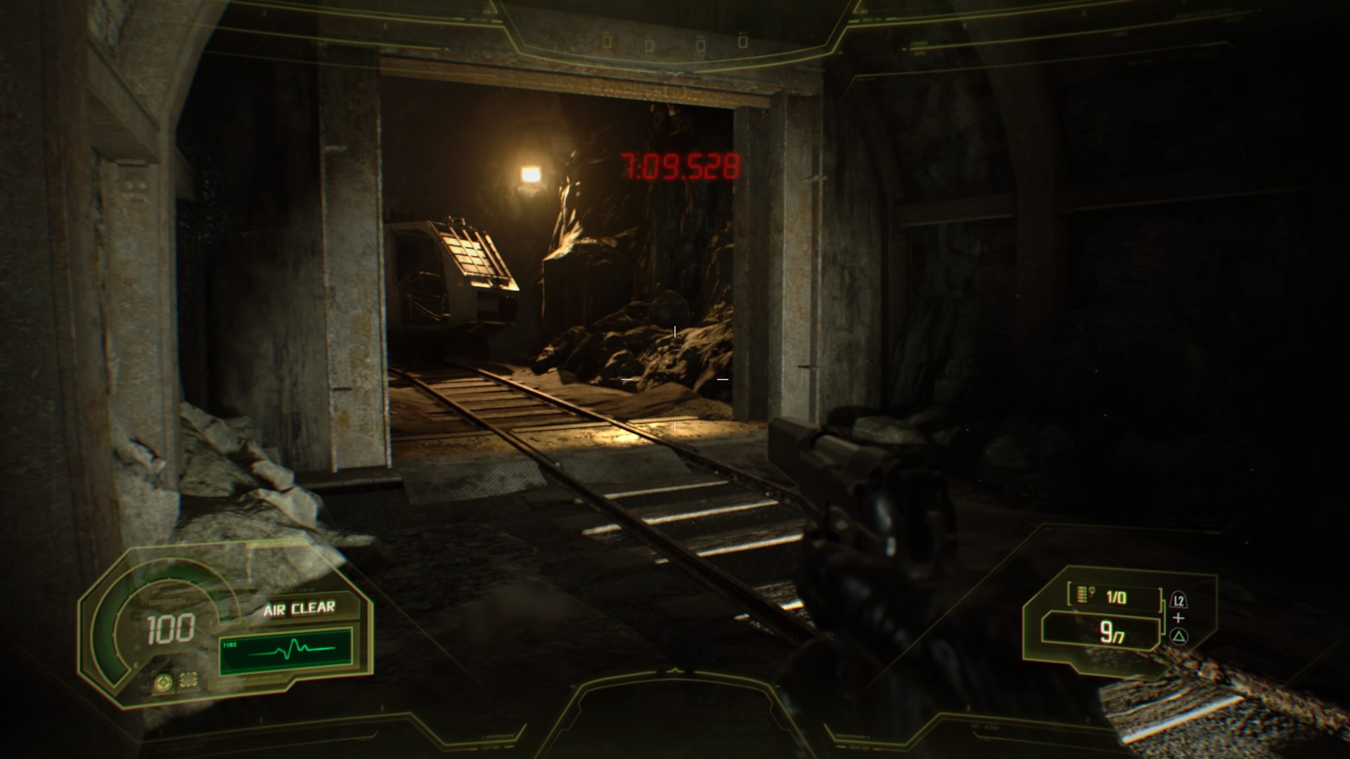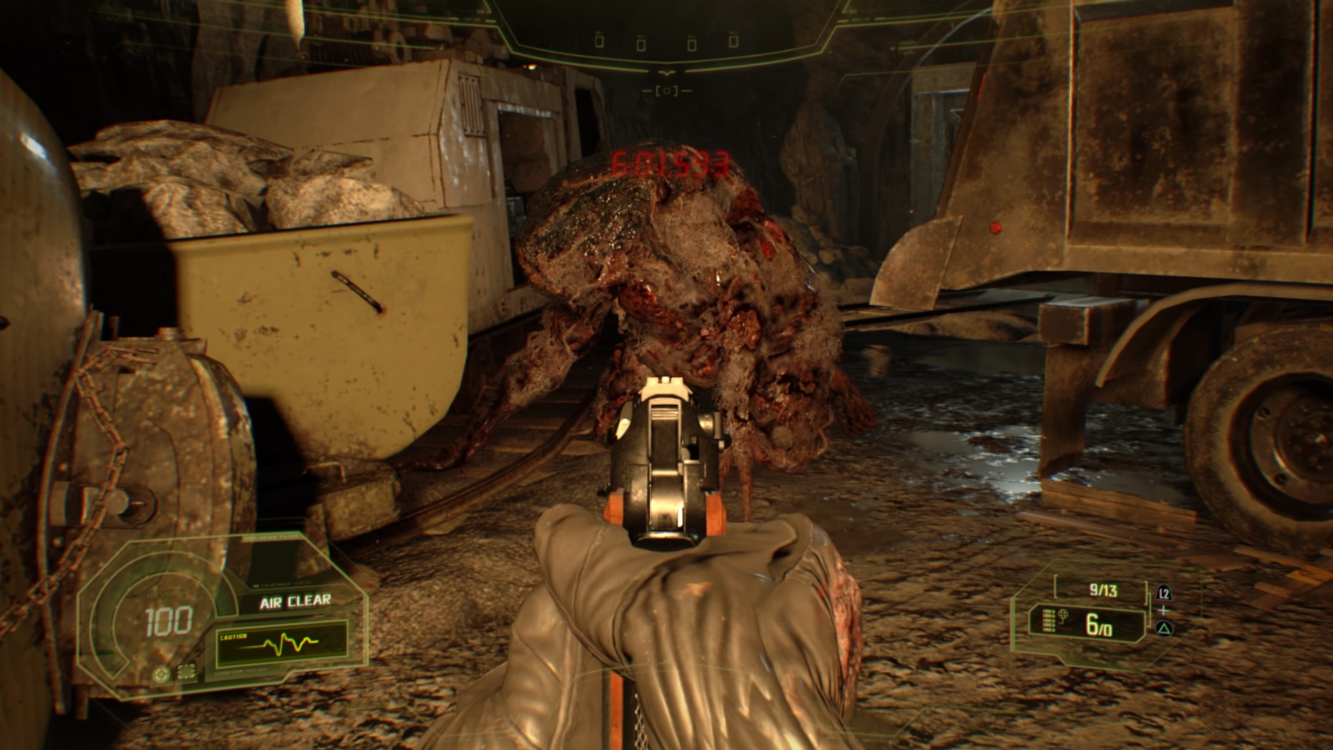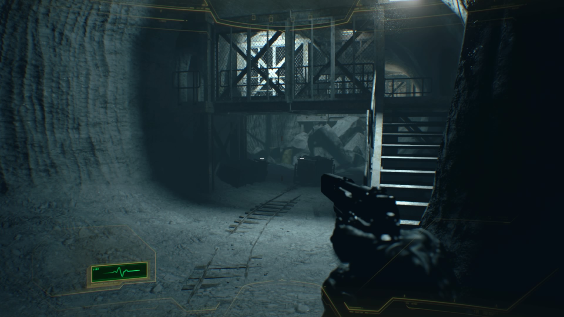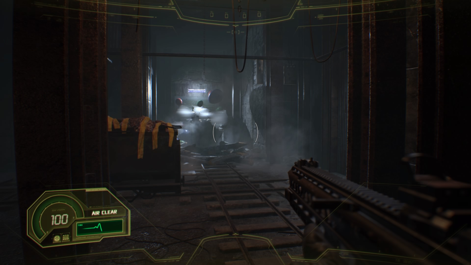 Duck under the laser tripwire in the passage, then slip between the two. After that, there’s a regular tripwire before the door. Duck under it and use the button to open the shutter. On the cart tracks, equip the shotgun and push the cart to break through the wooden barrier – a Fat Suicide Molded will spawn.