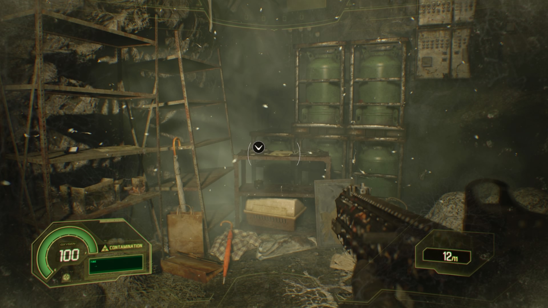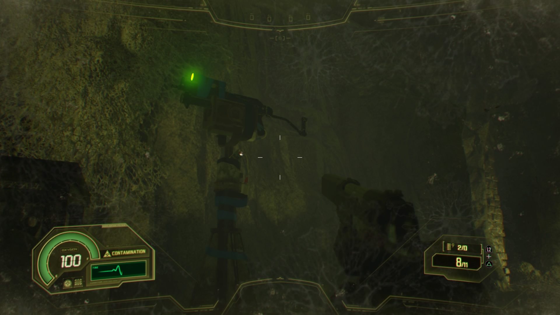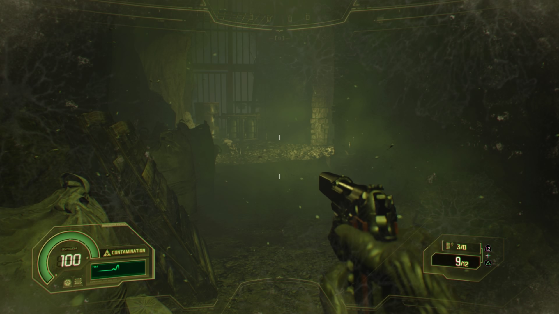 Enter the green shutter once you have acquired the High-Grade Filter upgrade. Push open the door and enter the contaminated catacombs. When the White Molded spawns, collect the grenade on the slab to your left and use it. A grenade blast will stun a White Molded, giving you time to run ahead.