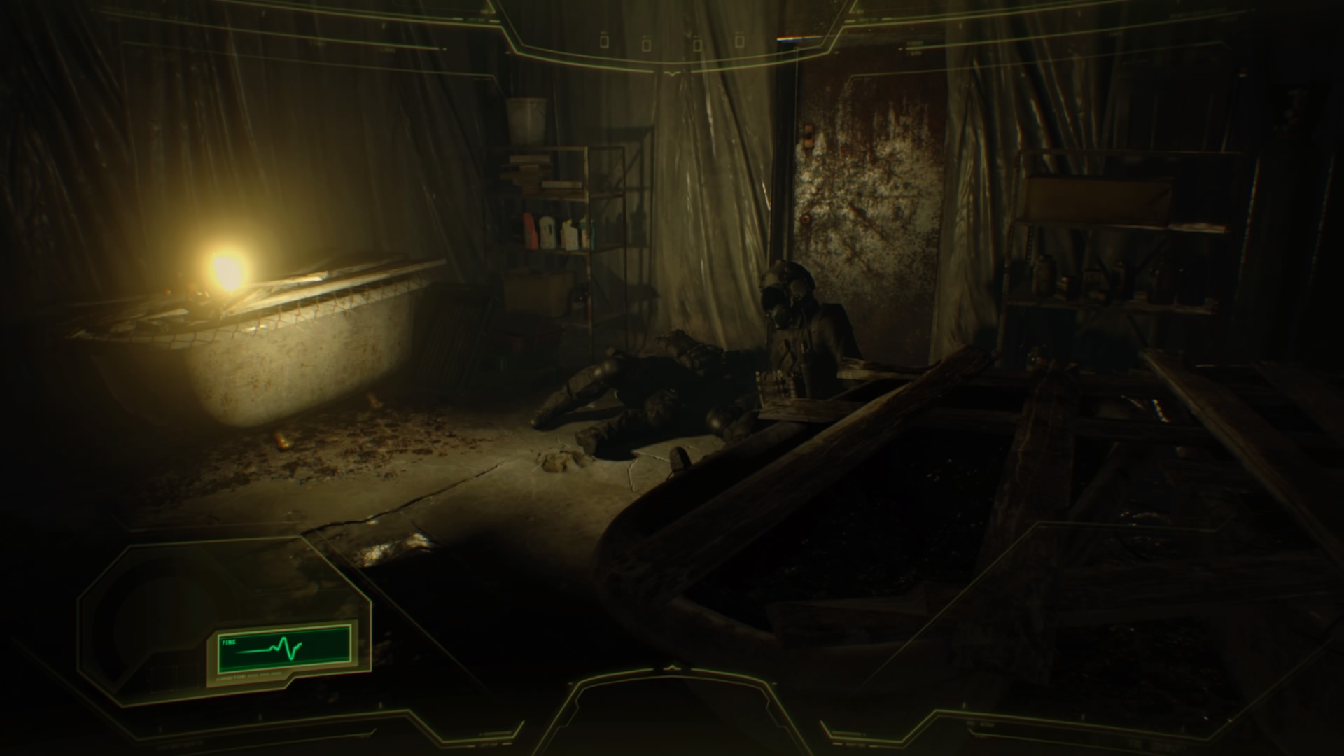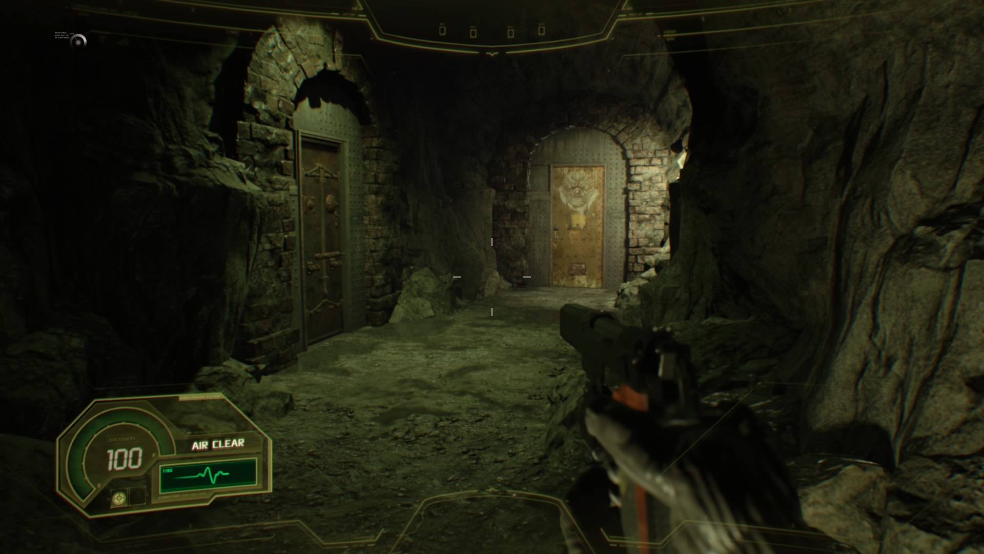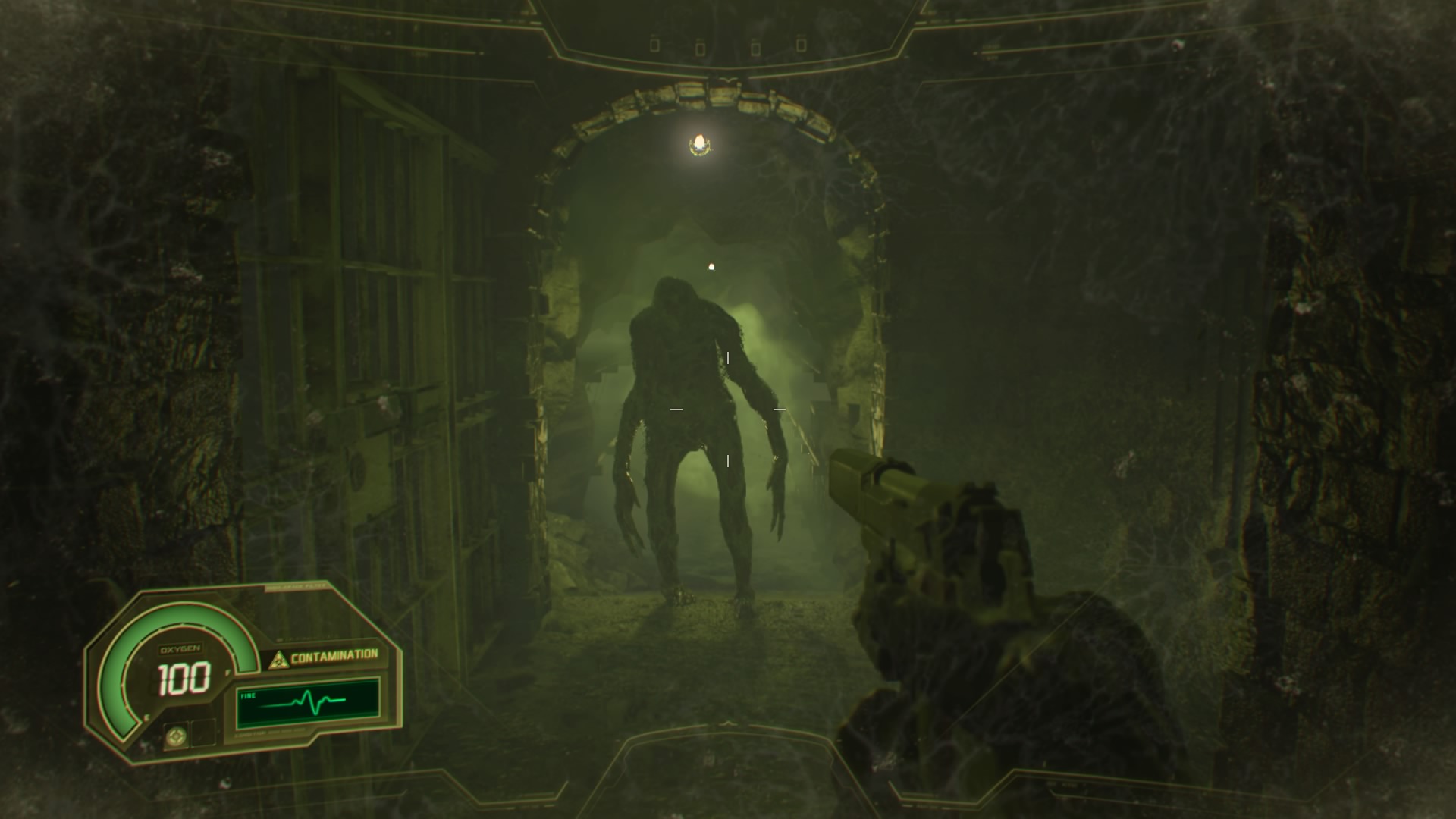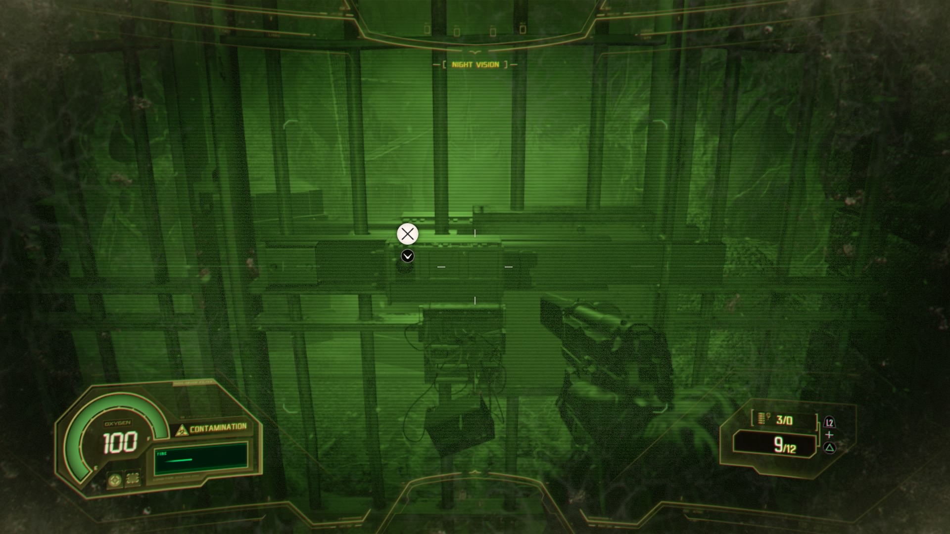Enter the green shutter once you have acquired the High-Grade Filter upgrade. Push open the door and enter the contaminated catacombs. When the White Molded spawns, collect the grenade on the slab to your left and use it. A grenade blast will stun a White Molded, giving you time to run ahead.