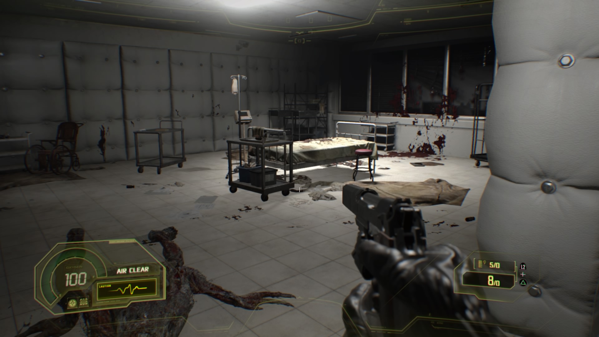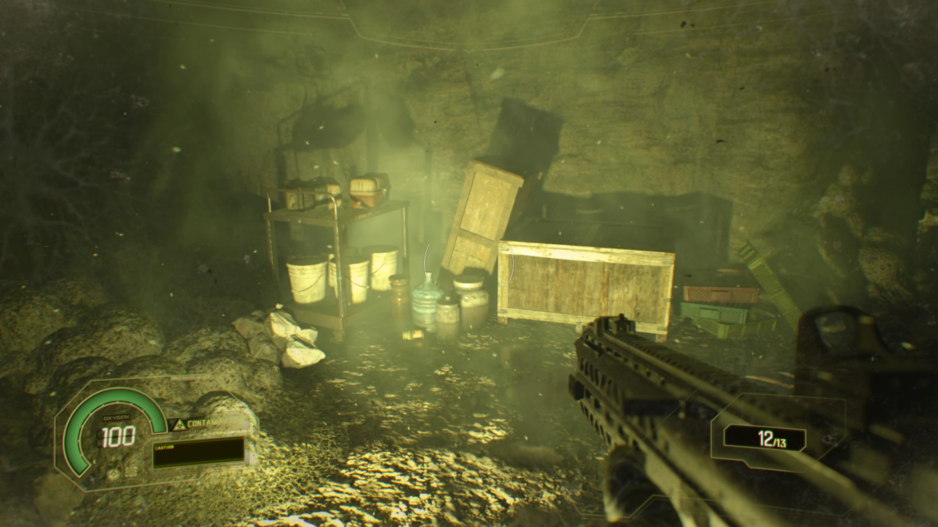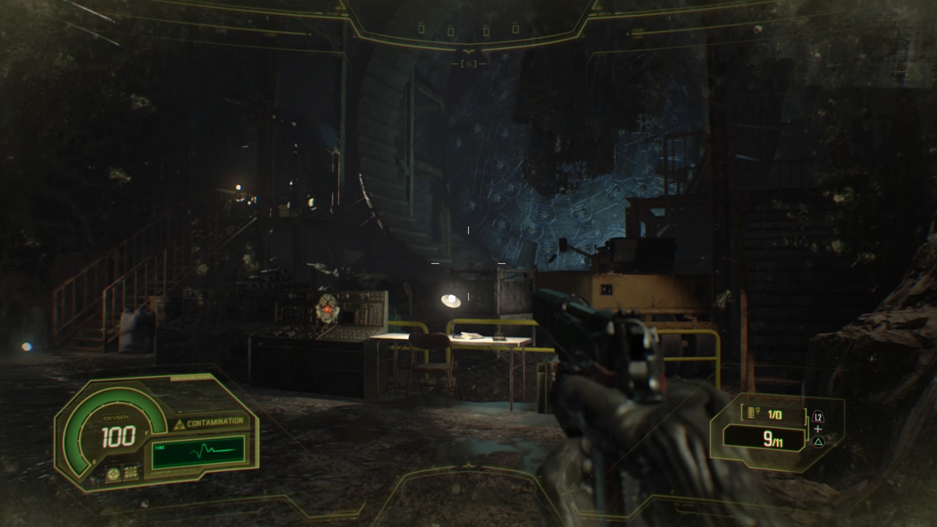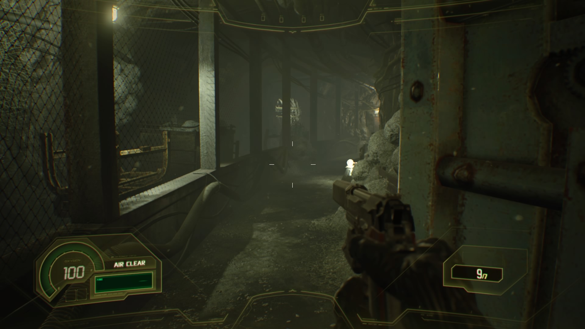 Now, follow Lucas down the hallway behind the Clinical Lab. The turret is out of ammo. Enter the Cultivation Lab, and smash all the crates and scrounge for ammo / items. Lucas will ambush you here – use everything you’ve learned so far, and carefully manage your oxygen supply during the second phase of the fight, only recharging when you’re low, and you should come out of the fight just fine. Remember; aim for the head, then aim for the chest.