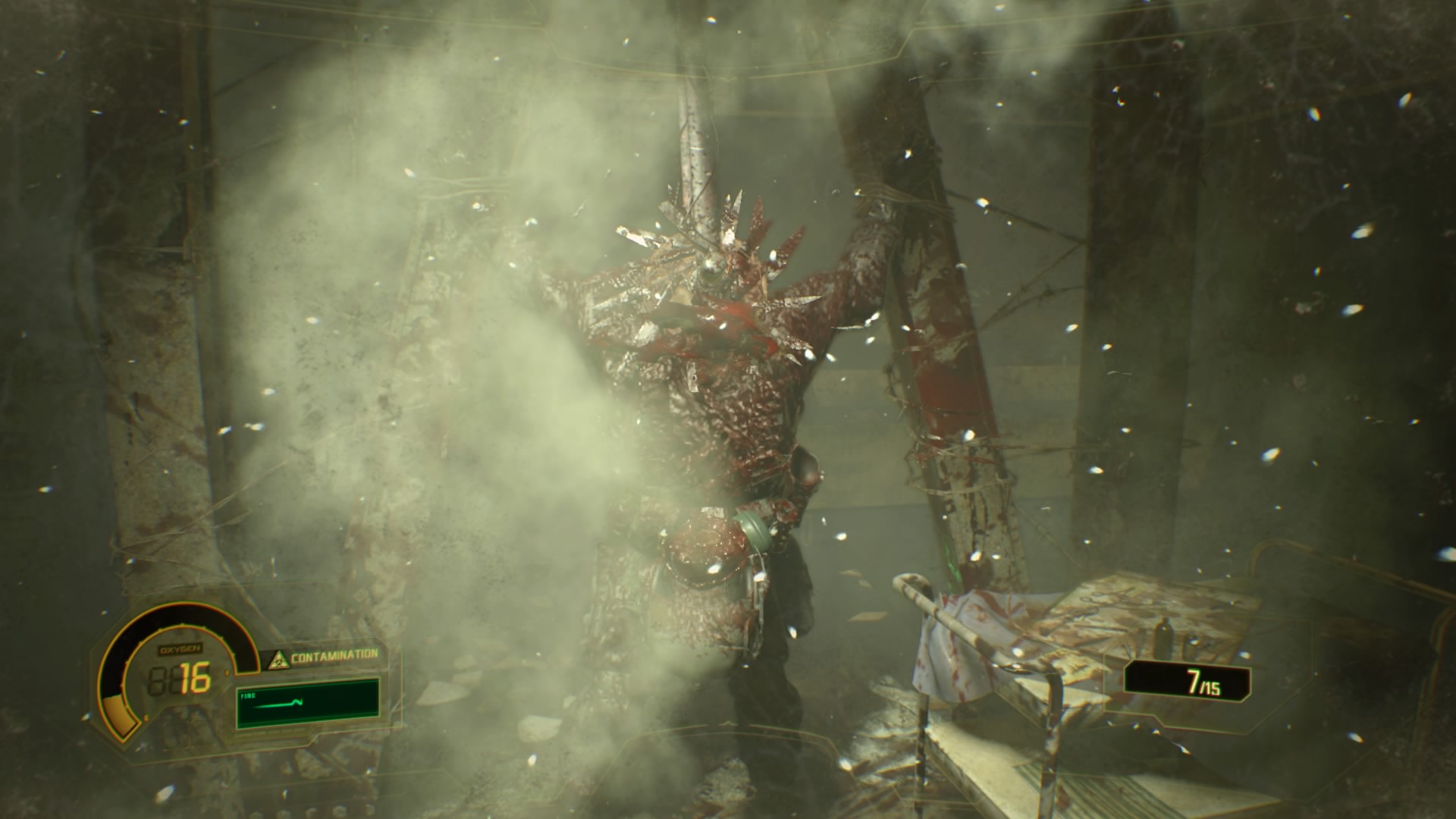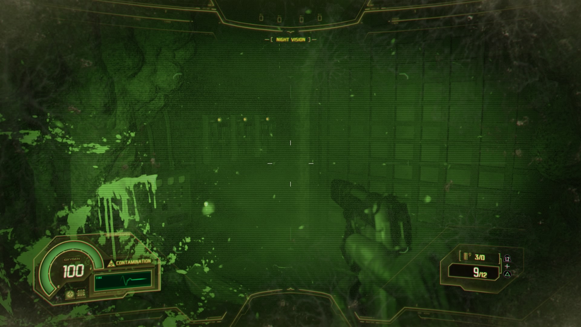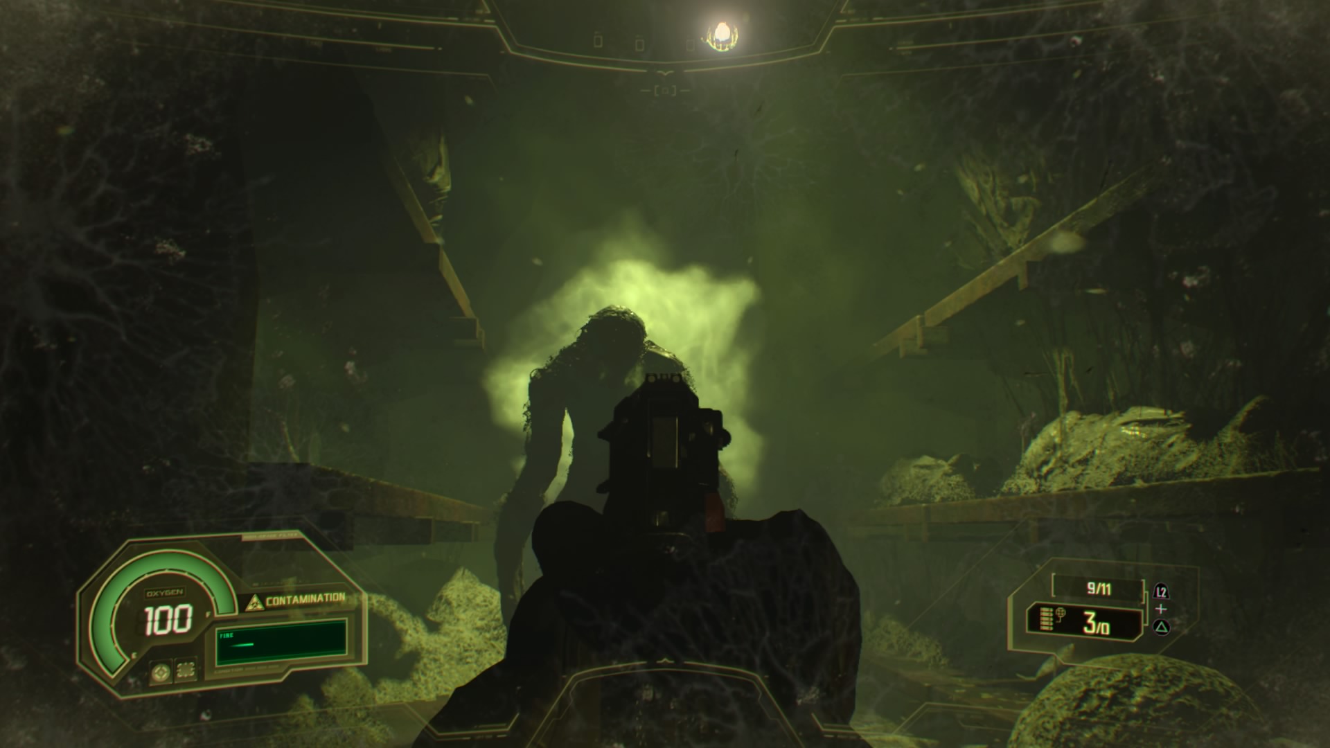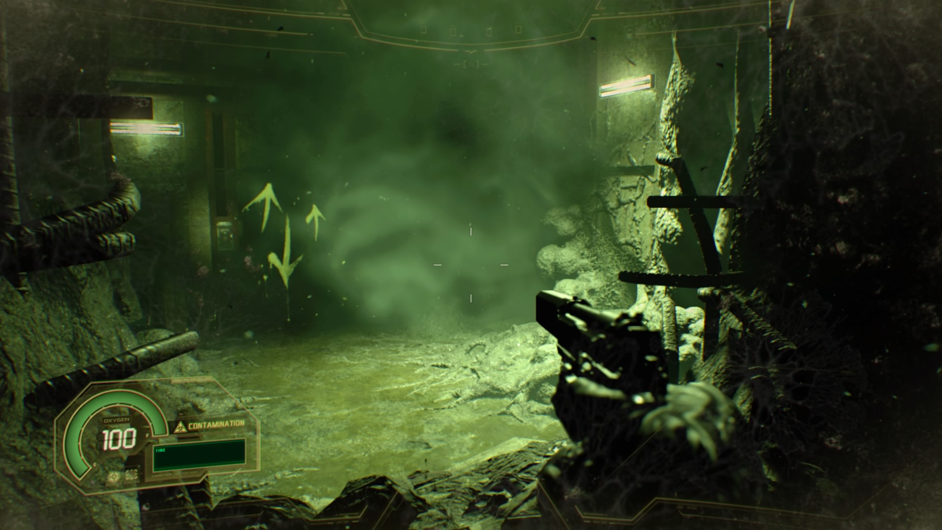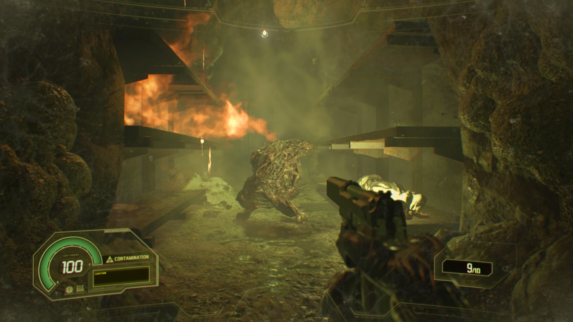 Leave through the door to catch your breath, then run through the contaminated hallway ahead. In the elevator lobby, you’ll encounter another Molded. Kill it and hit the red button. The contamination will stop when the lift starts going down.