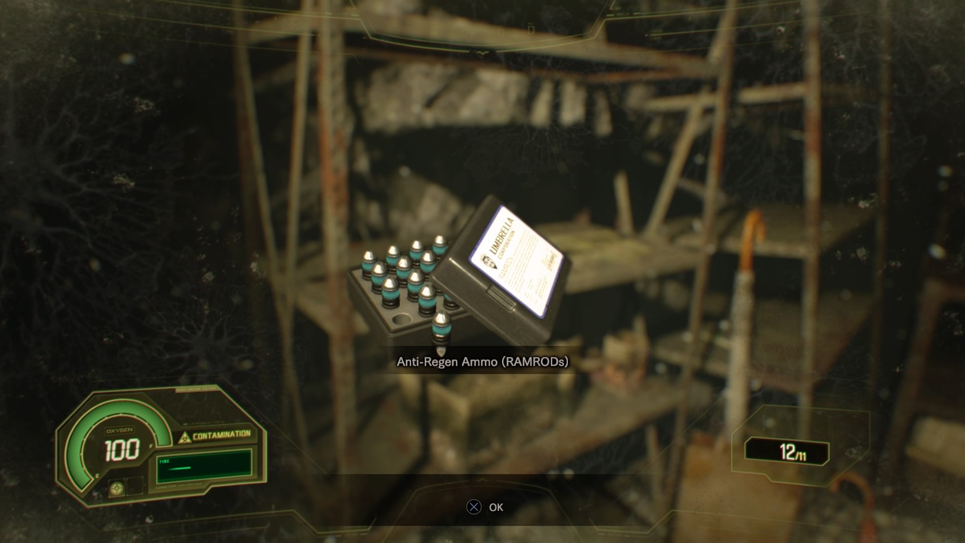 The path behind the White Molded eventually leads to a stockpile room. Grab the two Neuro Grenades on the crates. Keep running. Look for an open metal door on the right as you weave through the underground. Go inside and collect the RAMROD Ammo in the dead end, on the metal cabinet.