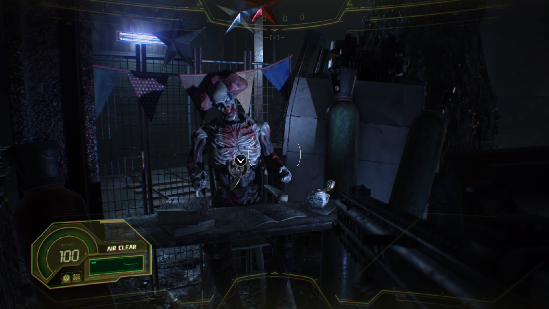 Ahead, you’ll enter the Repair Yard. Take the Clown Key from the strange doll in the center of the room, and Fast Molded will spawn all around you. Use the shotgun (or careful pistol shots) to clear a path to the exit door. If you can reach the door, the Fast Molded can’t follow. A White Molded will also spawn in your path. Take it carefully, or attempt to escape.