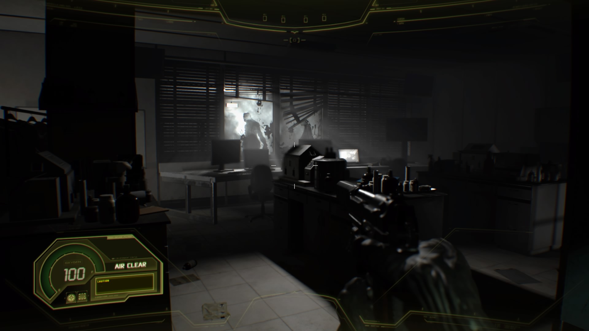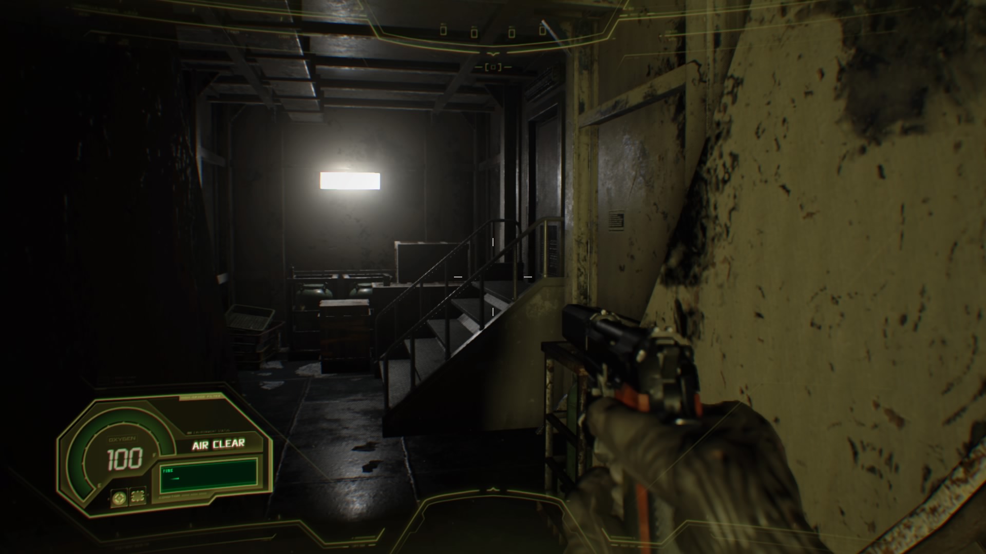 Upstairs, approach your fallen friend and you’ll get ambushed! When the room flood with chemicals, you’ll have a short supply of air to escape. Run through the room – through the door, there’s a Med Injector on the desk. Those are the new healing items for this add-on episode.