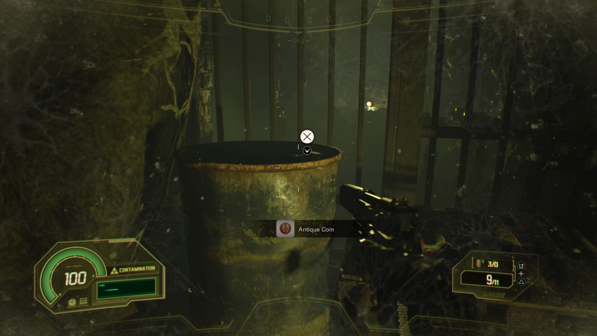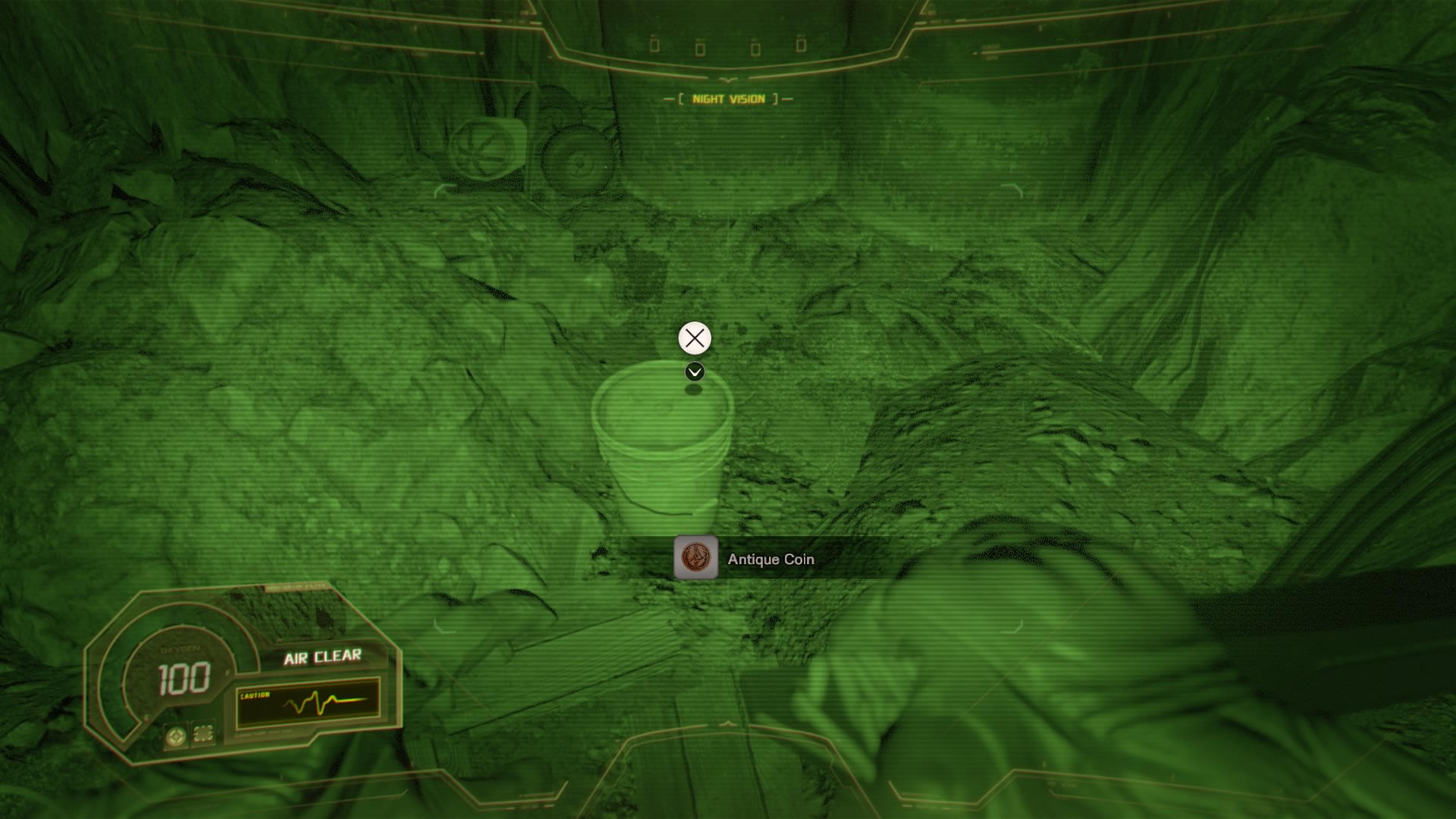 Antique Coin #3: Storage Area 1F – In the catacombs through the green shutter, you’ll have to run by a White Molded and enter a room with crates and a cart full of junk. To the left of the cart (and the crate with x2 Neuro Grenades) you can find a hidden coin.