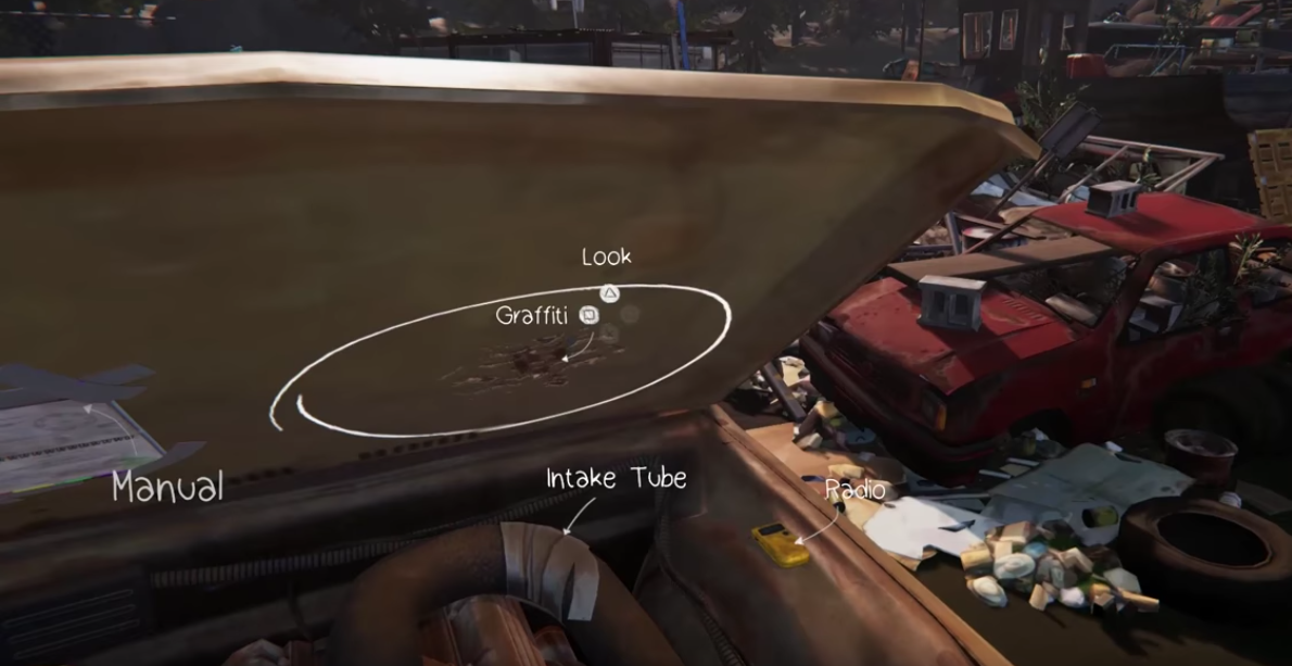Once Chloe works on the truck within the junkyard, select the fuel filter and Chloe will blow out the gunk trapped within it. Look at the gunk that’s now sticking to the inside of the truck hood to make graffiti.