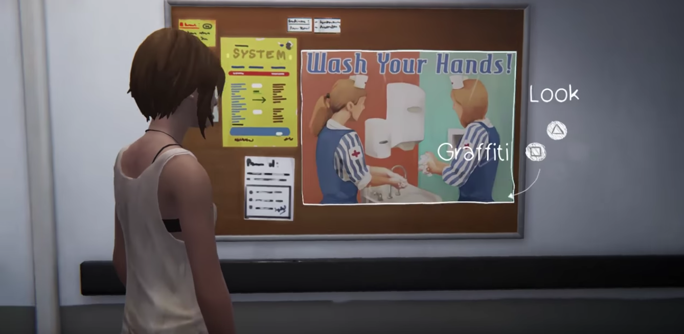 At the hospital waiting room, head to the exit door and let the cutscene play out. Afterwards, head to the exit door again and look at the nurse poster to graffiti.