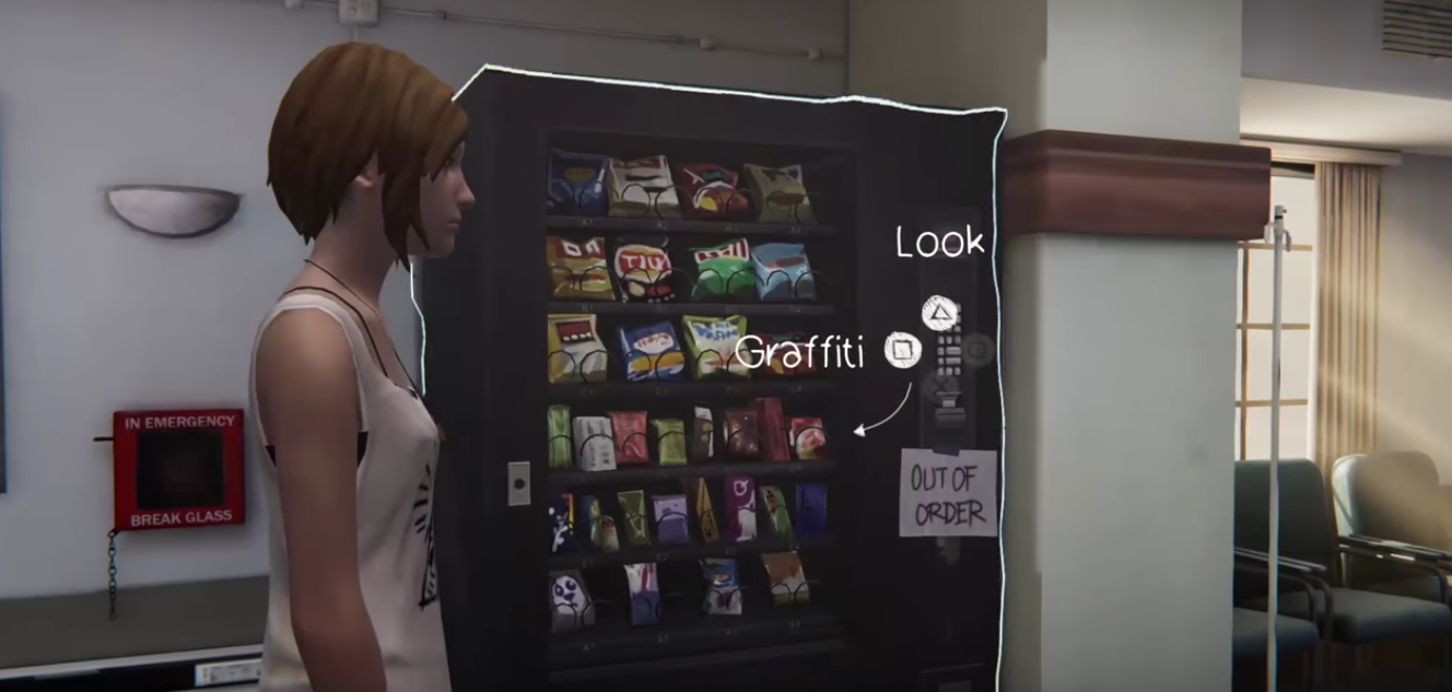 While still within the waiting room of the hospital, go to the out of order vending machine and slam it three times to free the candy bar. Afterwards, look at the vending machine again to get the new graffiti option.