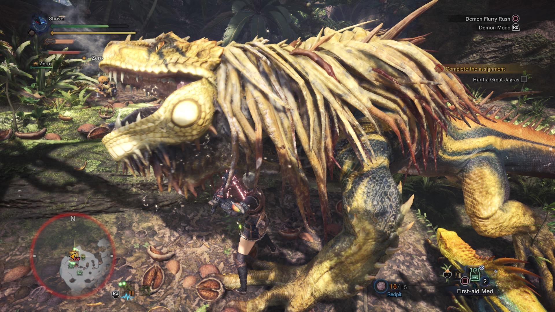 The first major monster can be an overwhelming opponent for first-time hunters, but patience will defeat this monster. Watch out for it’s bite and tail swing attacks — a quick dodge will save you, but the battle doesn’t get heated until the Jagras eats a creature.