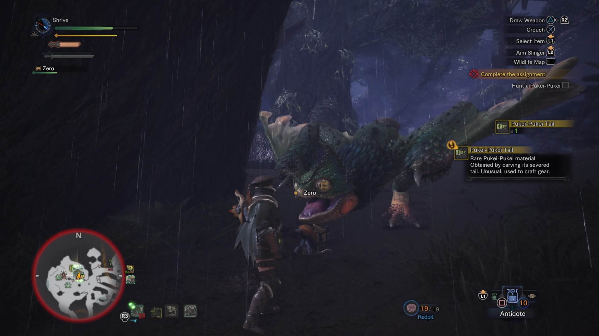 The acid-spitting Pukei-Pukei might be your first real challenge. When it’s gullet expands, expect to dodge a mouthful of purple poison. Bring plenty of Antidotes to help you survive the fight. When you’re poisoned, you’ll want to remove that ailment fast.