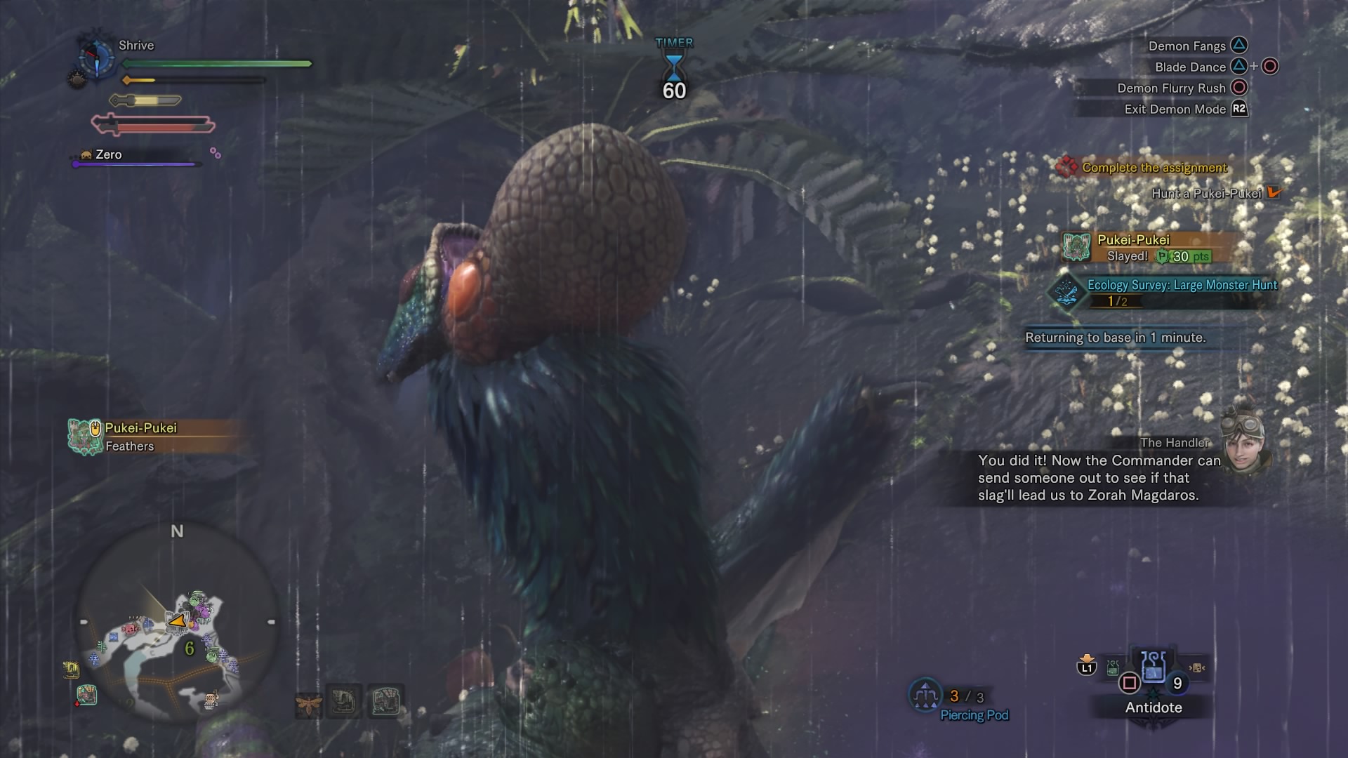 The Pukei-Pukei will use spin-attacks when you’re attacking the side of its body, and may leap up and claw multiple times with its talons. After sustaining some damage, the Pukei-Pukei will retreat by flying away. I recommend attacking Pukei-Pukei just behind the legs, especially after cutting off the tail. It’s talon attack will always miss you here.