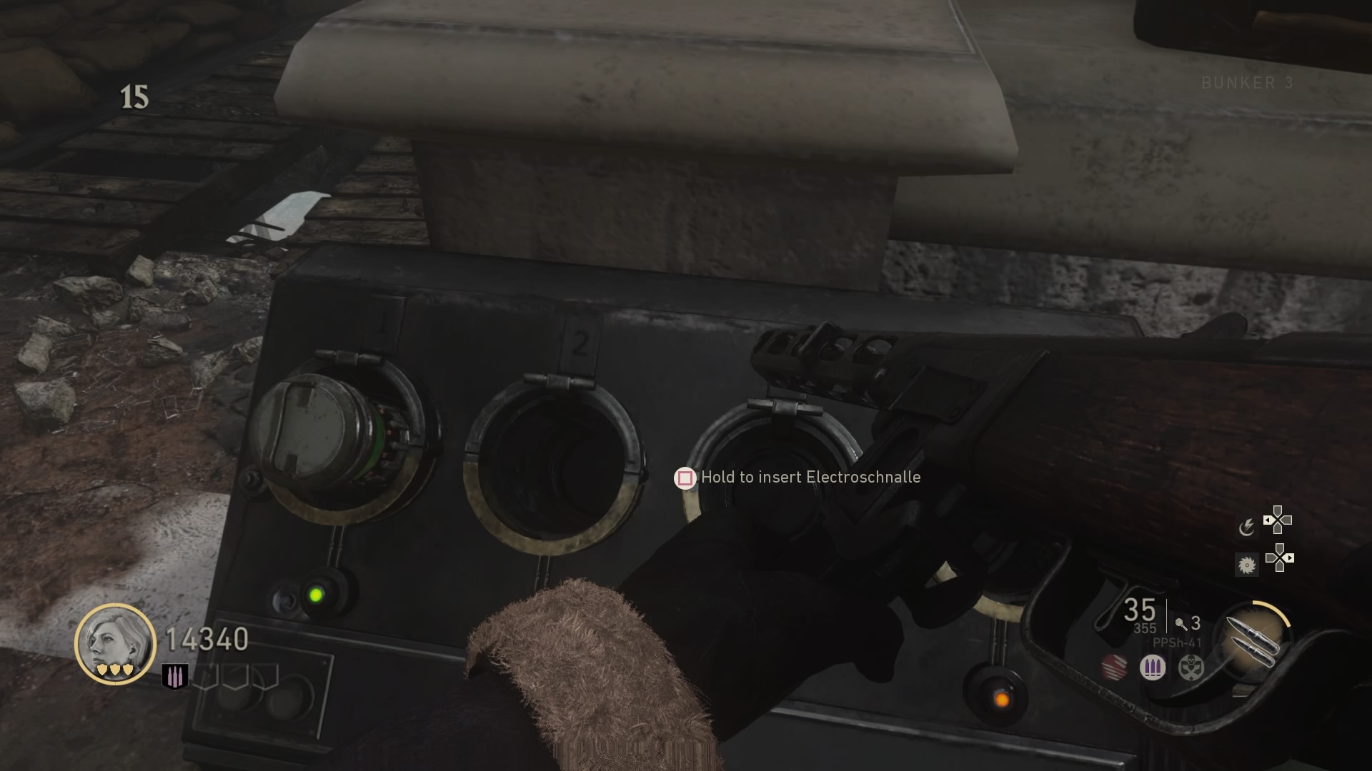With all three batteries collected, go up the stairs to Bunker 3 and insert all three batteries into the device with three circular battery slots.