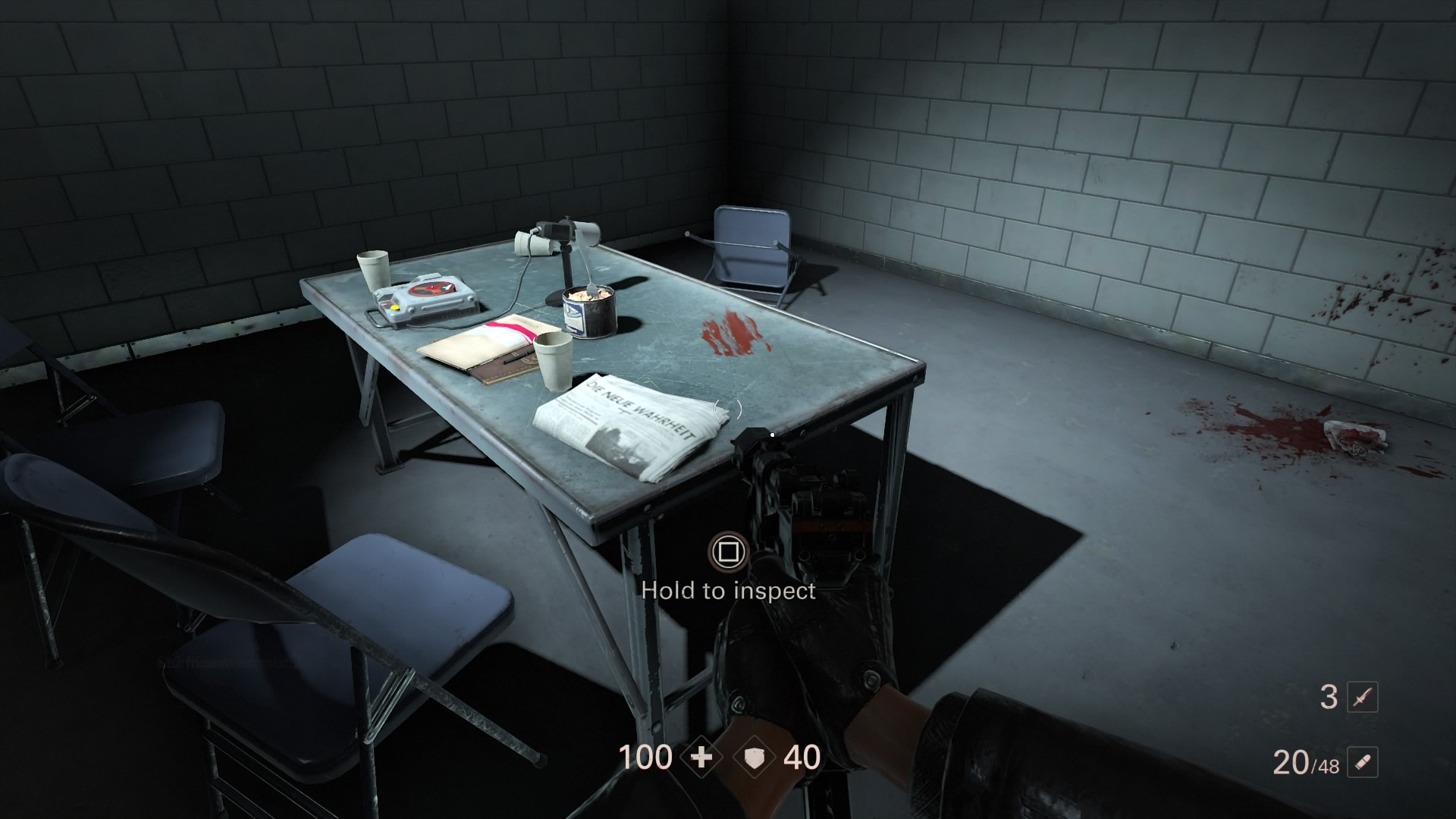- Note #6: Still in the area with the first officer, enter the interrogation room. You can break the glass or crawl through the door. The newspaper is on the table.