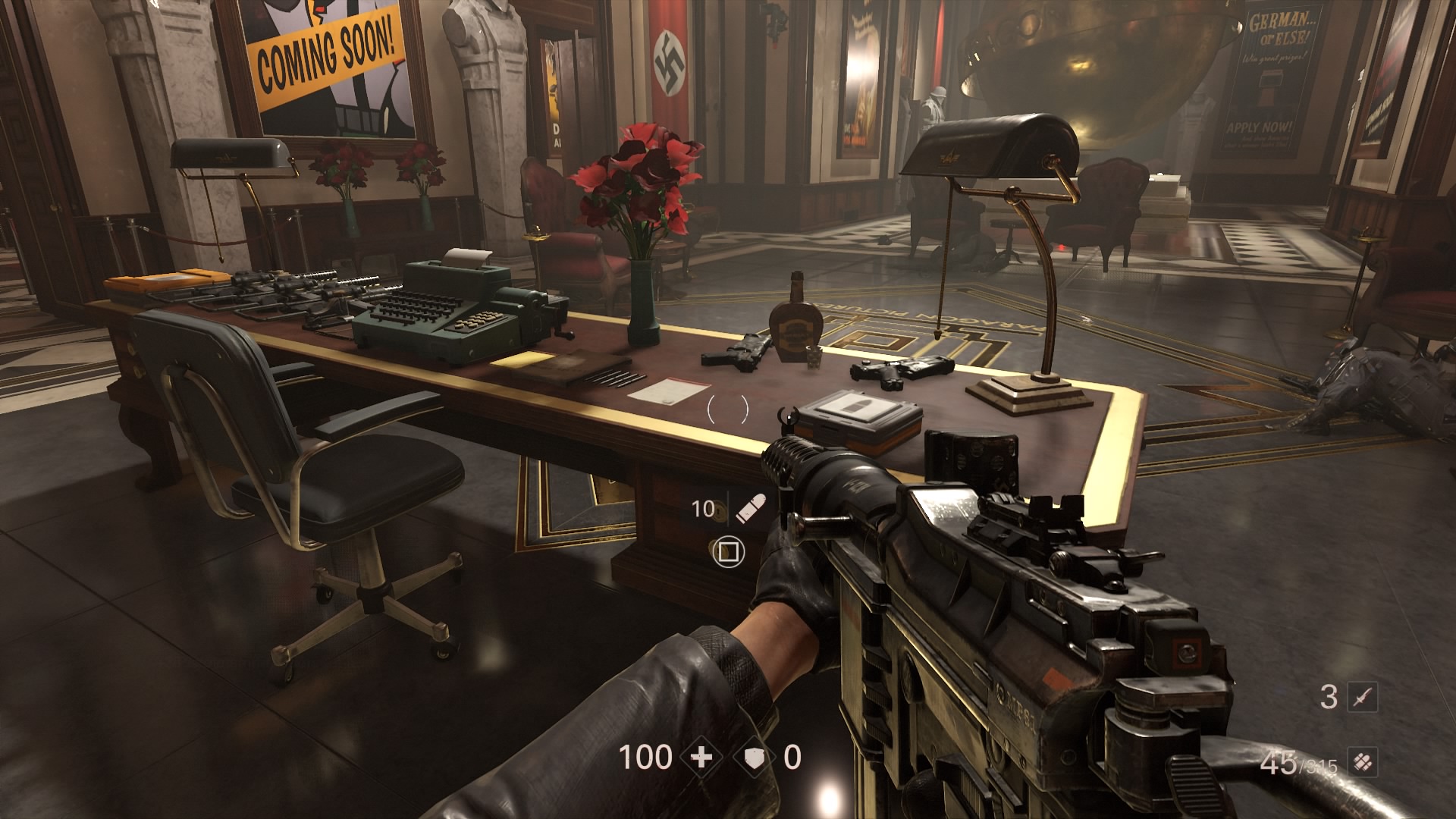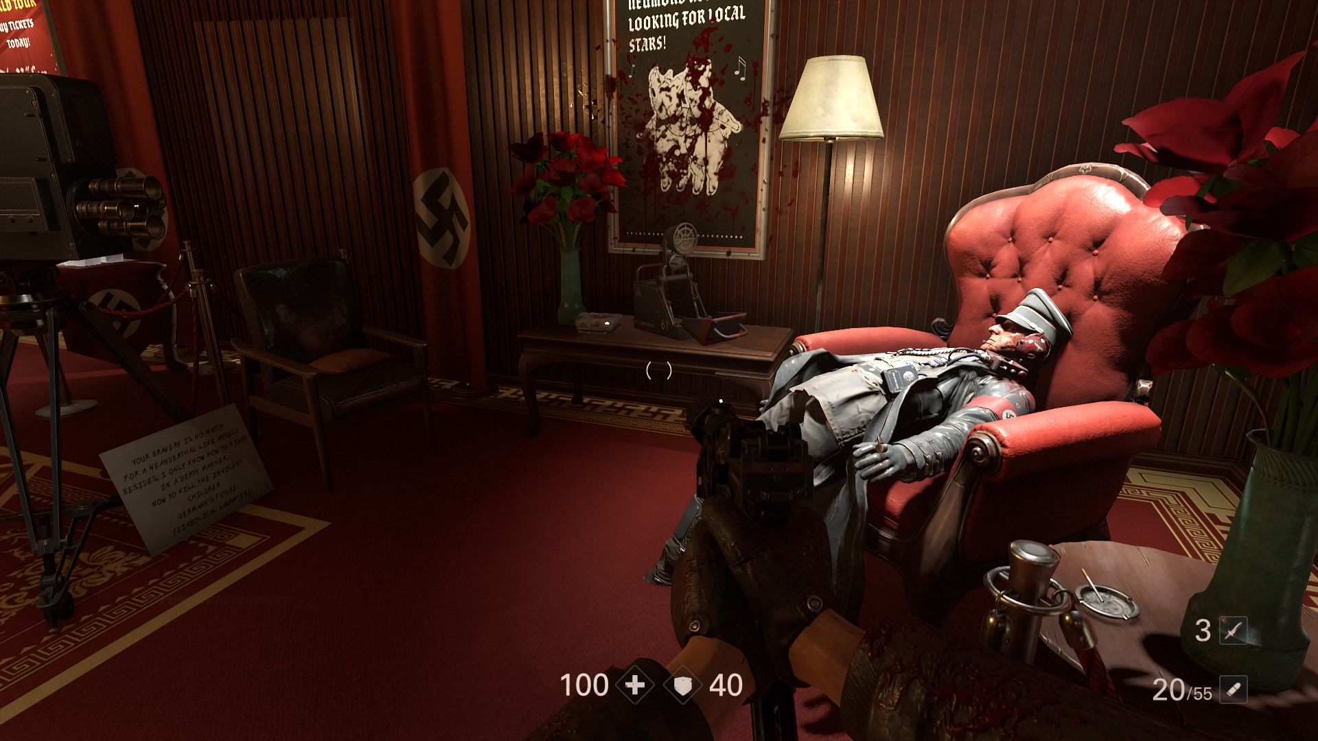 Show business isn’t what it’s cracked up to be in Wolfenstein 2: The New Colossus. In the second DLC chapter, you play as Agent Silent Death, and one of your targets is an American collaborator, busy producing propaganda for the Nazi war machine. Plenty has changed in the alternate reality of Wolfenstein 2, and you can get a glimpse into the background of the various locations (and assassination targets) with notes, e-recordings, and newspapers.