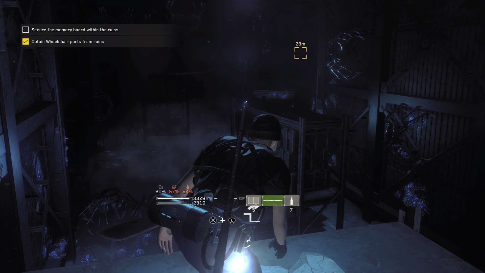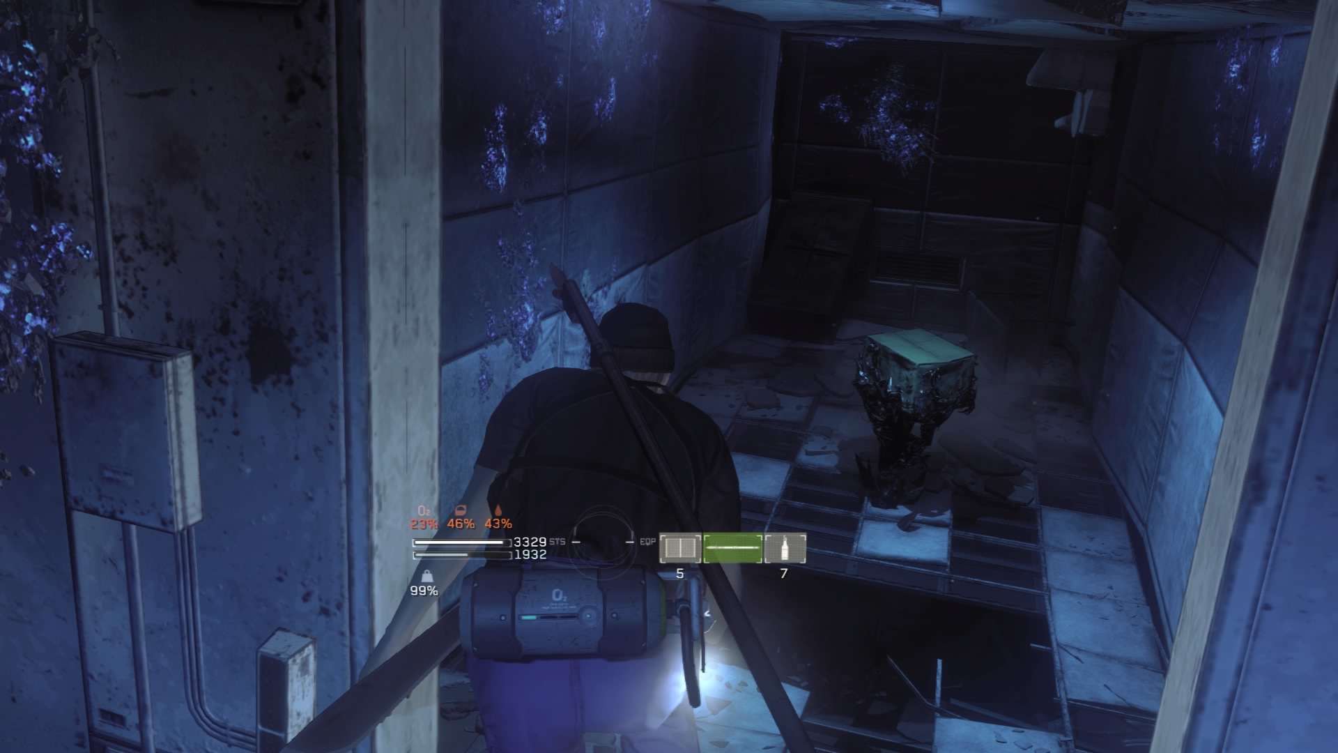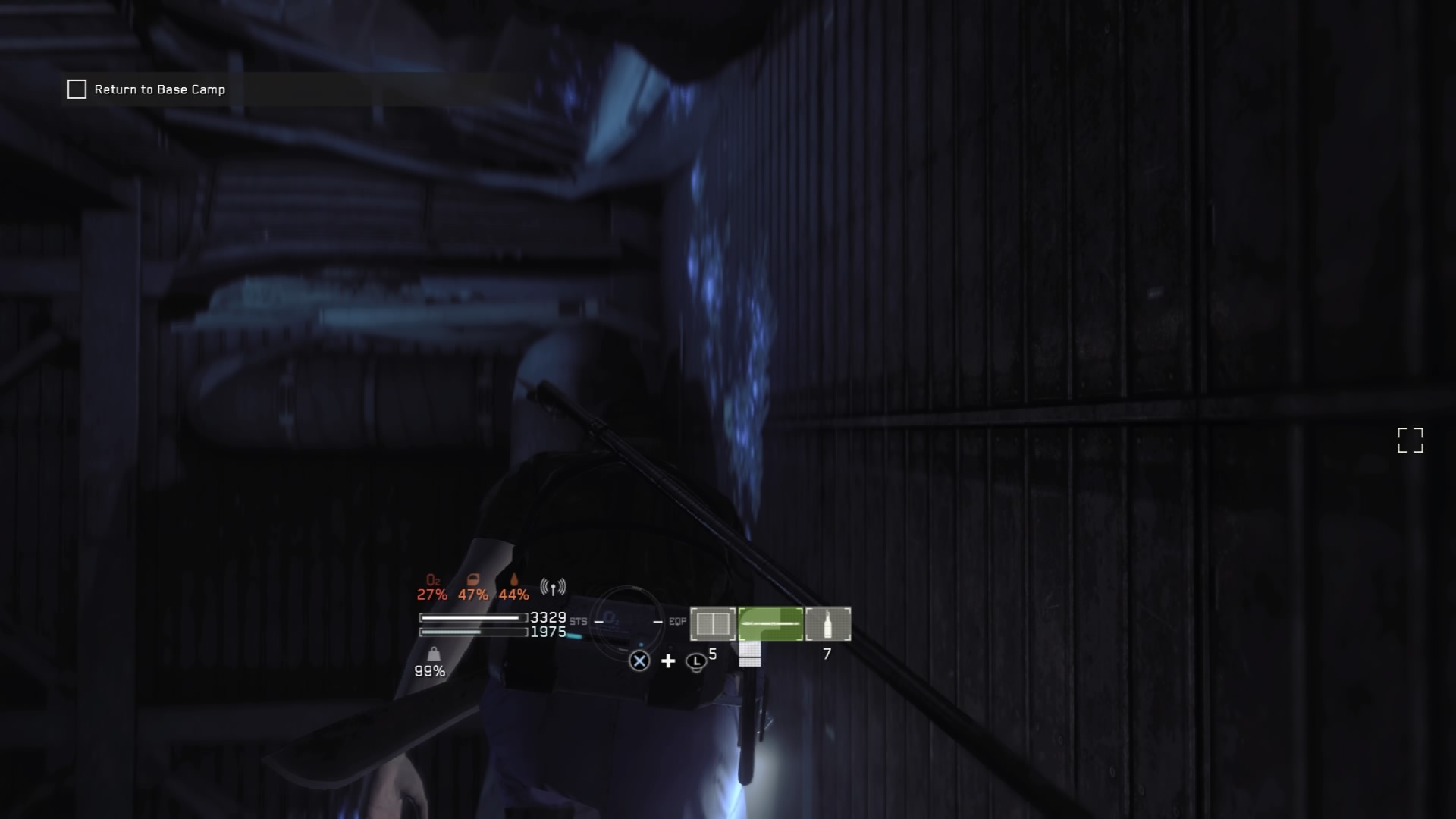 In the first hallway, don’t miss the large container in a left room. From the starting hallway, find the debris pile. Climb through and continue down the one-way path. Stab any bodies you find. Down below, in the large cargo room, you’ll encounter a new enemy – crawlers. These disgusting giant spiders cover the walls and floor. Like the Watchers, it’s safe to run straight through the room and get to the scaffolding on the right.