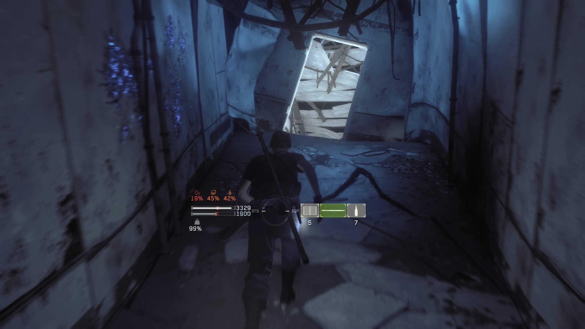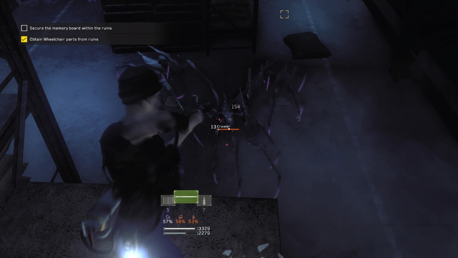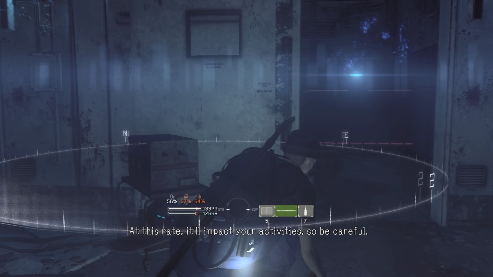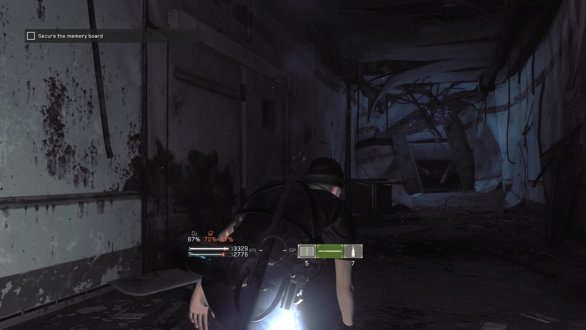 In the first hallway, don’t miss the large container in a left room. From the starting hallway, find the debris pile. Climb through and continue down the one-way path. Stab any bodies you find. Down below, in the large cargo room, you’ll encounter a new enemy – crawlers. These disgusting giant spiders cover the walls and floor. Like the Watchers, it’s safe to run straight through the room and get to the scaffolding on the right.