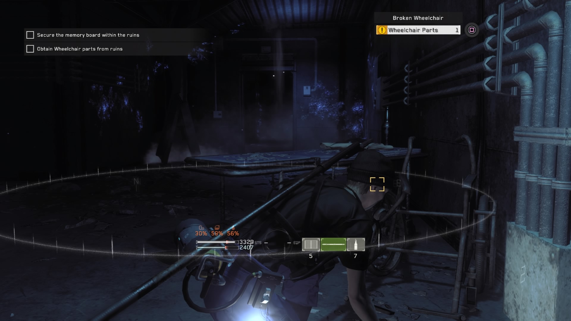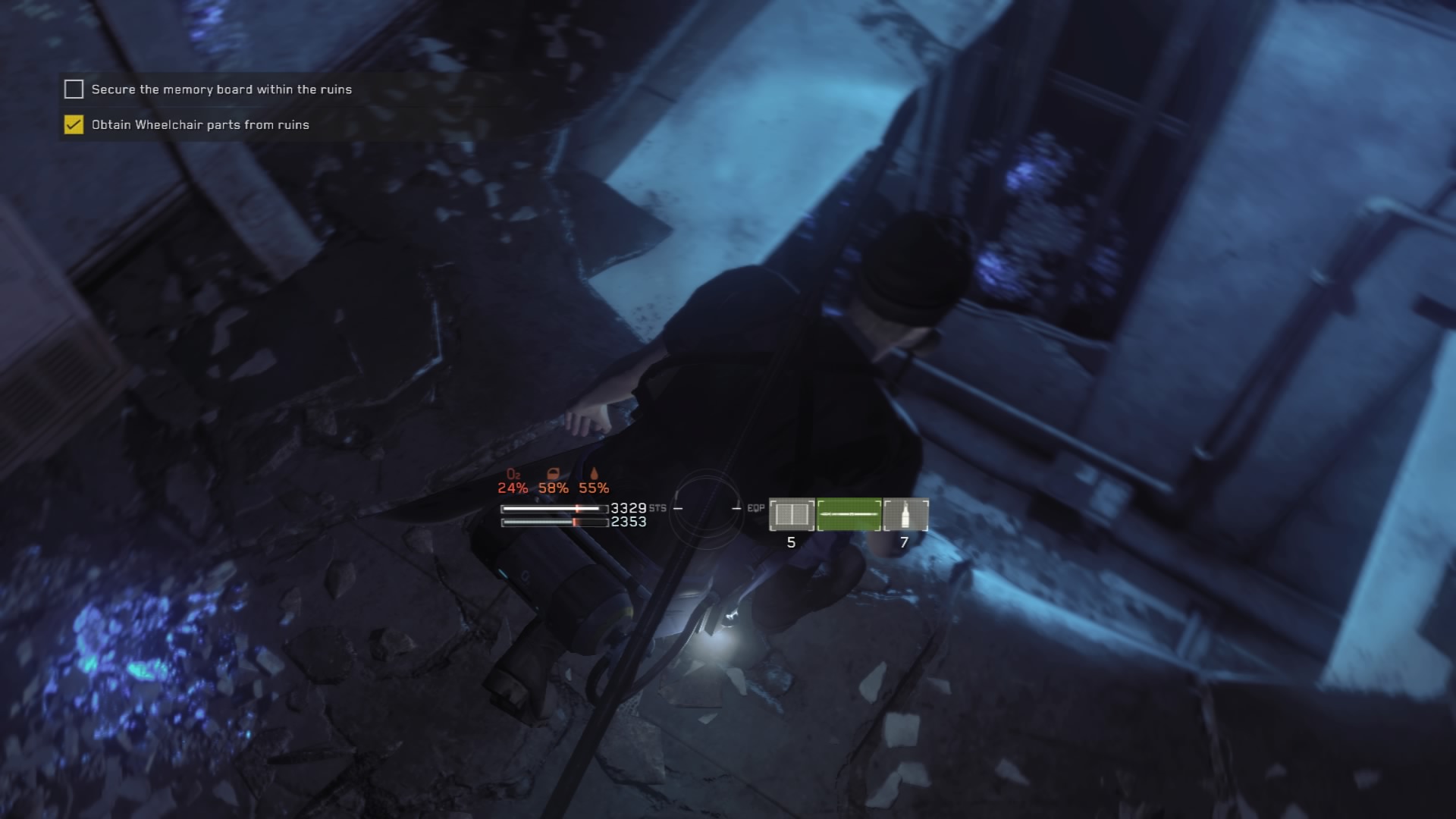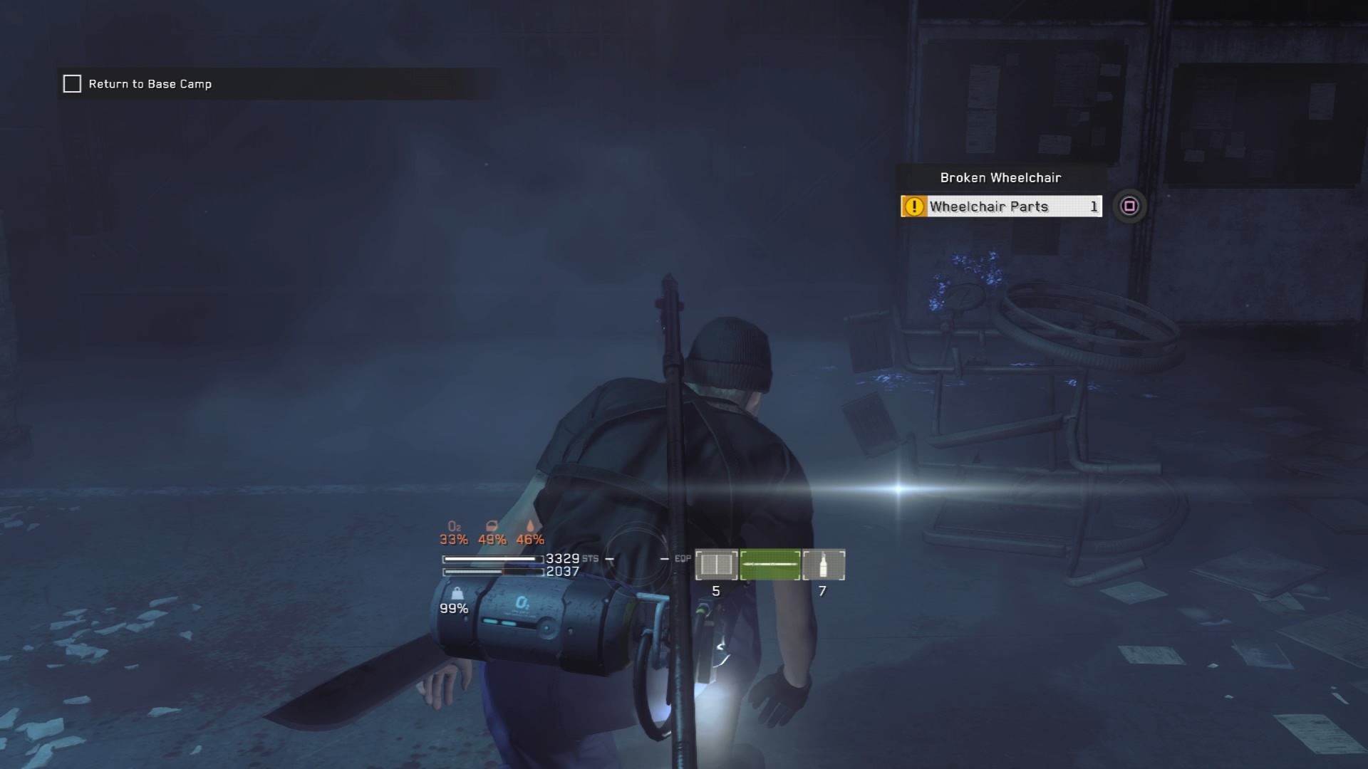 While you’re in the ruins, you’ll want to grab wheelchair parts. You’ll find one set of parts in the medical hallway before reaching the first warehouse. After climbing the ladder into a second warehouse, you can find a second wheelchair. Grab one of these before leaving! Chris, the disabled kid you rescued earlier, needs his wheelchair to help out around the Base Camp. Out through the rooftop, sprint back to your Transporter and get back to base.