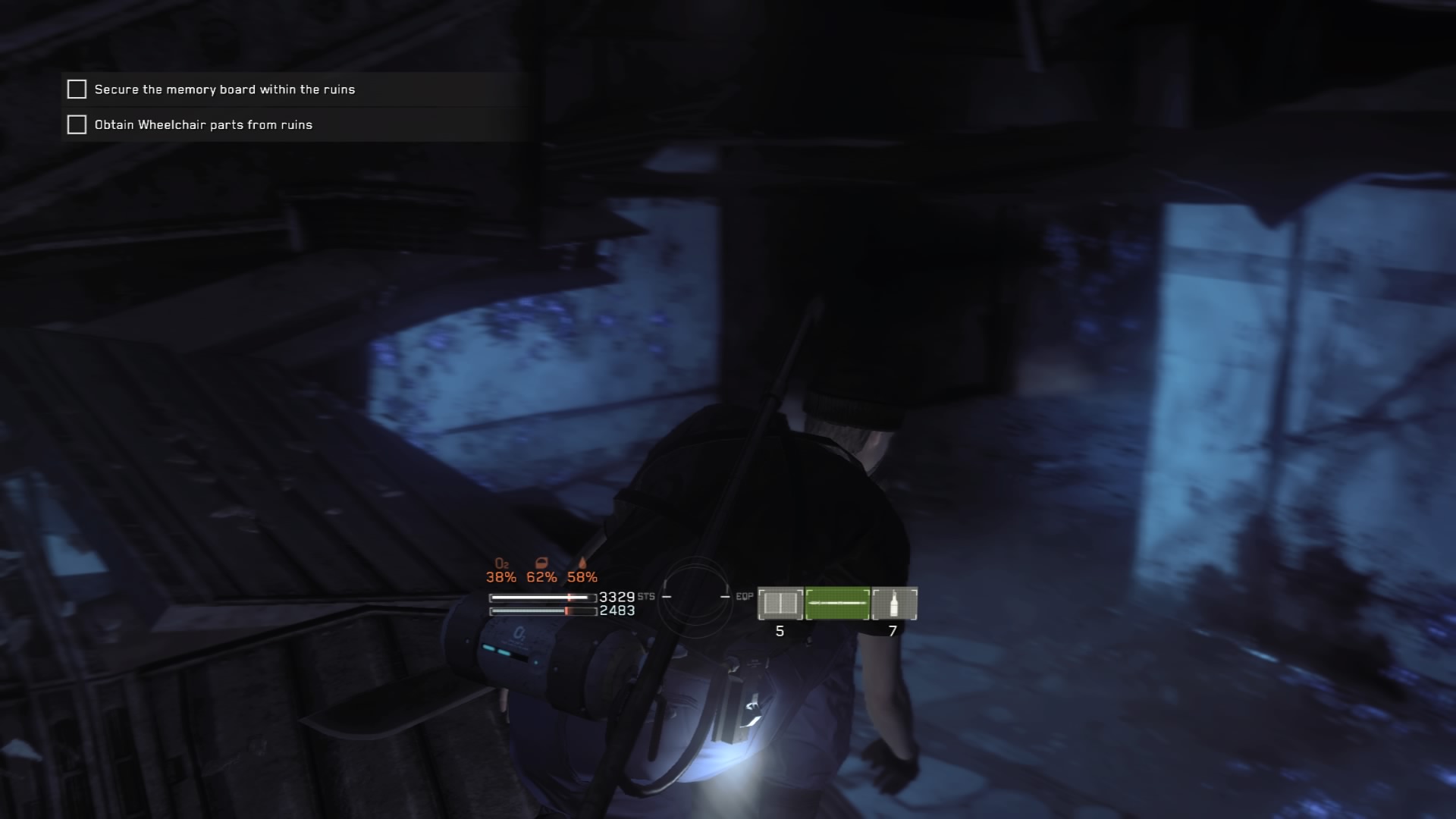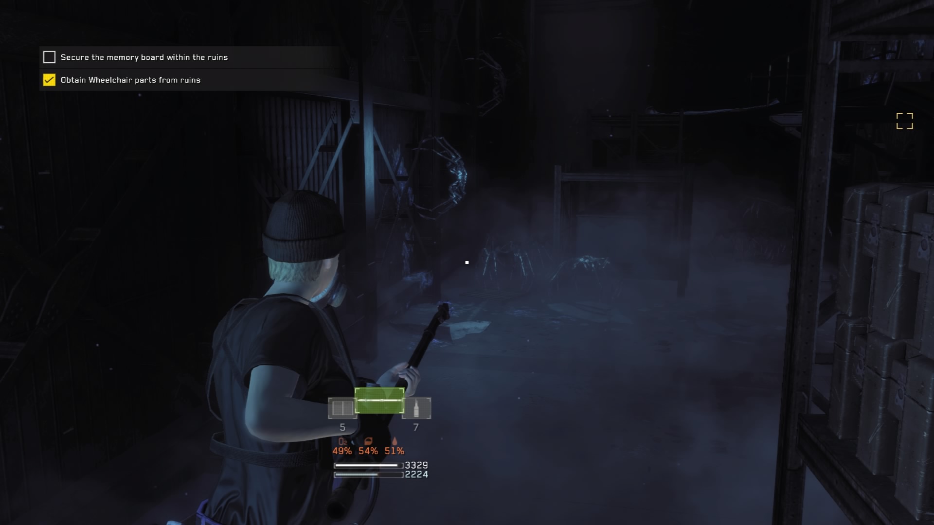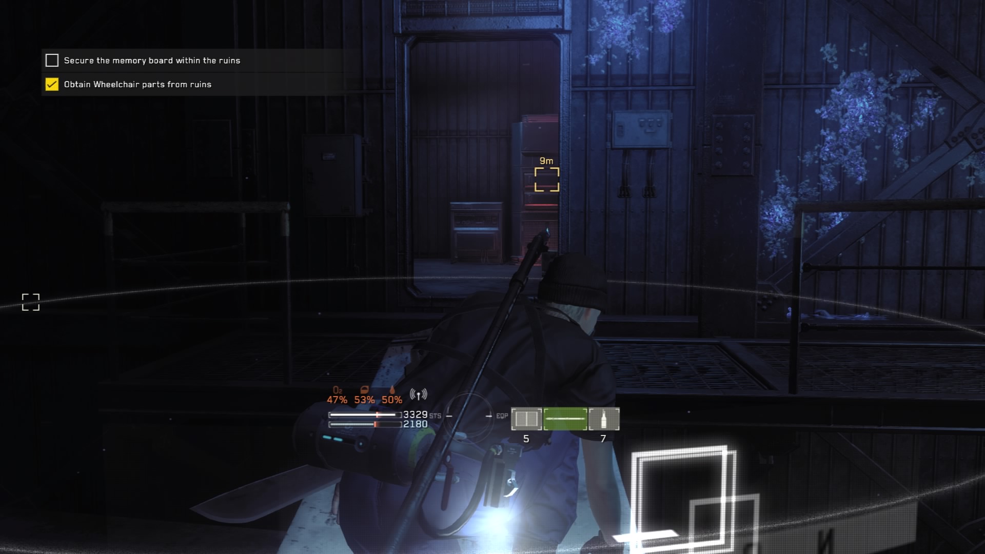 While you’re in the ruins, you’ll want to grab wheelchair parts. You’ll find one set of parts in the medical hallway before reaching the first warehouse. After climbing the ladder into a second warehouse, you can find a second wheelchair. Grab one of these before leaving! Chris, the disabled kid you rescued earlier, needs his wheelchair to help out around the Base Camp. Out through the rooftop, sprint back to your Transporter and get back to base.