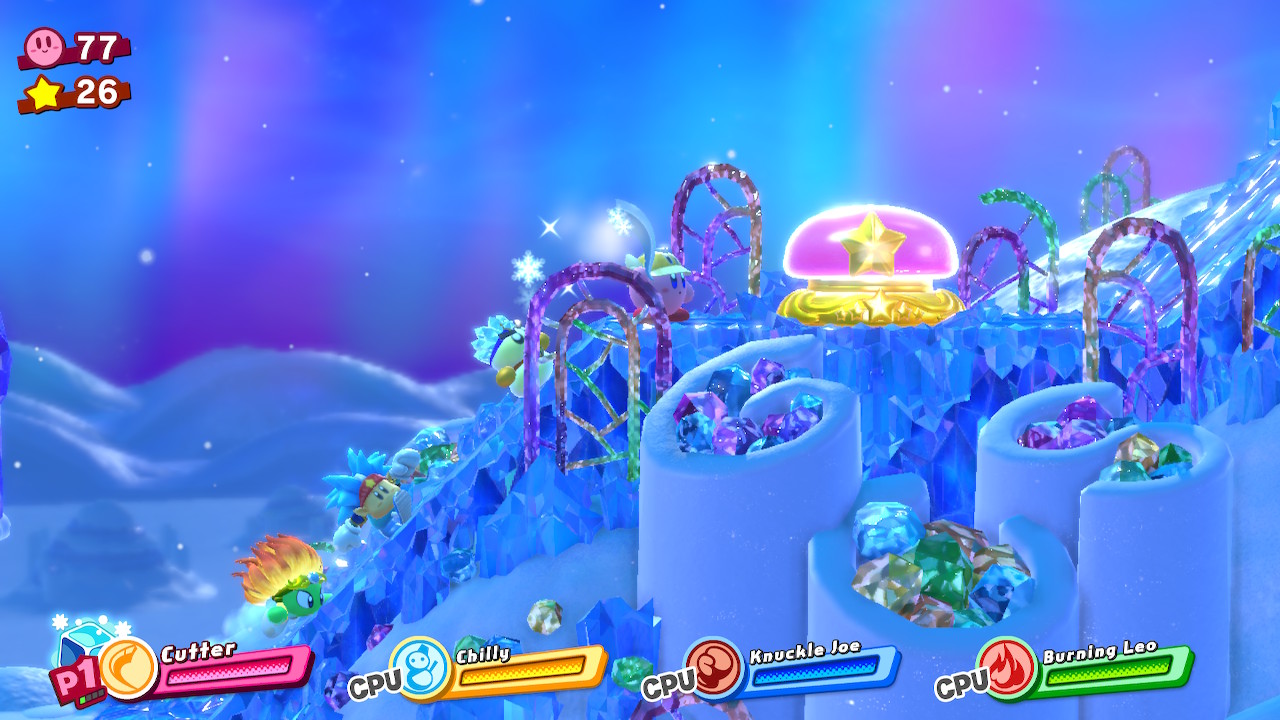 - 4-4: Planet Frostak – Enter the second bonus room with Cutter + Ice, then hold up and throw a charged cutter blade up into the wind tunnels. If charged, the blade will bounce (keep holding up!) into the burning chain, clearing the path for Kirby to reach the button.