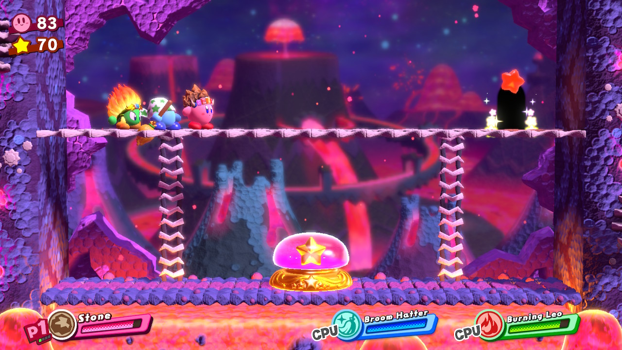 - 4-6: Star Lavadom – In the third room, collect a Rock Copy Ability and hit the stump with any combo + Stone to slide Kirby into the wooden stump, lowering the platform to reveal a bonus room with a big button.