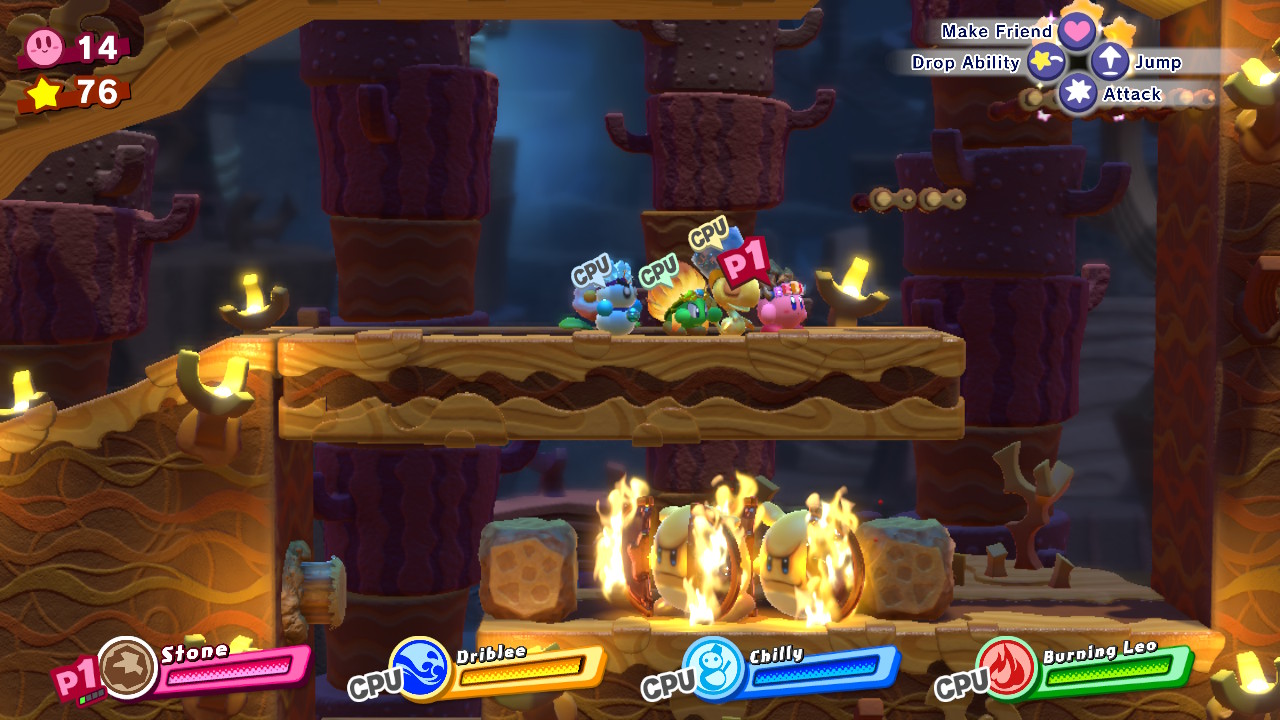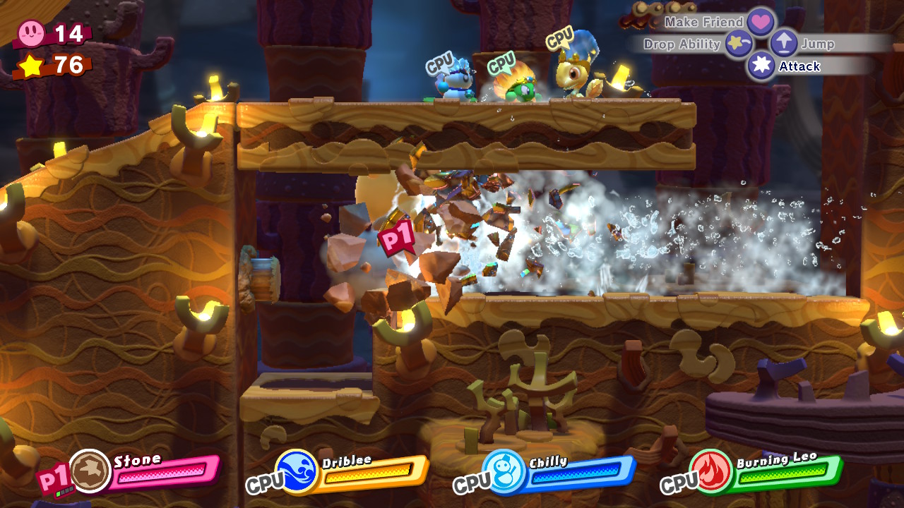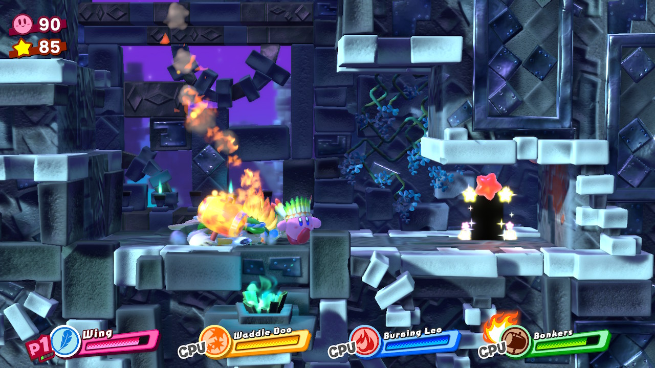 - 1-2: Donut Dome – Complete the first long, ramped room where you get the Stone copy ability. Ahead, you’ll reach another room, and another yellow star door. Before leaving, smash through the burning enemies using a Stone + Ice / Water Friend Ability. Any Stone element combo will work. Hit the button below to lower the platform to the picture piece.