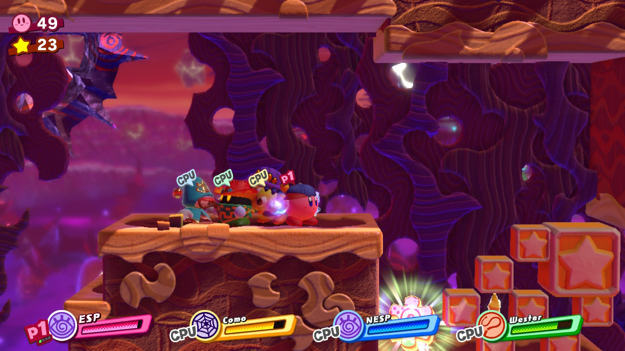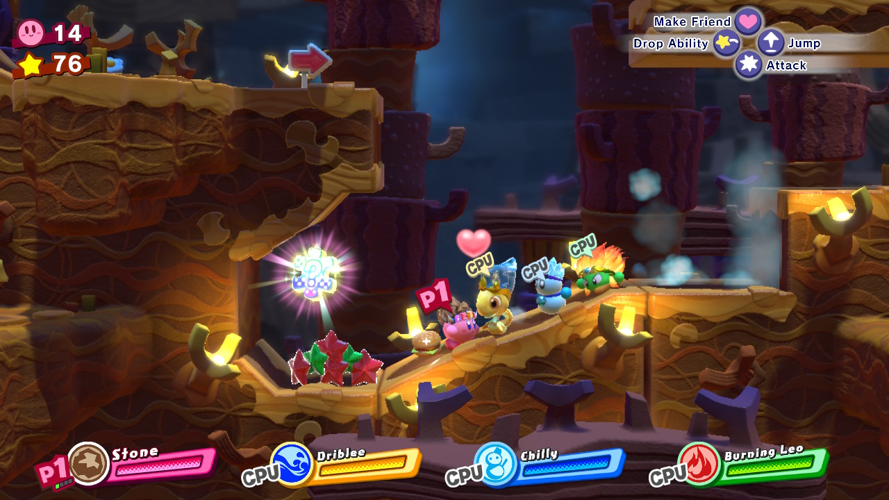 - 4-3: Planet Caverna – In the lower-right corner, grab a Fighter friend / Copy Ability and use the Friend Throw ability to smash through the stone blocks. At the end, use a Painter Copy Ability to paint the canvas and collect a picture piece.
