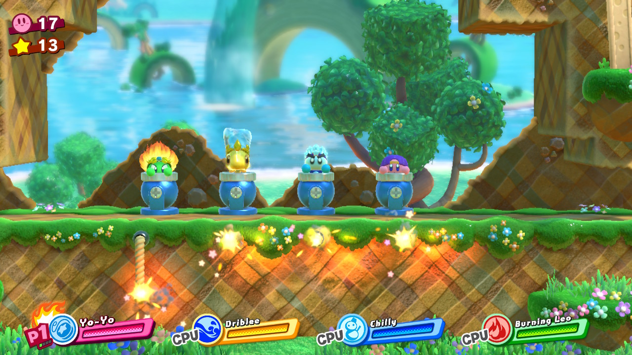 - 4-EX4: Extra Planet O – While climbing the high ladder between puzzle rooms, you’ll reach an area with a Zap conduit to the right, underneath giant explosive bundles. Grab an electricity enemy as a friend, then combine Fire + Yoyo to hit the fuse through the wire-controlled door. When the TNT goes off, search all the chests to get the final, final picture piece!