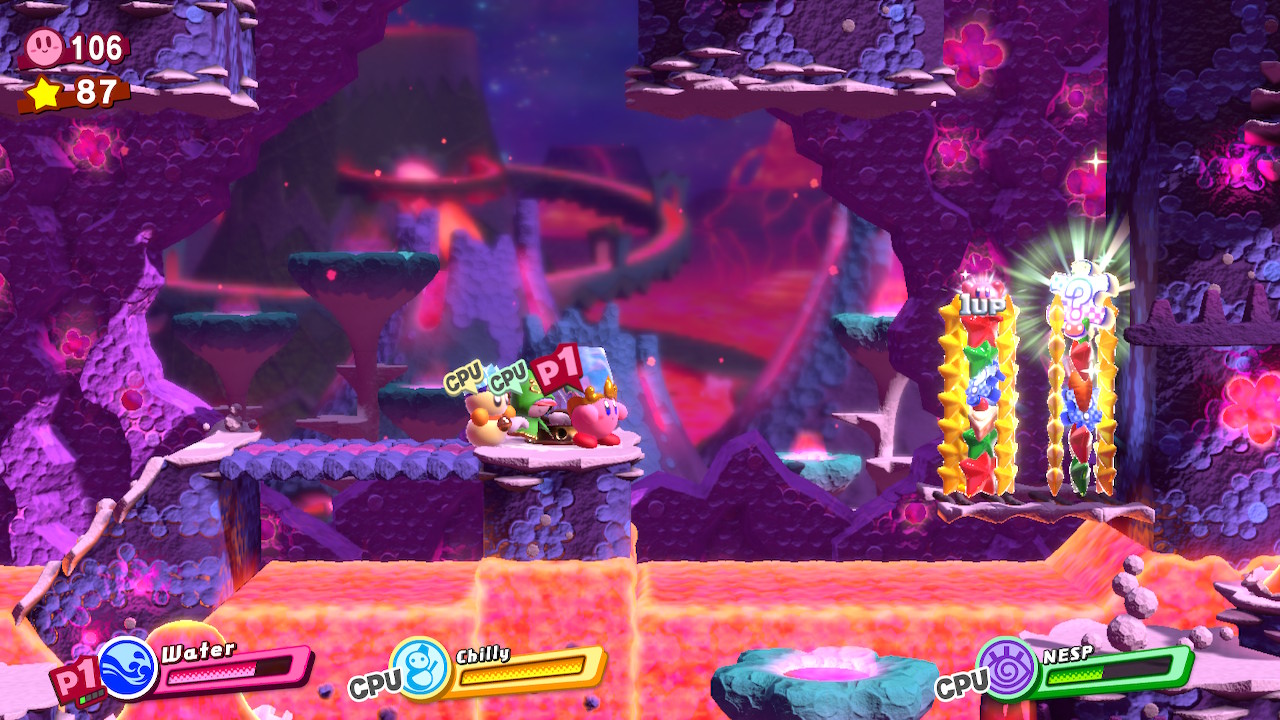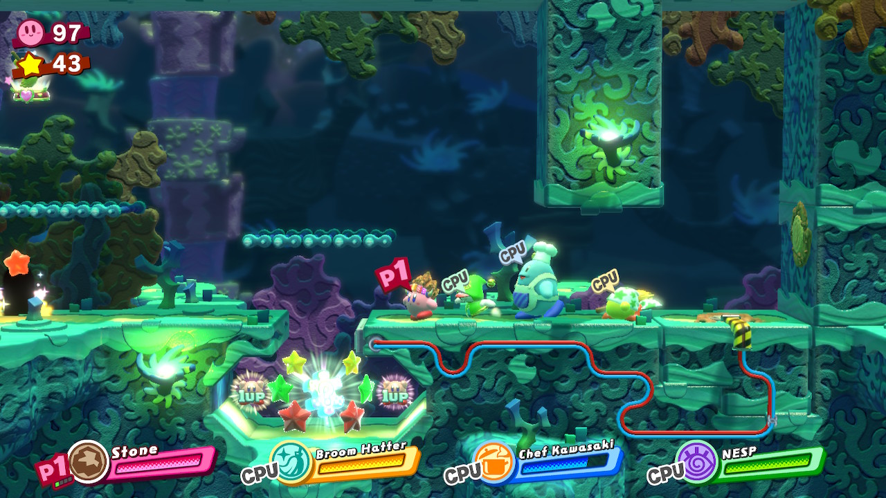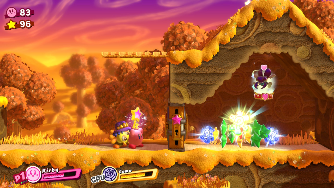 - 1-EX: Extra Éclair – Later in the level, you’ll reach a long forest with hanging nuts on trees. At the end of the room, there’s a locked door. The key is located in the previous forest on a tall tree. Grab a Sword ability and cut down the high, hanging nut. Through the door, pull down the cork with four friends and then complete the bonus room.