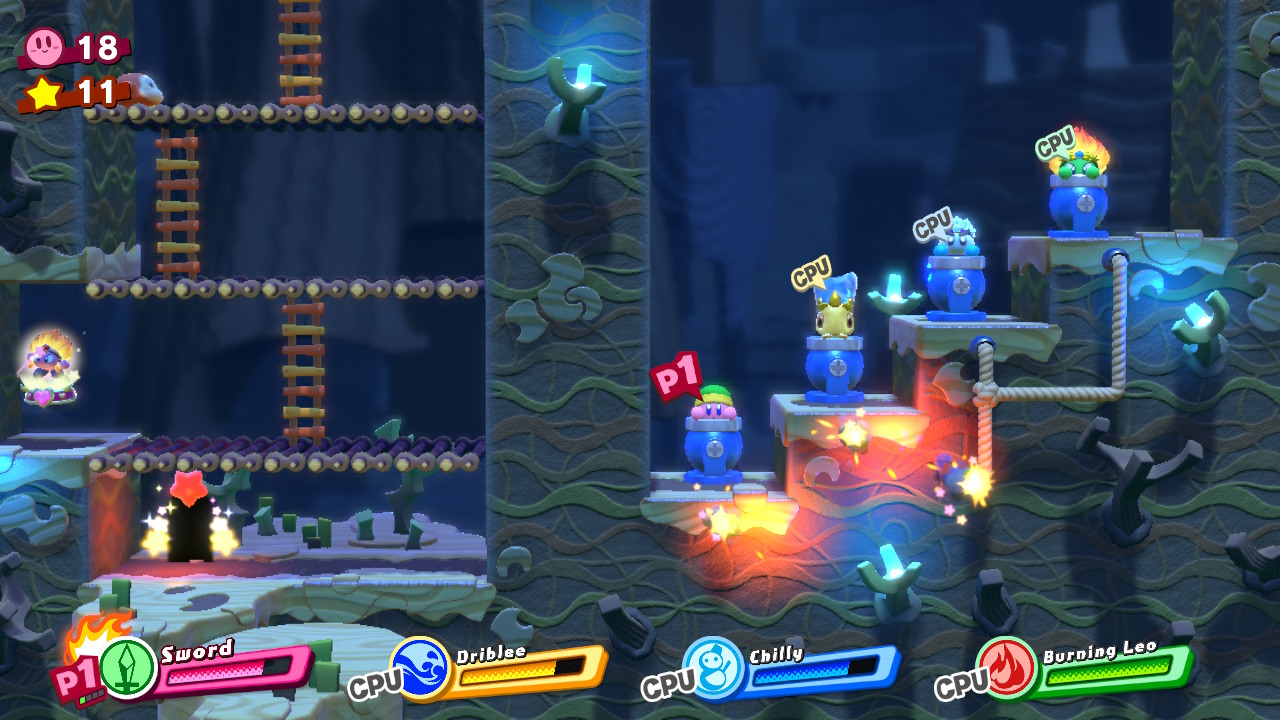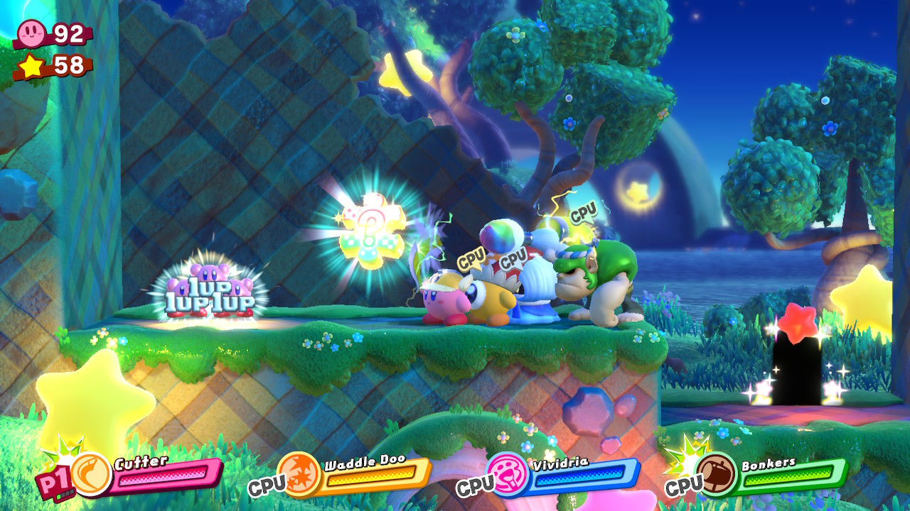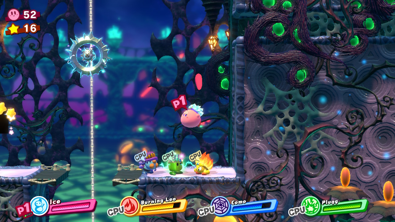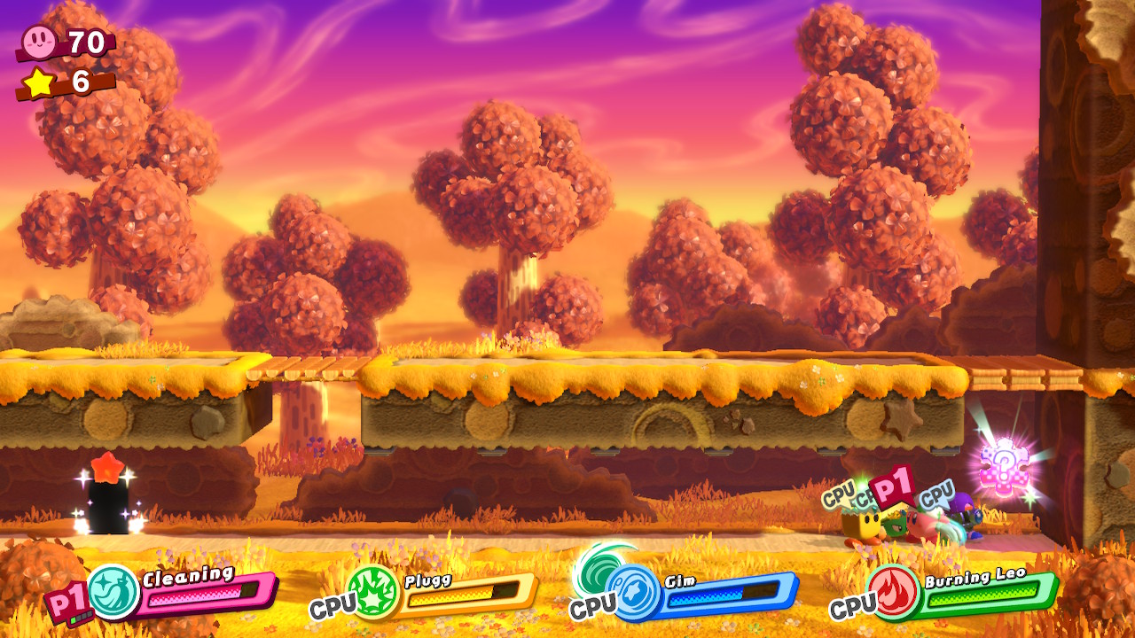 - 1-EX: Extra Éclair – Later in the level, you’ll reach a long forest with hanging nuts on trees. At the end of the room, there’s a locked door. The key is located in the previous forest on a tall tree. Grab a Sword ability and cut down the high, hanging nut. Through the door, pull down the cork with four friends and then complete the bonus room.